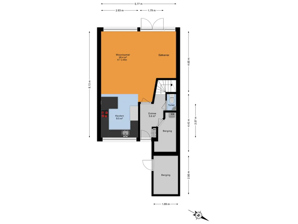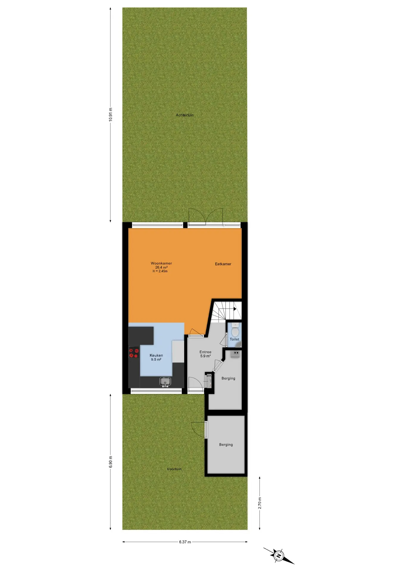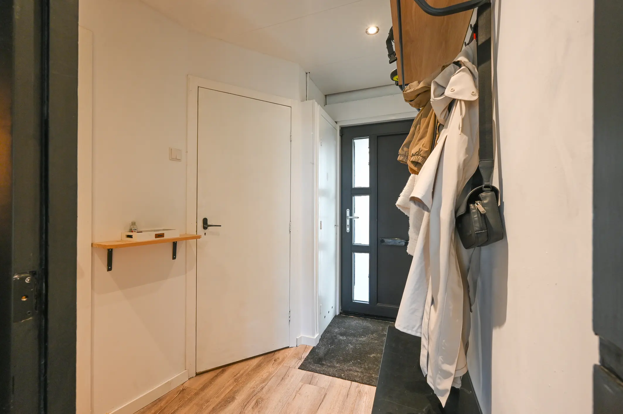 Via de entree bereikt u de hal met ruimte voor jassen en schoenen, een inpandige berging, de meterkast, cv opstelruimte en een keurig betegeld toilet.