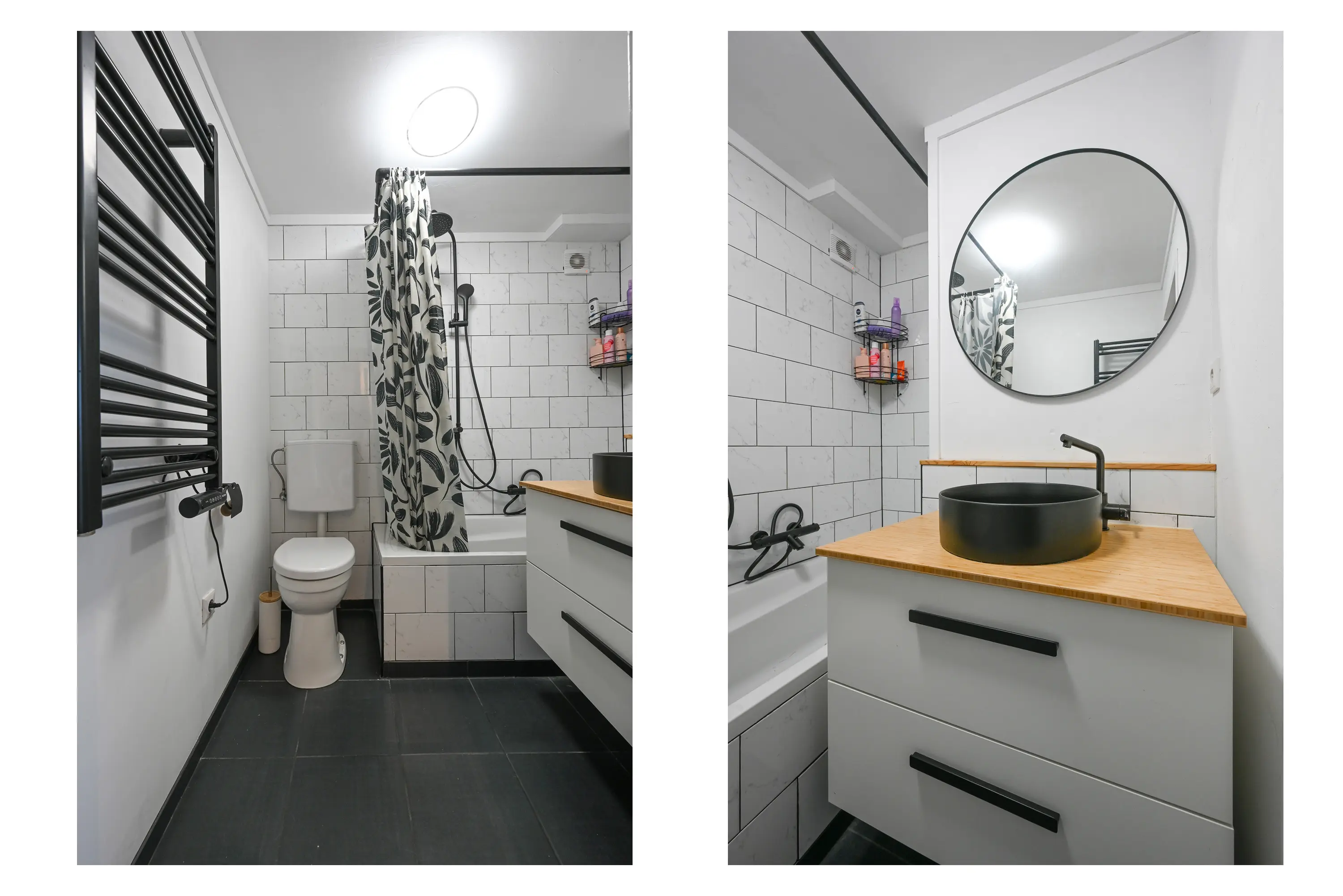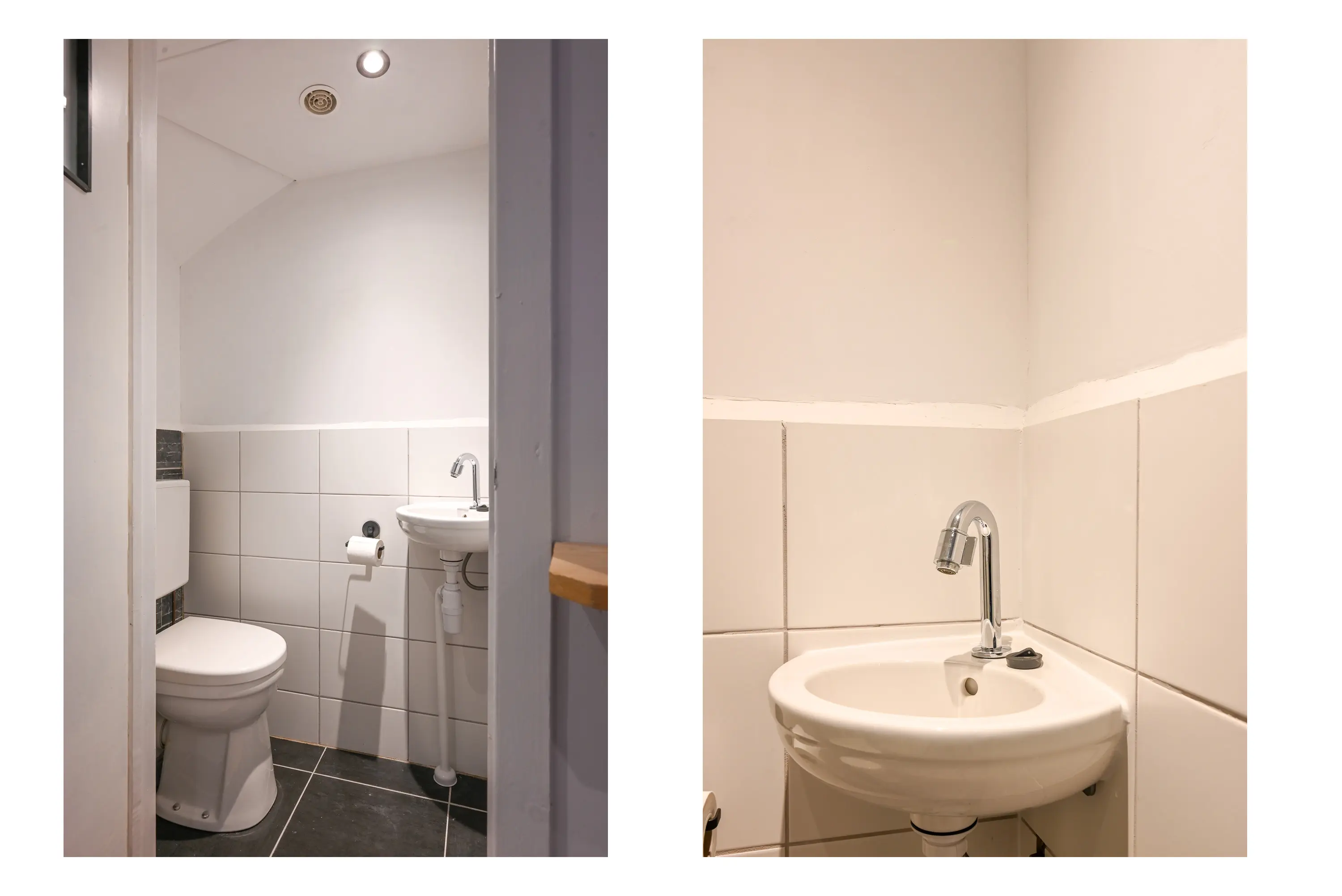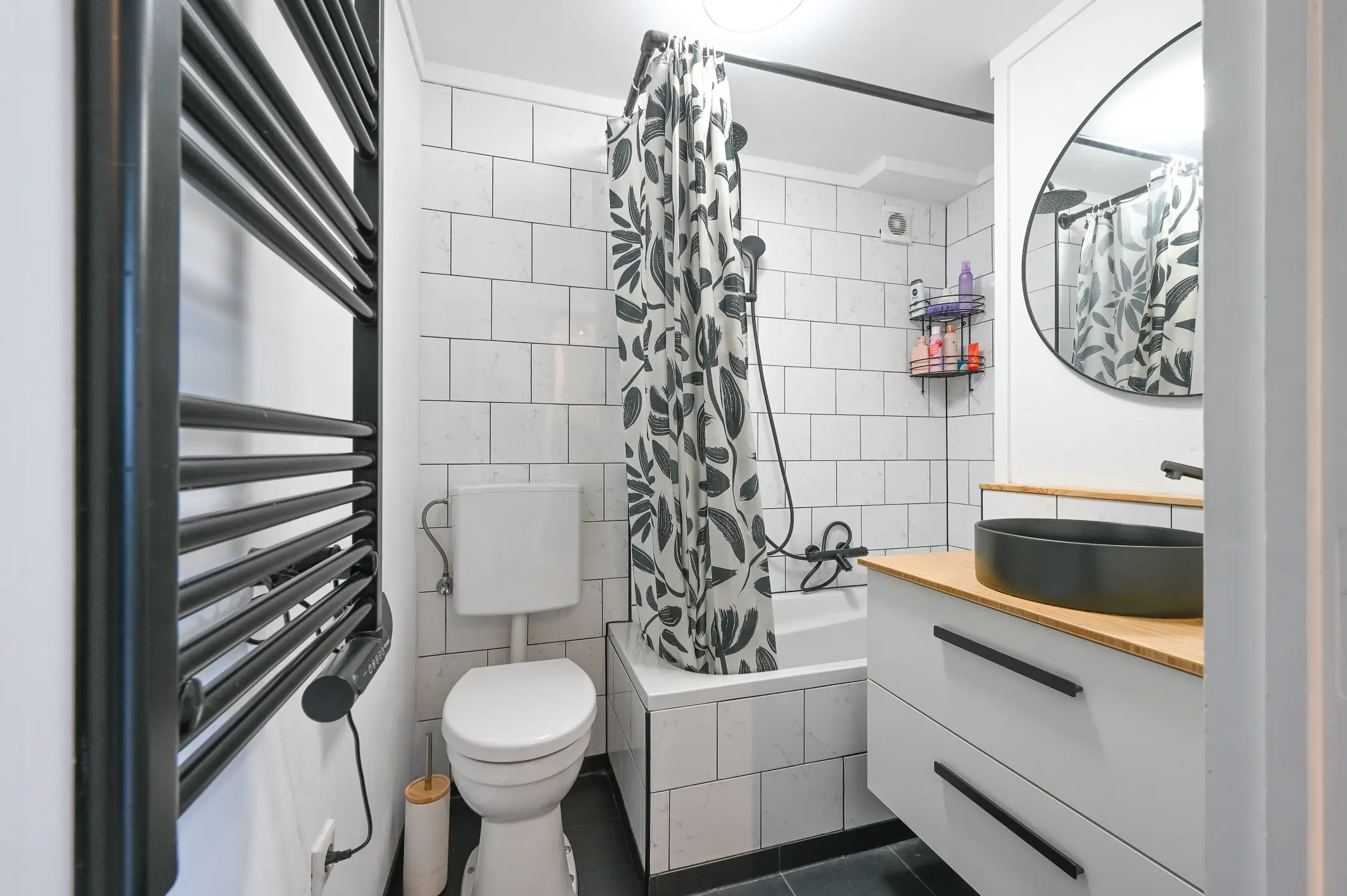 De badkamer is volledig betegeld en beschikt over een bad/douchecombinatie, toilet en wastafelmeubel — alles netjes en verzorgd uitgevoerd.
