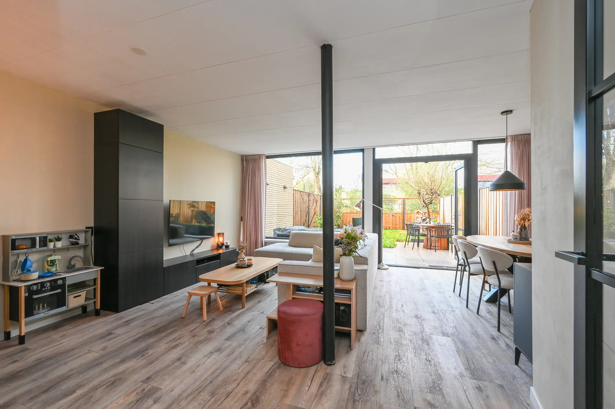 De woonkamer voelt direct ruim en licht aan dankzij de grote raampartijen en de strakke afwerking. De pvc-vloer met vloerverwarming zorgt voor comfort en een moderne uitstraling, terwijl de glad gestucte wanden een neutrale basis bieden voor iedere interieurstijl.
