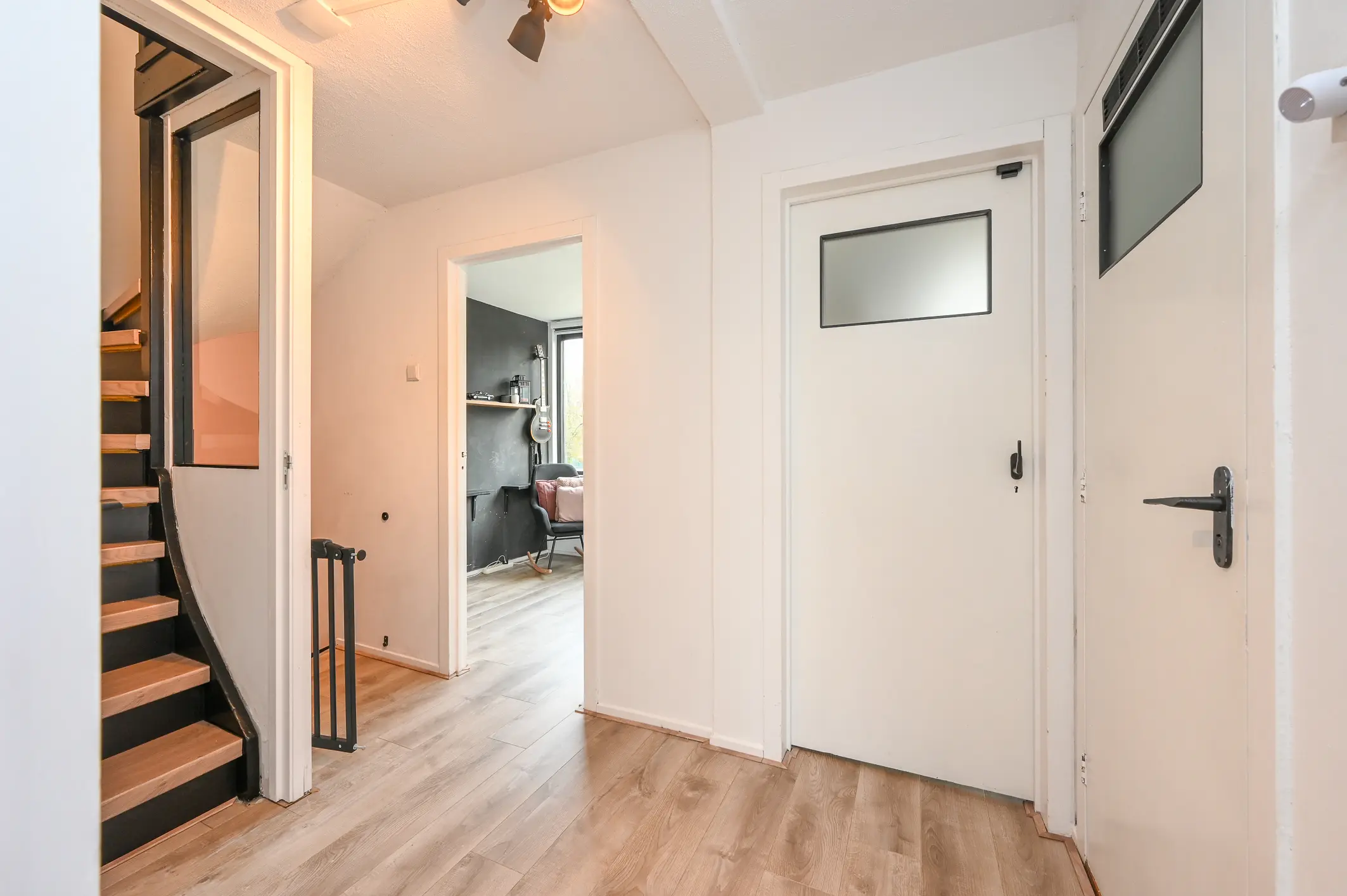 Op de overloop bevinden zich de aansluitingen voor de wasmachine en droger, en extra bergruimte is te vinden op de vliering.