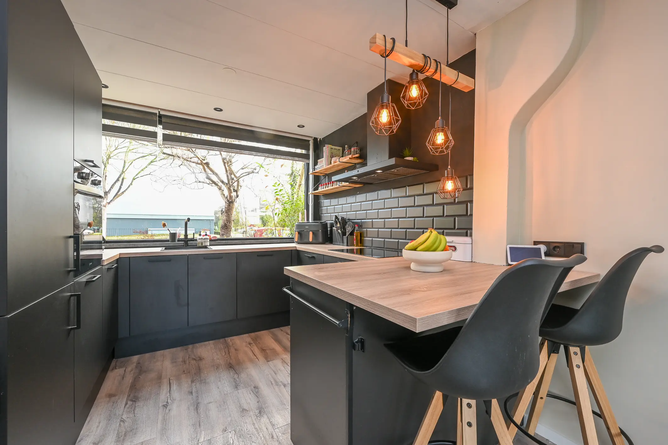 Aan de voorzijde bevindt zich de open keuken, die in 2021 volledig is vernieuwd en uitgevoerd in een stijlvol zwart design met inbouwapparatuur. De keuken is voorzien van een inductiekookplaat, afzuigkap, oven, koel-/vriescombinatie, vaatwasser en een kokendwaterkraan — alles wat u nodig heeft voor modern kookgemak.