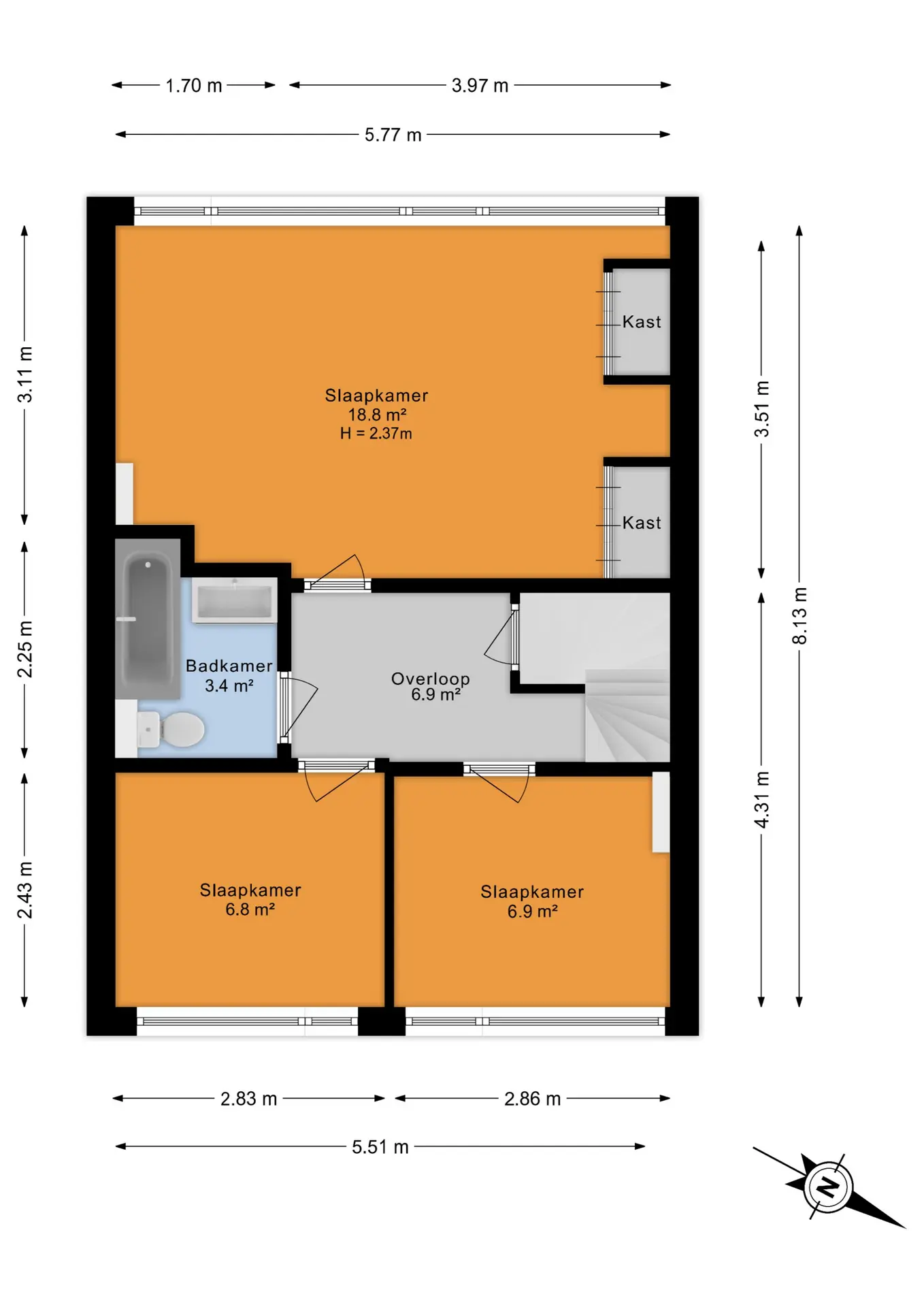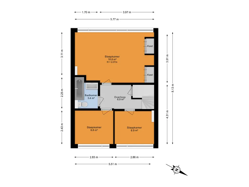 De eerste verdieping telt drie ruime slaapkamers, allen voorzien van kunststof kozijnen met horren en een laminaatvloer. De master bedroom aan de achterzijde is bijzonder royaal van formaat.