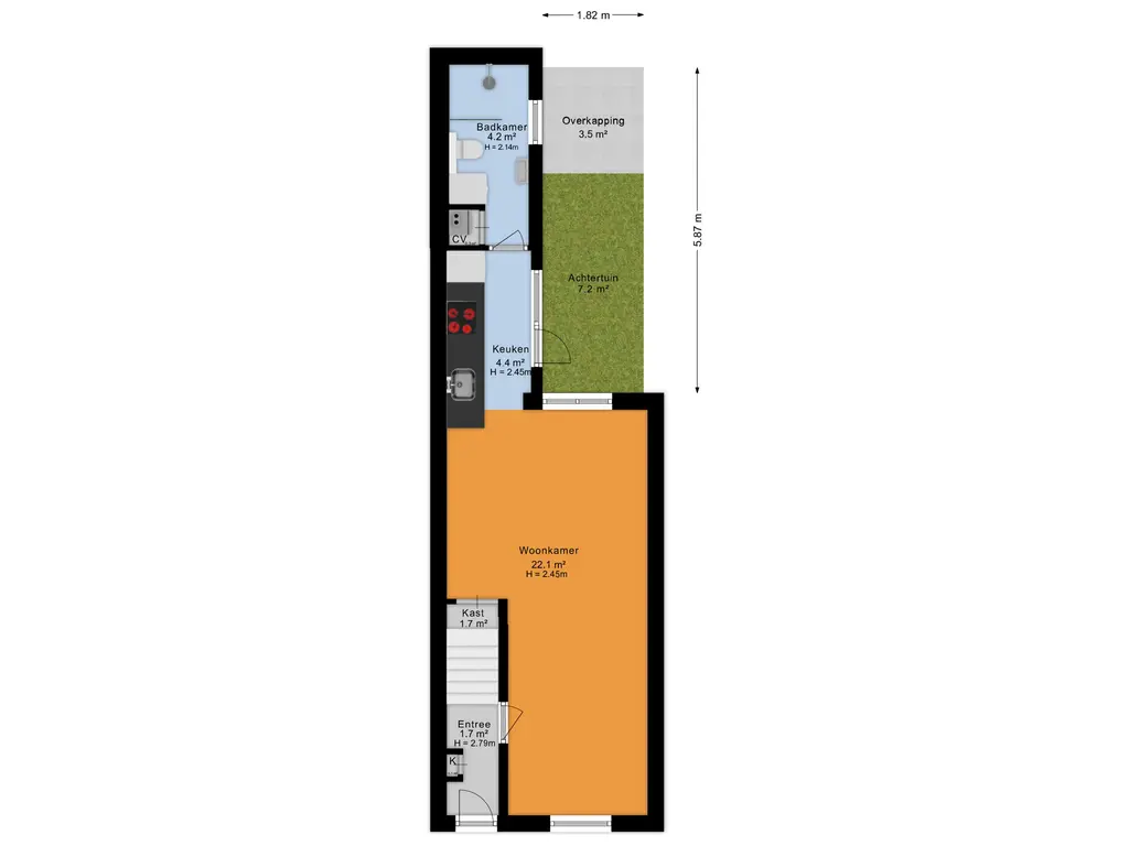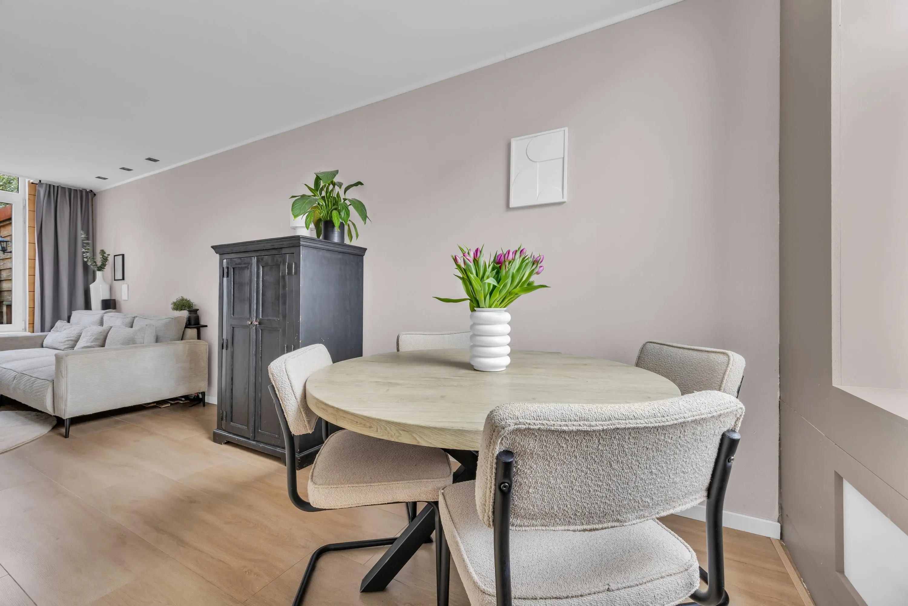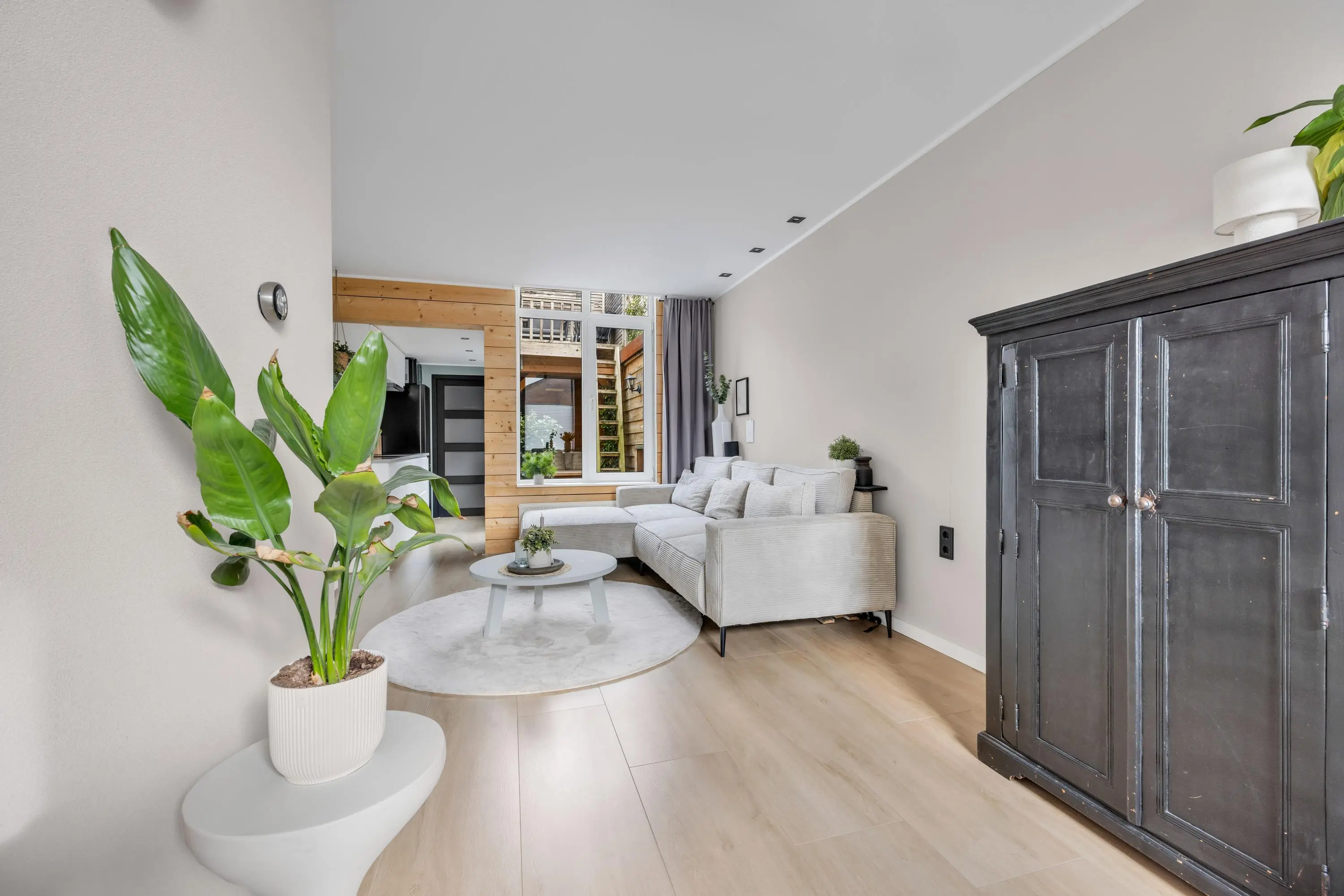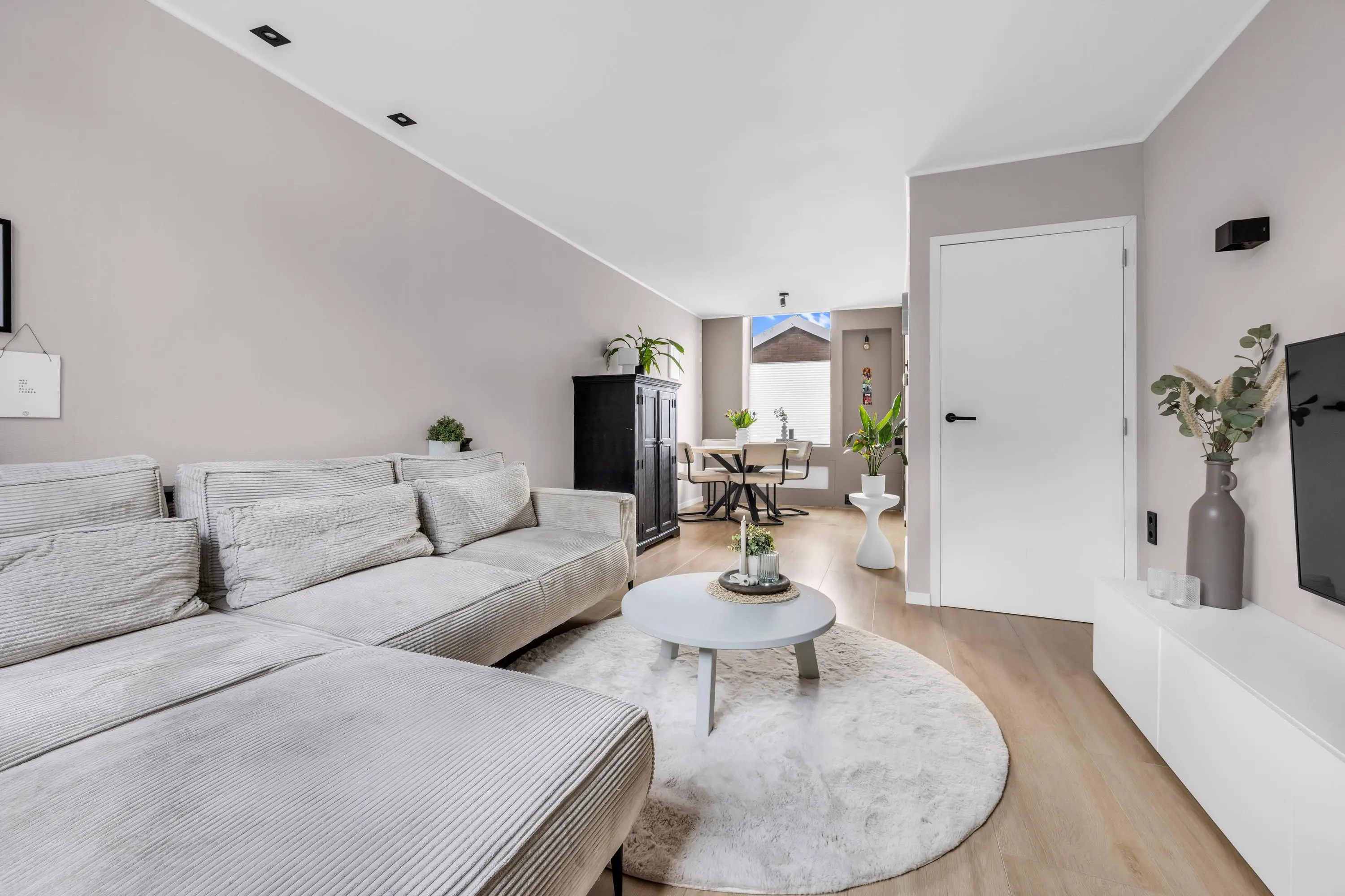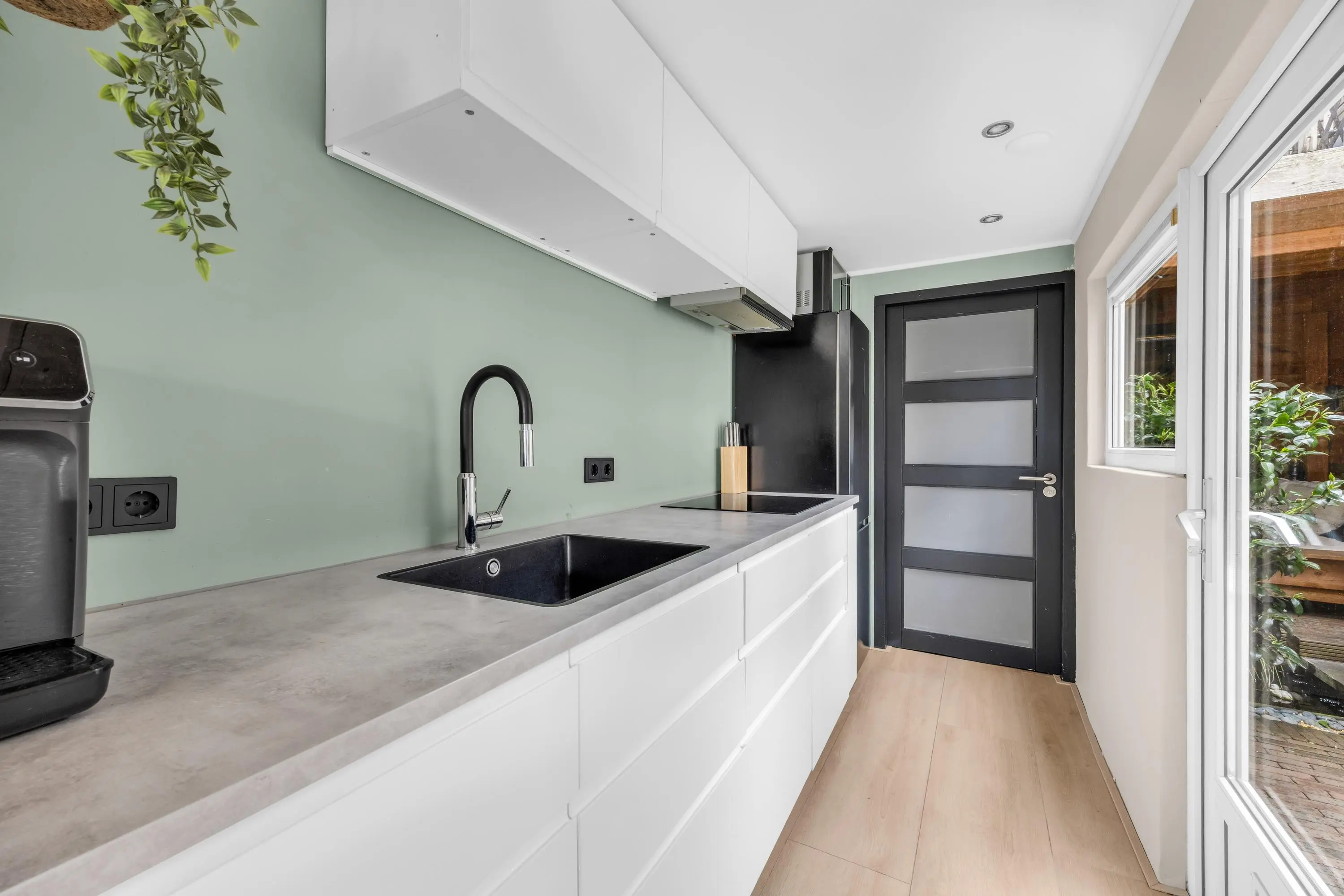 Via de entree kom je in de hal met meterkast en toegang tot de woonkamer. De woonkamer is licht en sfeervol, voorzien van strak afgewerkte wanden, een praktische trapkast en een betonnen vloer met laminaatafwerking en comfortabele vloerverwarming. Aan de achterzijde bevindt zich de in 2023 vernieuwde keuken, uitgevoerd in een lichte kleurstelling en voorzien van diverse inbouwapparatuur, waaronder een vaatwasser, rvs-spoelbak en inductiekookplaat. Vanuit de keuken heb je direct toegang tot het beschutte binnenplaatsje.