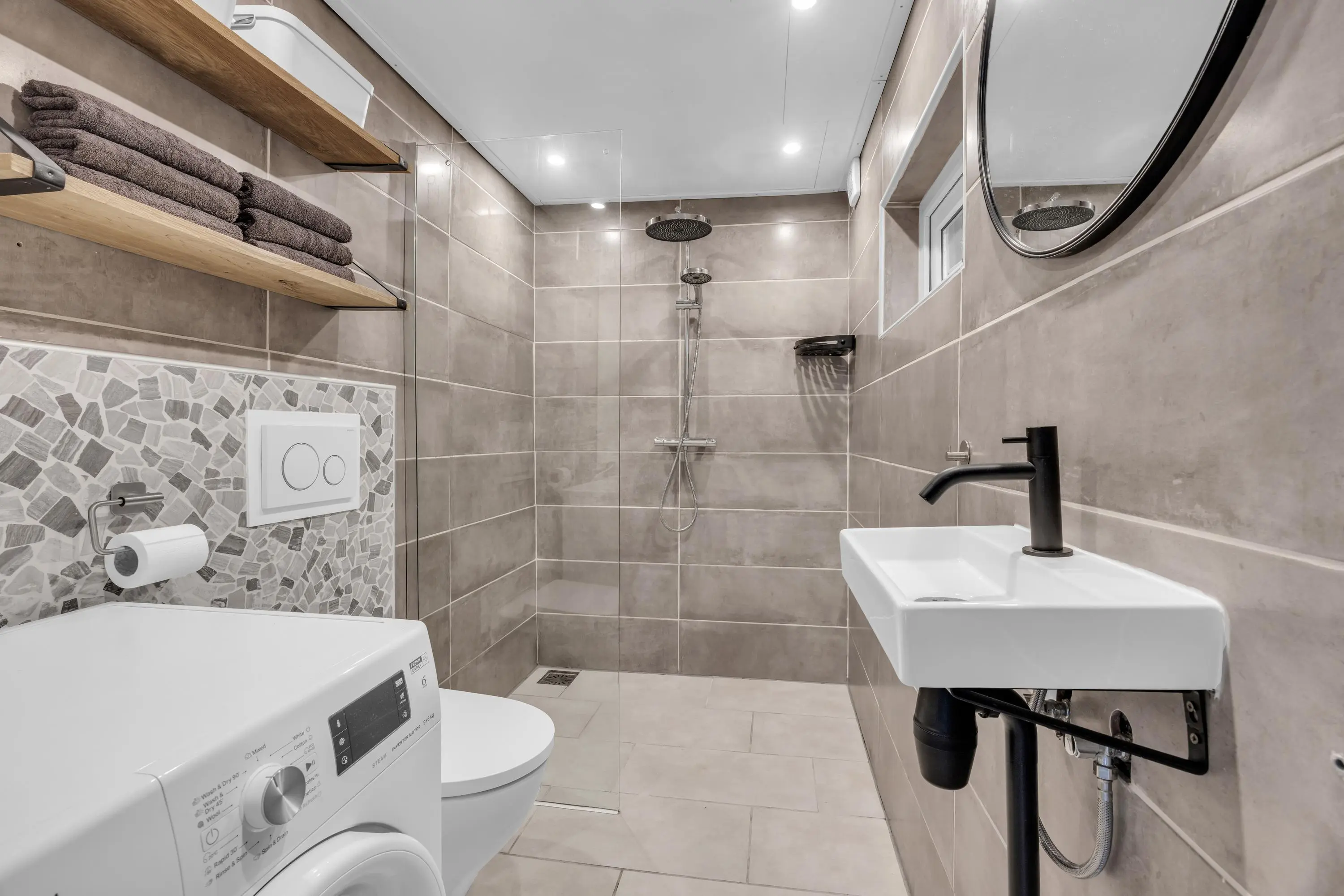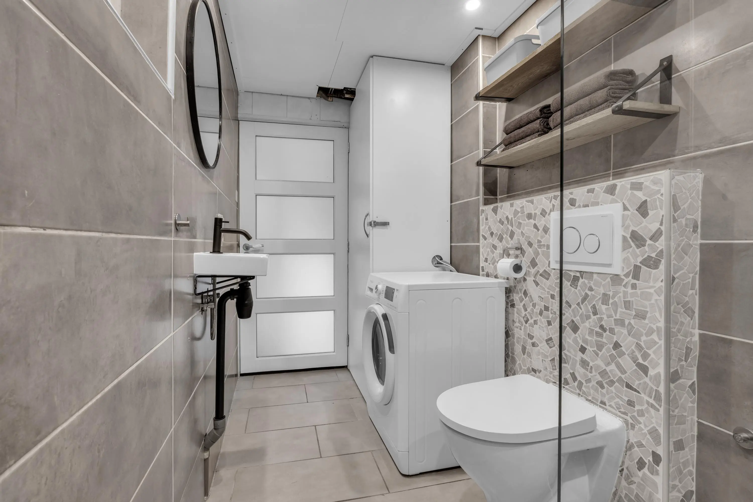De moderne badkamer is ruim opgezet en beschikt over een inloopdouche, toilet, wastafelmeubel en aansluitingen voor de wasmachine. Daarnaast is hier de cv-combiketel netjes weggewerkt in een kast.