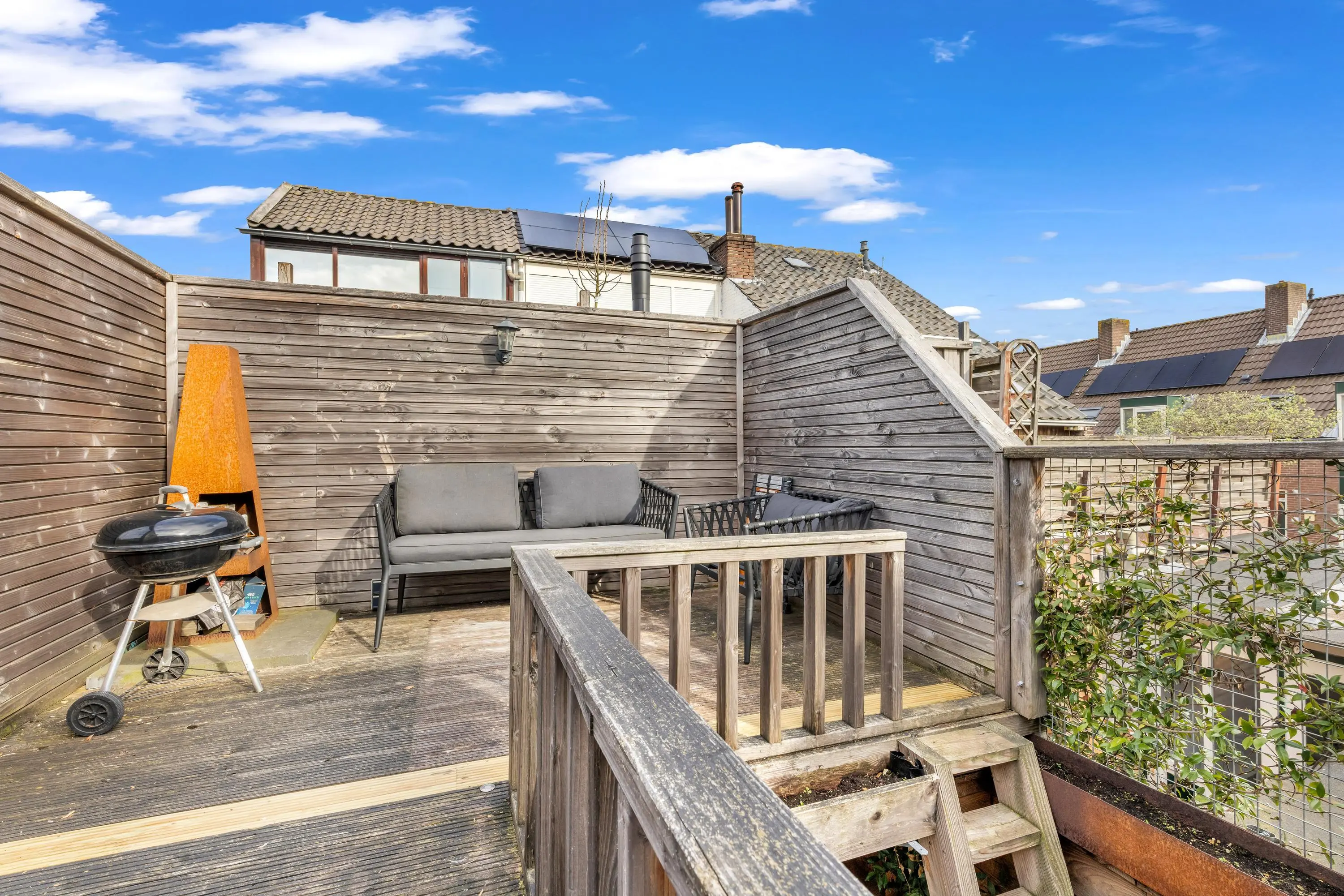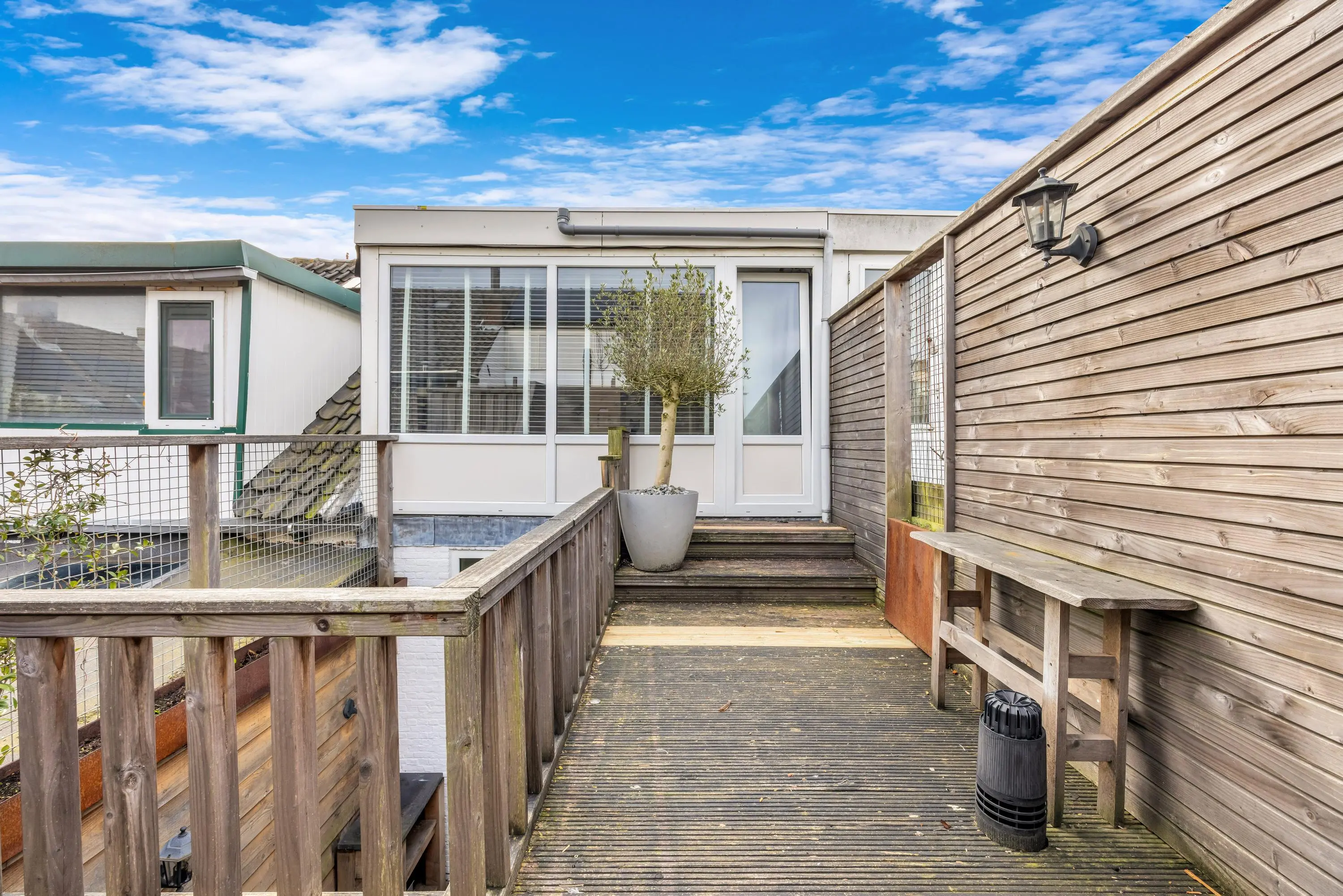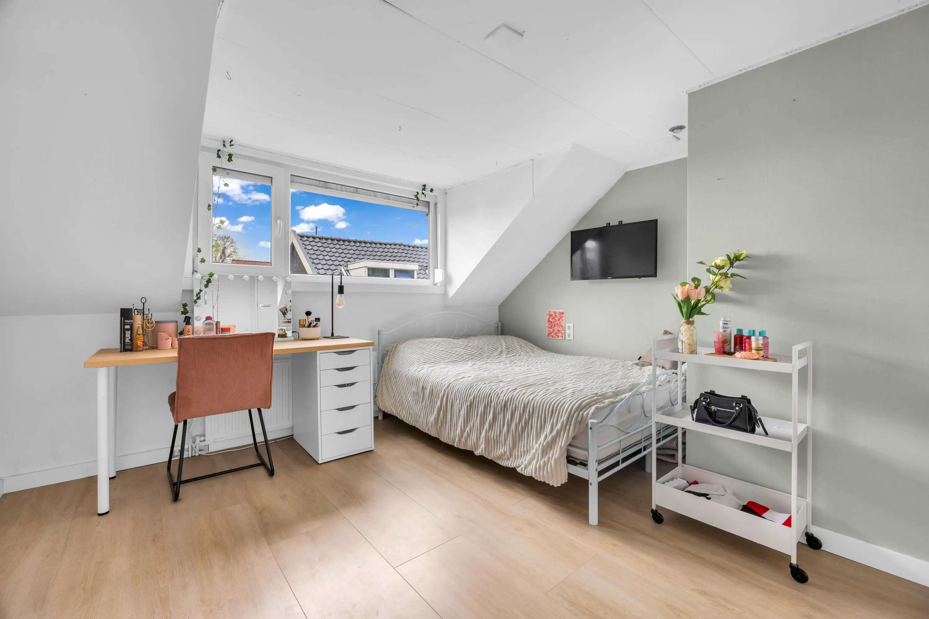 De overloop geeft toegang tot twee ruime slaapkamers. De slaapkamer aan de voorzijde is voorzien van een dakkapel met rolluik en een praktische kastenwand. Aan de achterzijde bevindt zich de tweede slaapkamer, eveneens ruim van formaat, met directe toegang tot het vergrote en zonnige dakterras. Het terras is voorzien van vlonders en beschikt over diverse elektrapunten, ideaal voor verlichting of buitengebruik.
