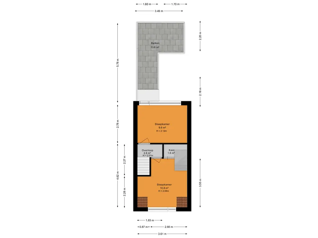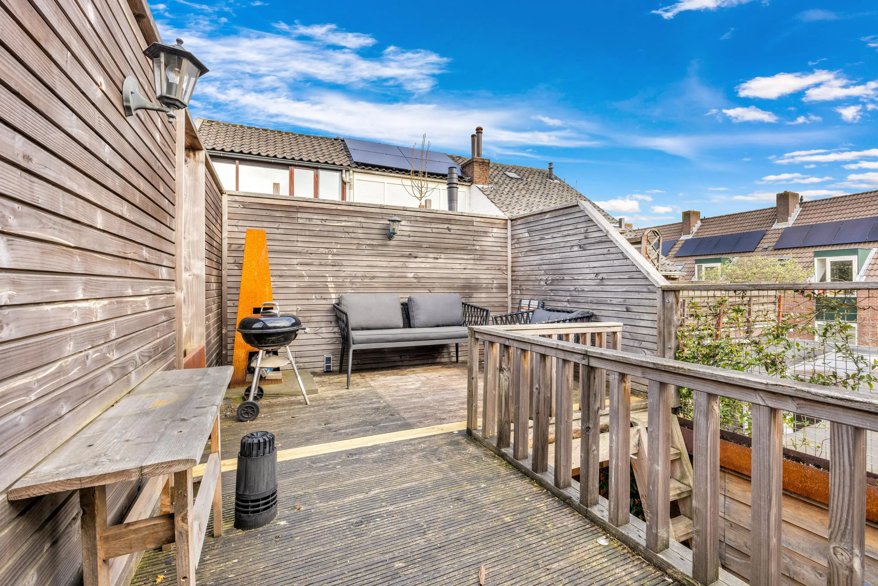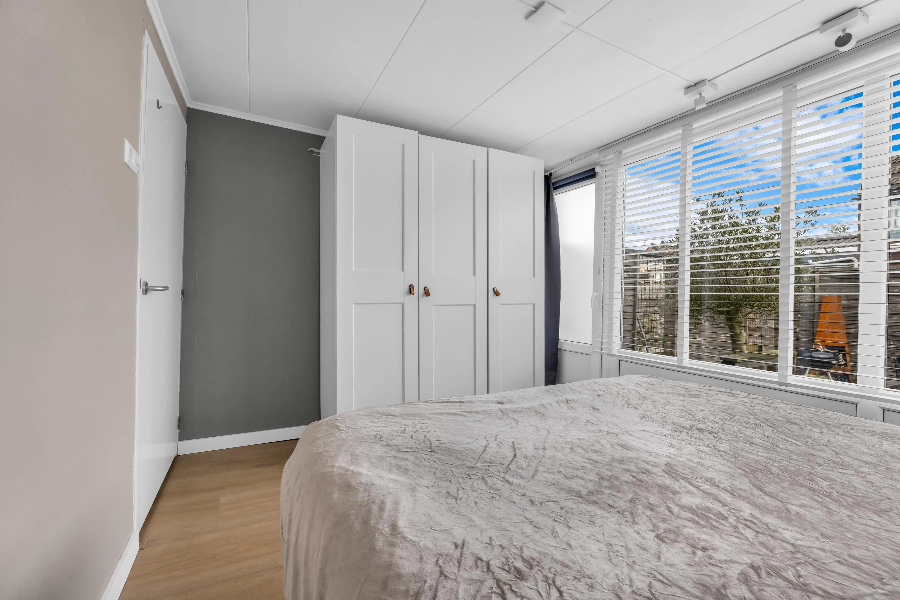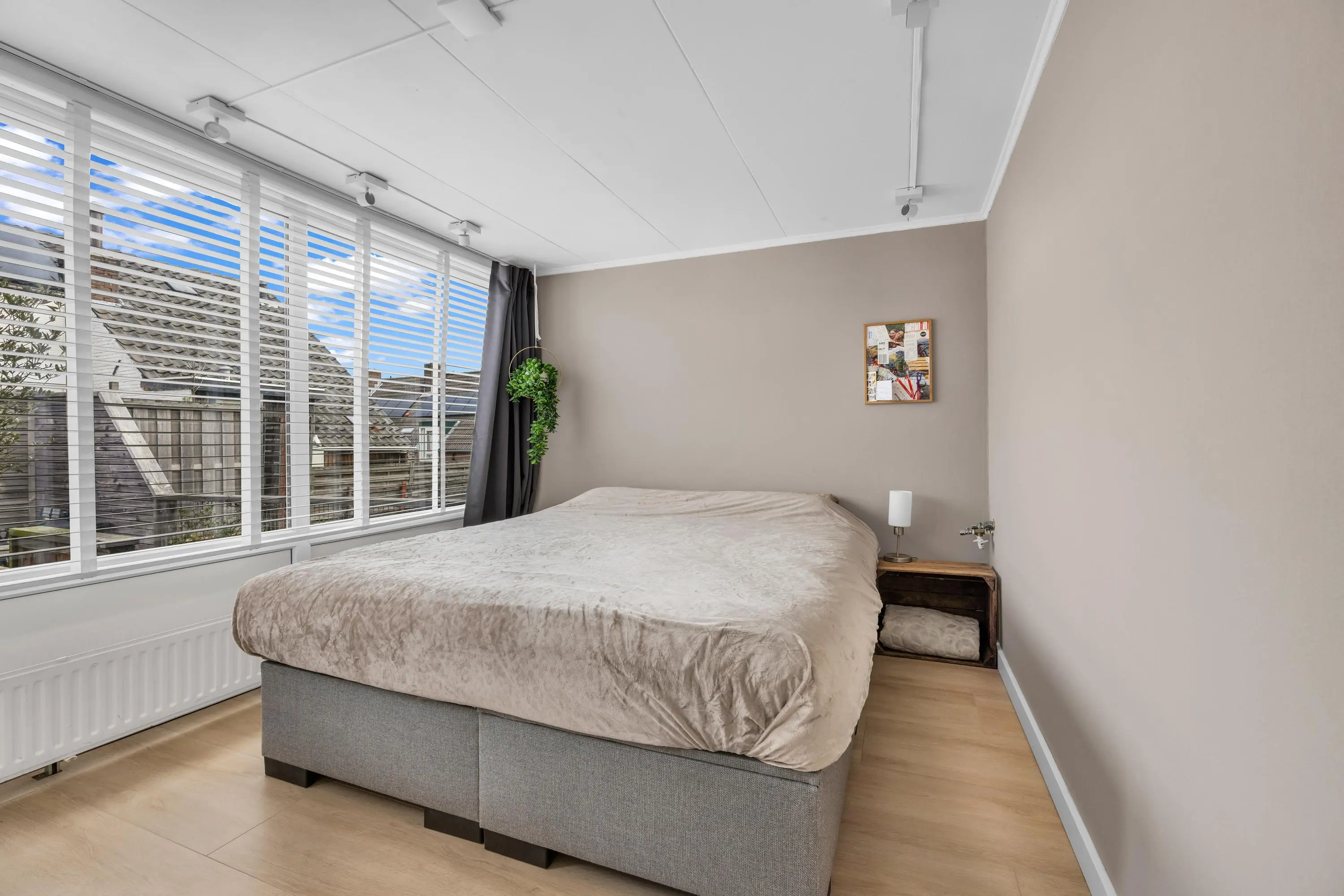 De overloop geeft toegang tot twee ruime slaapkamers. De slaapkamer aan de voorzijde is voorzien van een dakkapel met rolluik en een praktische kastenwand. Aan de achterzijde bevindt zich de tweede slaapkamer, eveneens ruim van formaat, met directe toegang tot het vergrote en zonnige dakterras. Het terras is voorzien van vlonders en beschikt over diverse elektrapunten, ideaal voor verlichting of buitengebruik.