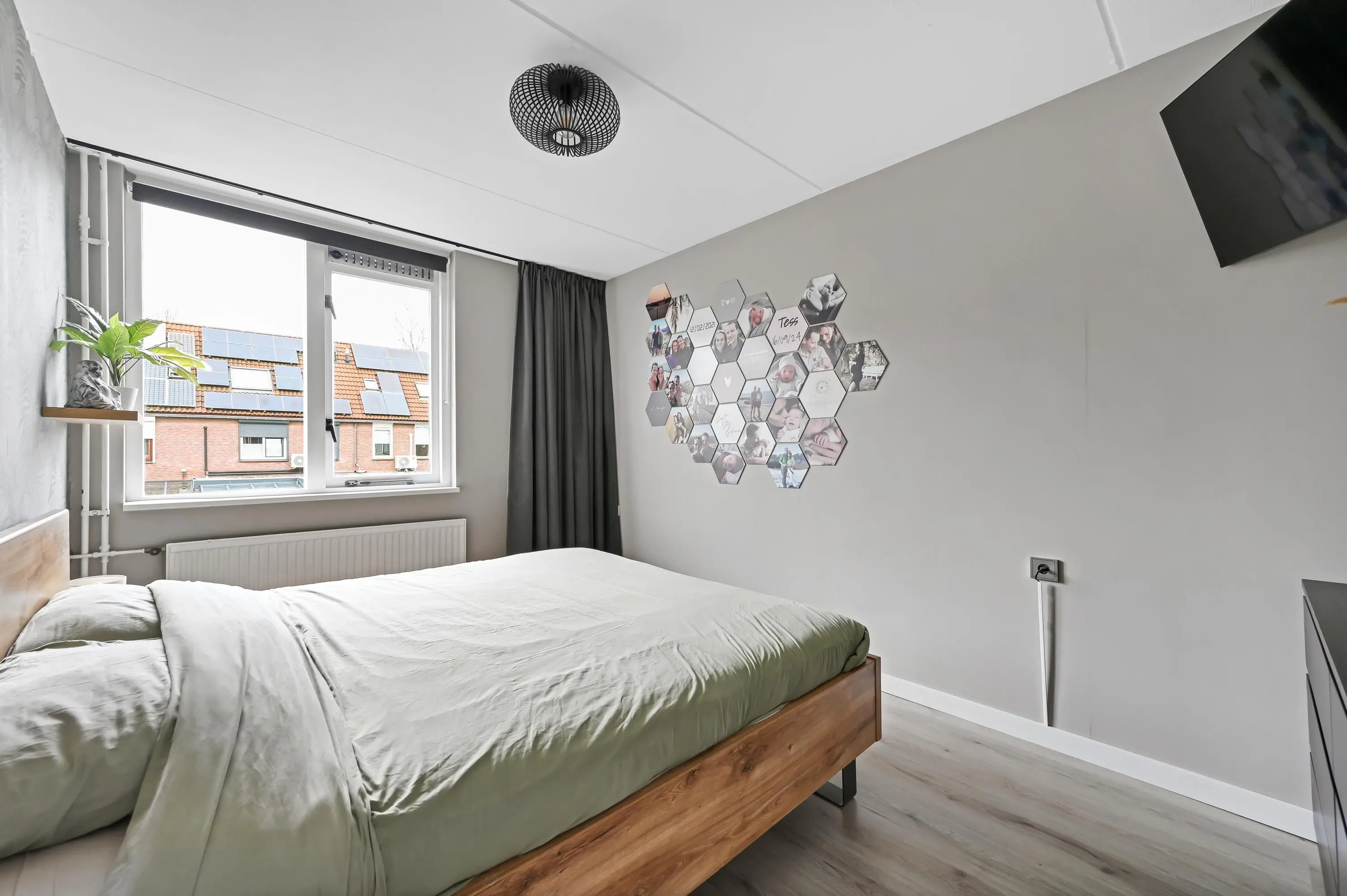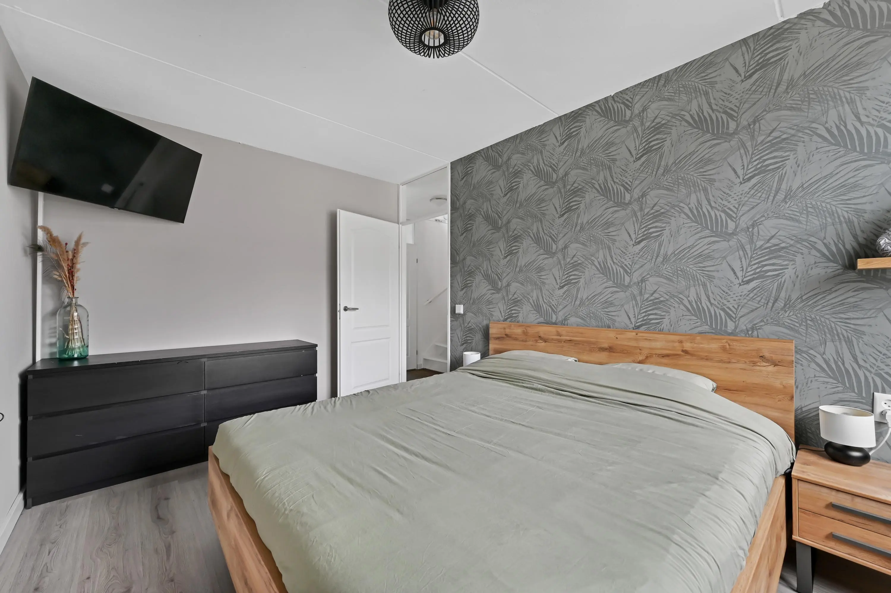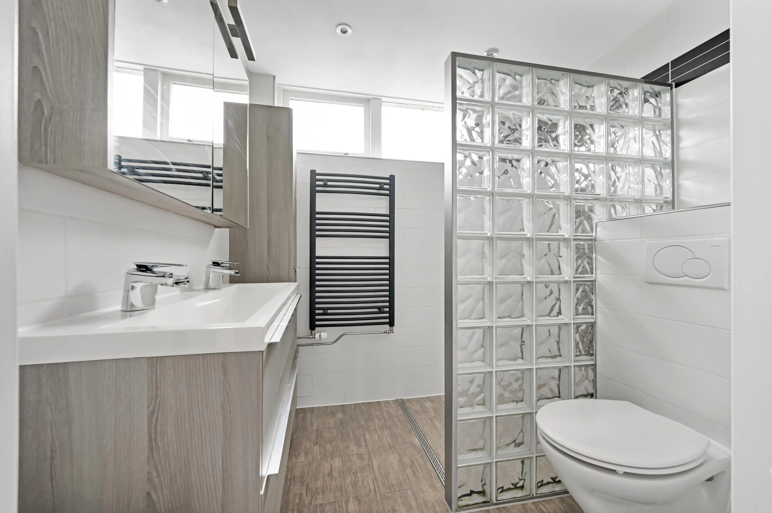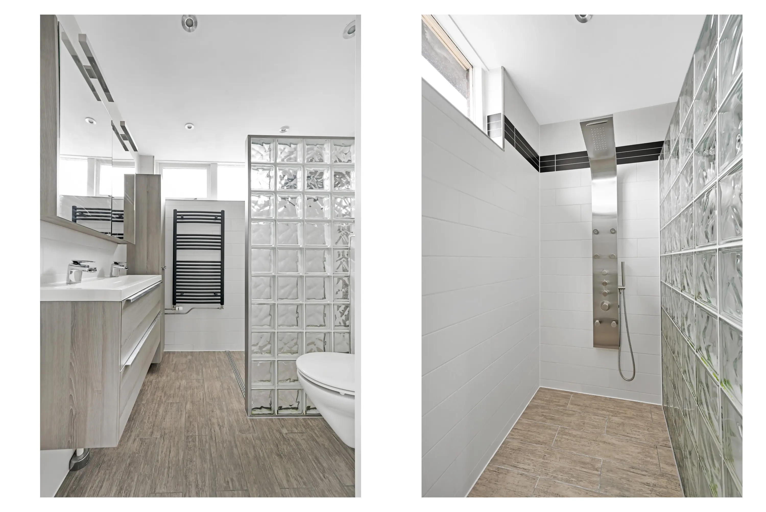 De overloop biedt toegang tot drie slaapkamers van circa 12 m², 9 m² en 7 m², allen afgewerkt met een laminaatvloer en vliesbehang. De moderne badkamer is voorzien van een wastafelmeubel, inloopdouche met glasblokkenwand, tweede toilet, designradiator, mechanische ventilatie en een te openen raam voor natuurlijke ventilatie.