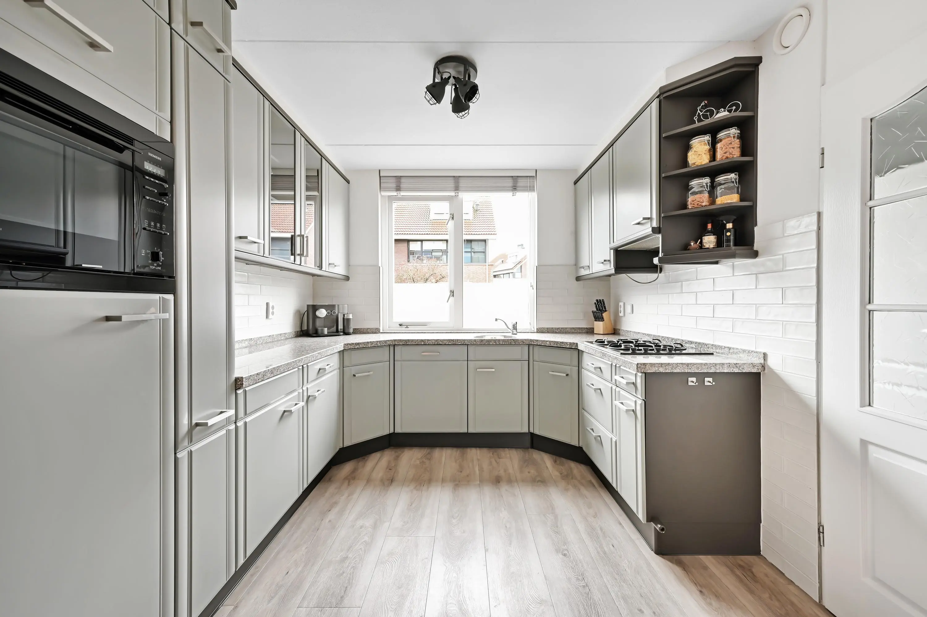De gehele begane grond is voorzien van een lichte pvc-vloer met comfortabele vloerverwarming. De uitgebouwde, tuingerichte woonkamer is ruim en licht en beschikt over een praktische vaste kast. Aan de voorzijde bevindt zich de open keuken in U-opstelling, uitgevoerd met een granieten werkblad, rvs-wasbak, 4-pits gaskookplaat, afzuigkap, combi-oven, koelkast en vaatwasser.