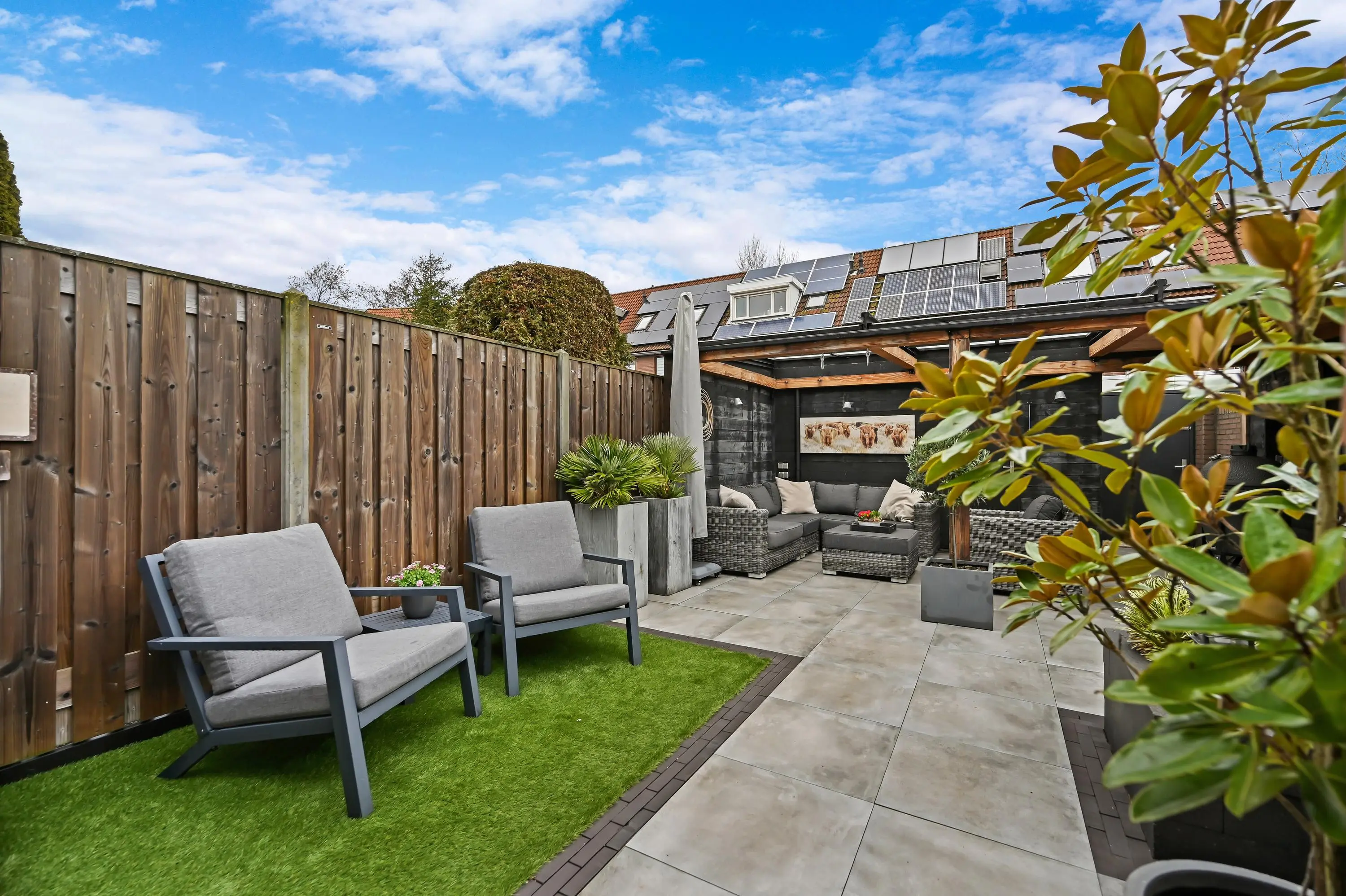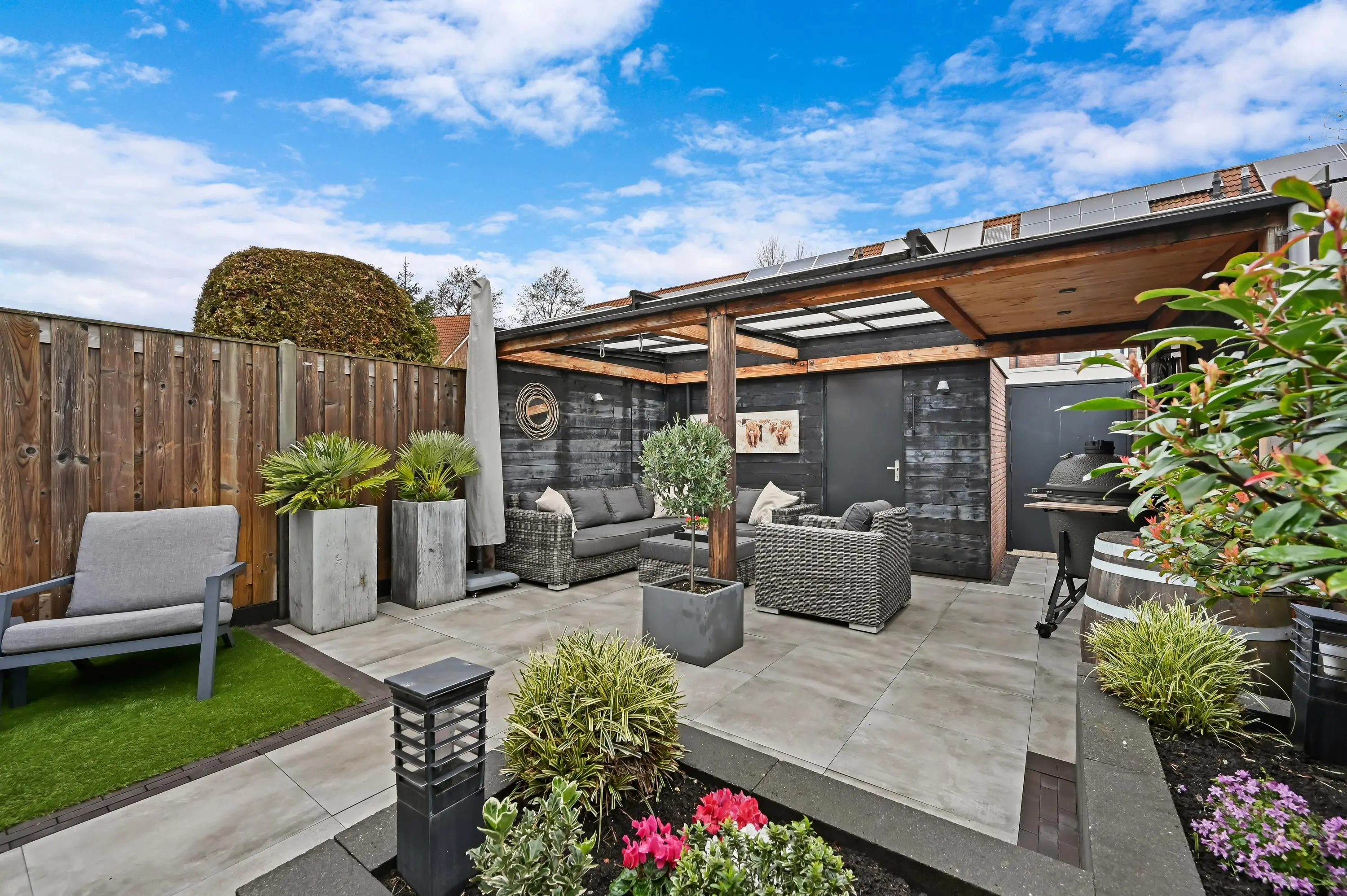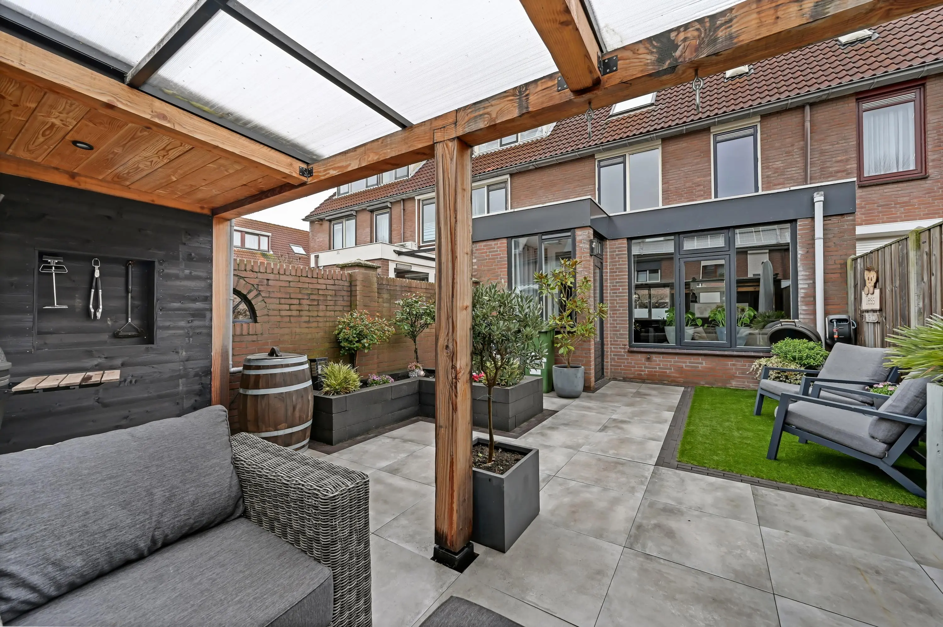 De fraai aangelegde achtertuin van circa 51 m² is gelegen op het oosten en grotendeels bestraat met sierstraatwerk, afgewisseld met plantenperken voor een groene uitstraling. De tuin is omheind met aan de ene zijde een houten schutting en aan de andere zijde een stenen afscheiding met karakteristieke stalramen. Achterin bevindt zich een stenen berging met elektra en daarnaast is een overkapping gerealiseerd, zodat u ook bij minder weer comfortabel buiten kunt zitten. Tevens zijn er een achterom en een buitenkraan aanwezig.