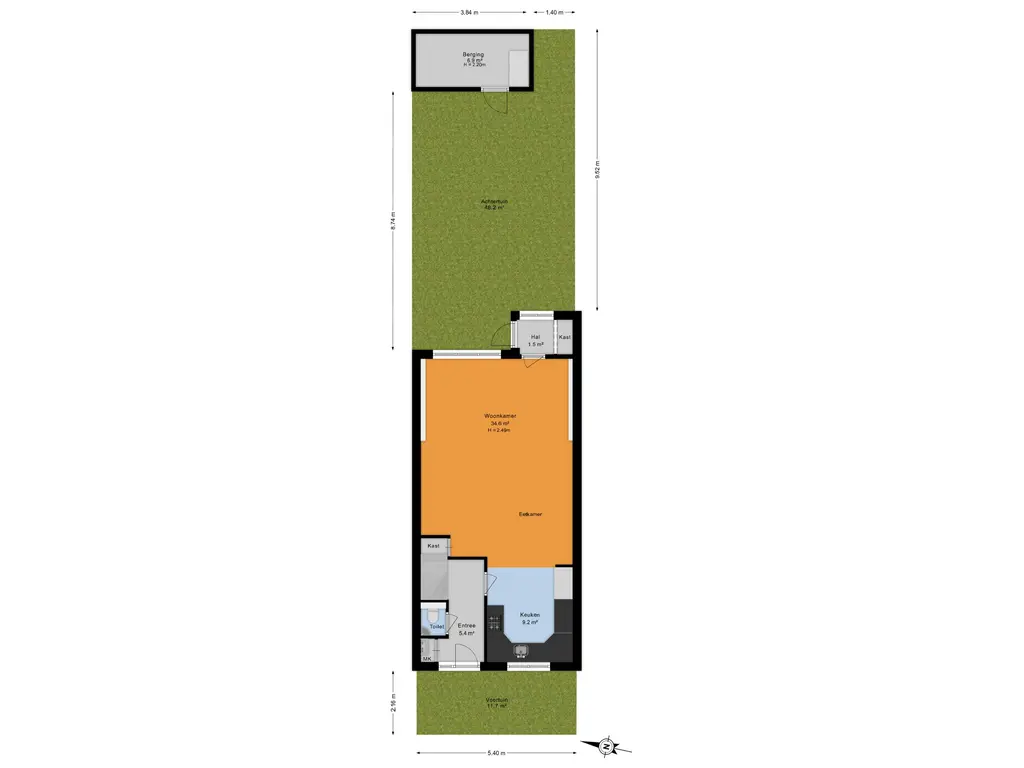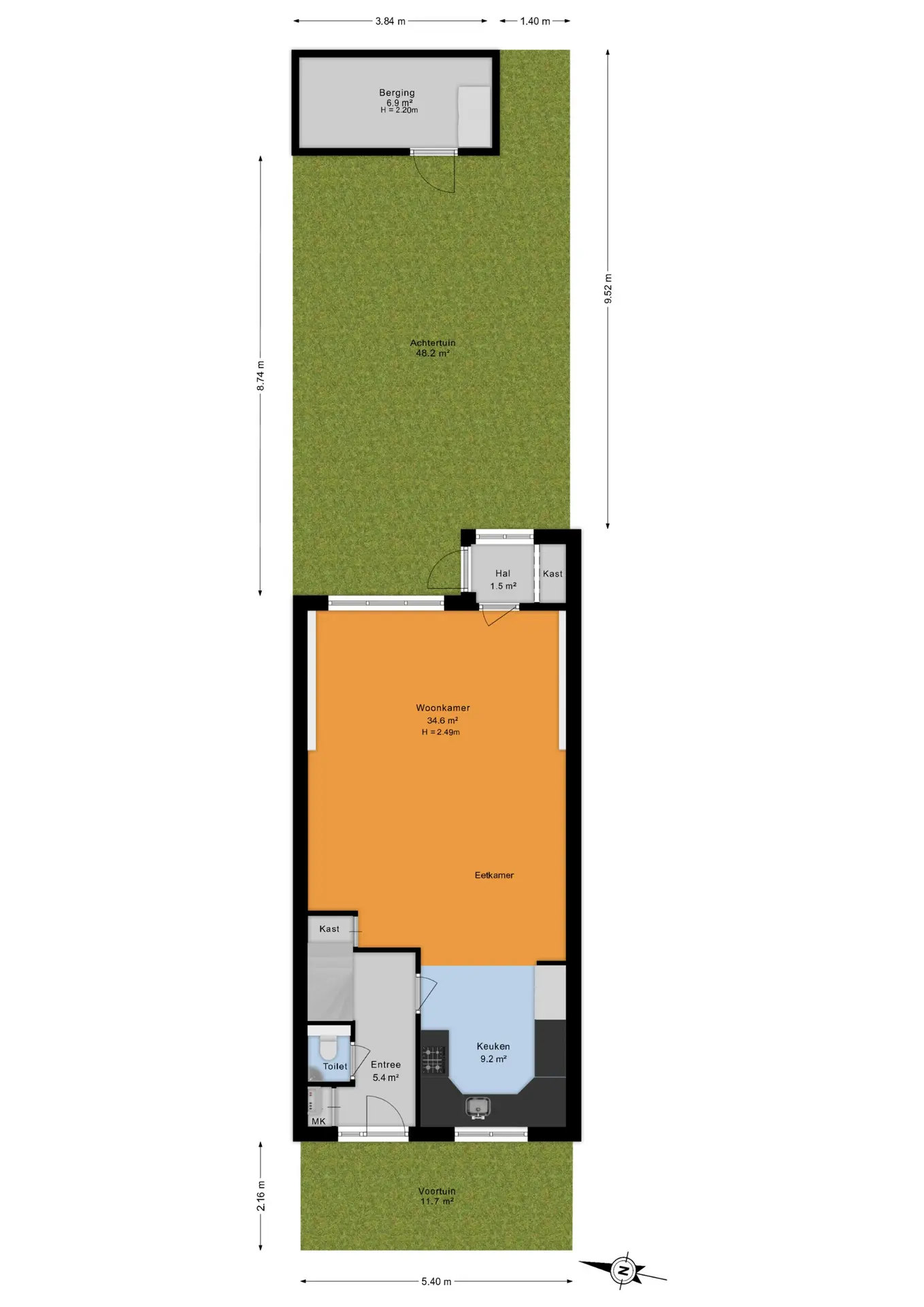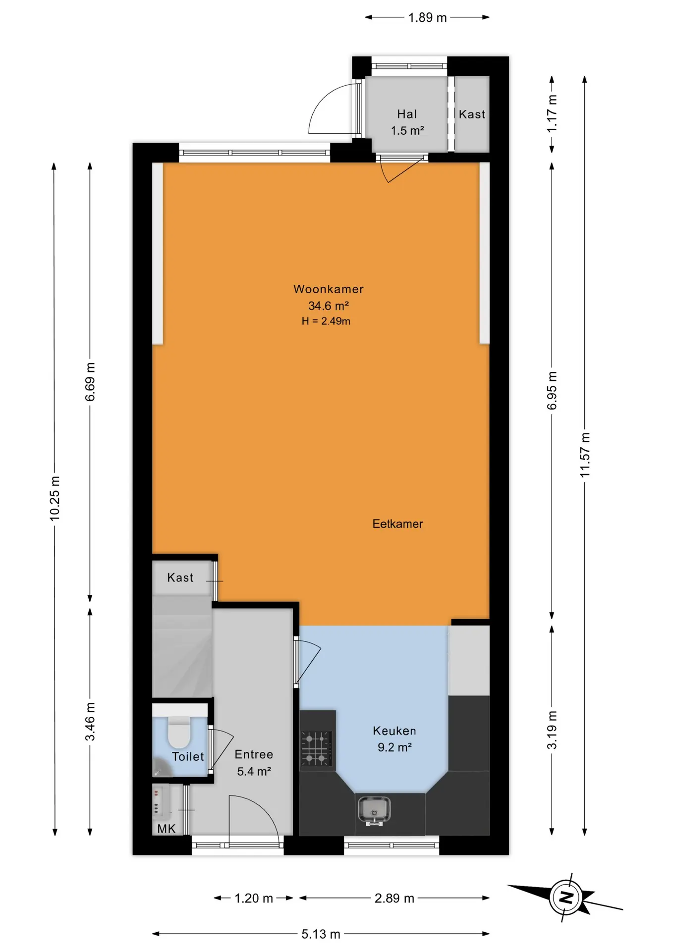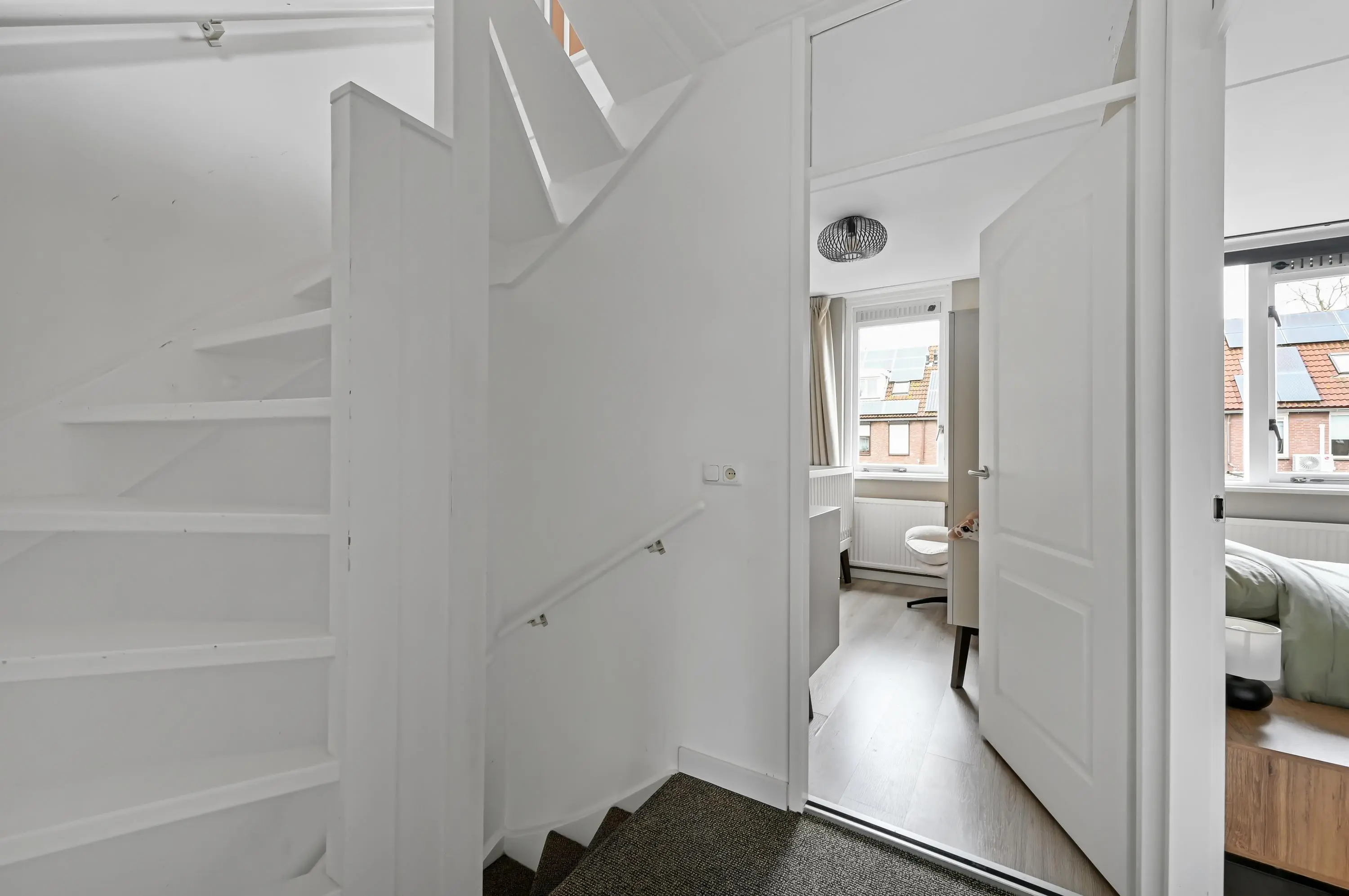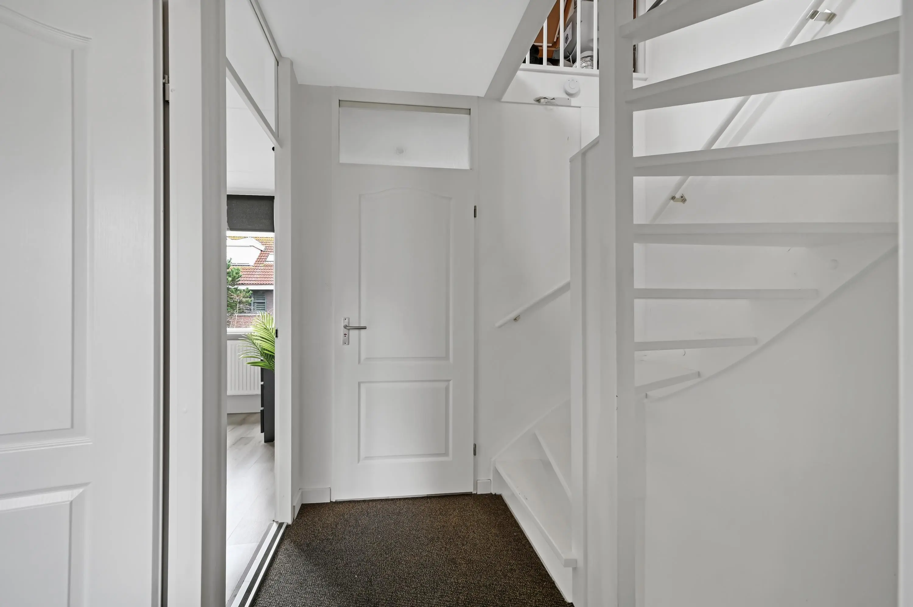 Via de voortuin bereikt u de entree van de woning. In de hal bevinden zich de garderoberuimte, meterkast, het toilet en de trapopgang. Dankzij het raam tussen hal en woonkamer valt er aangenaam daglicht naar binnen, wat zorgt voor een open en uitnodigende sfeer.