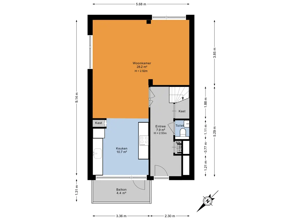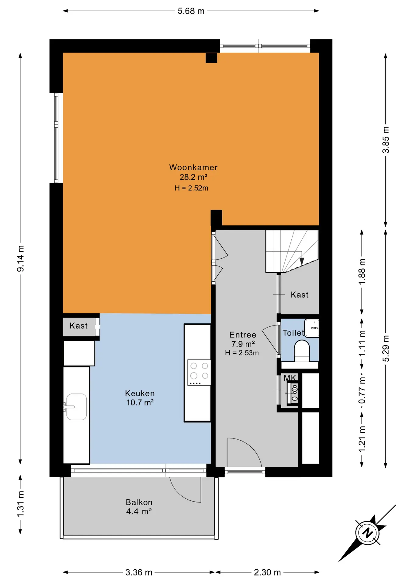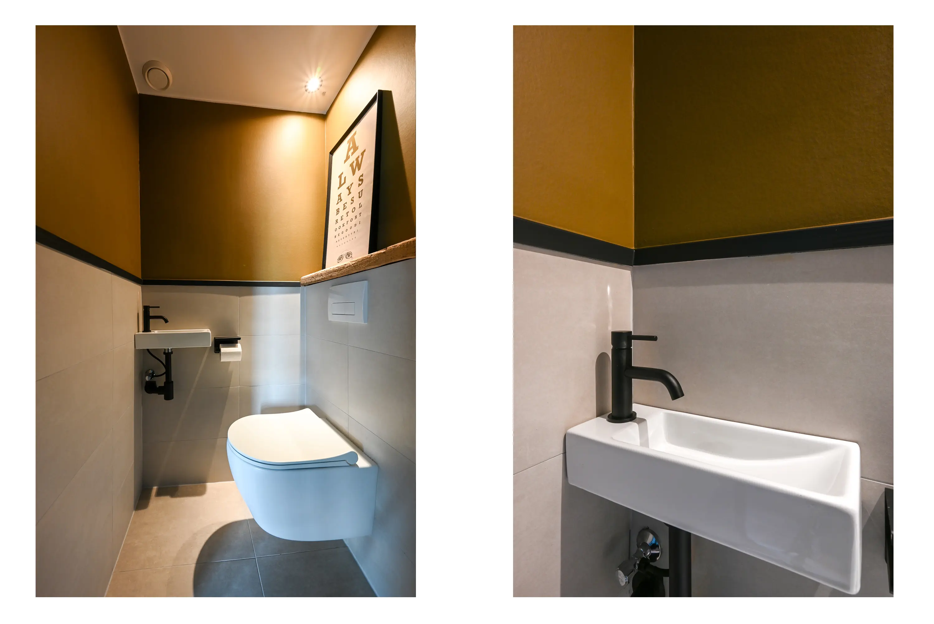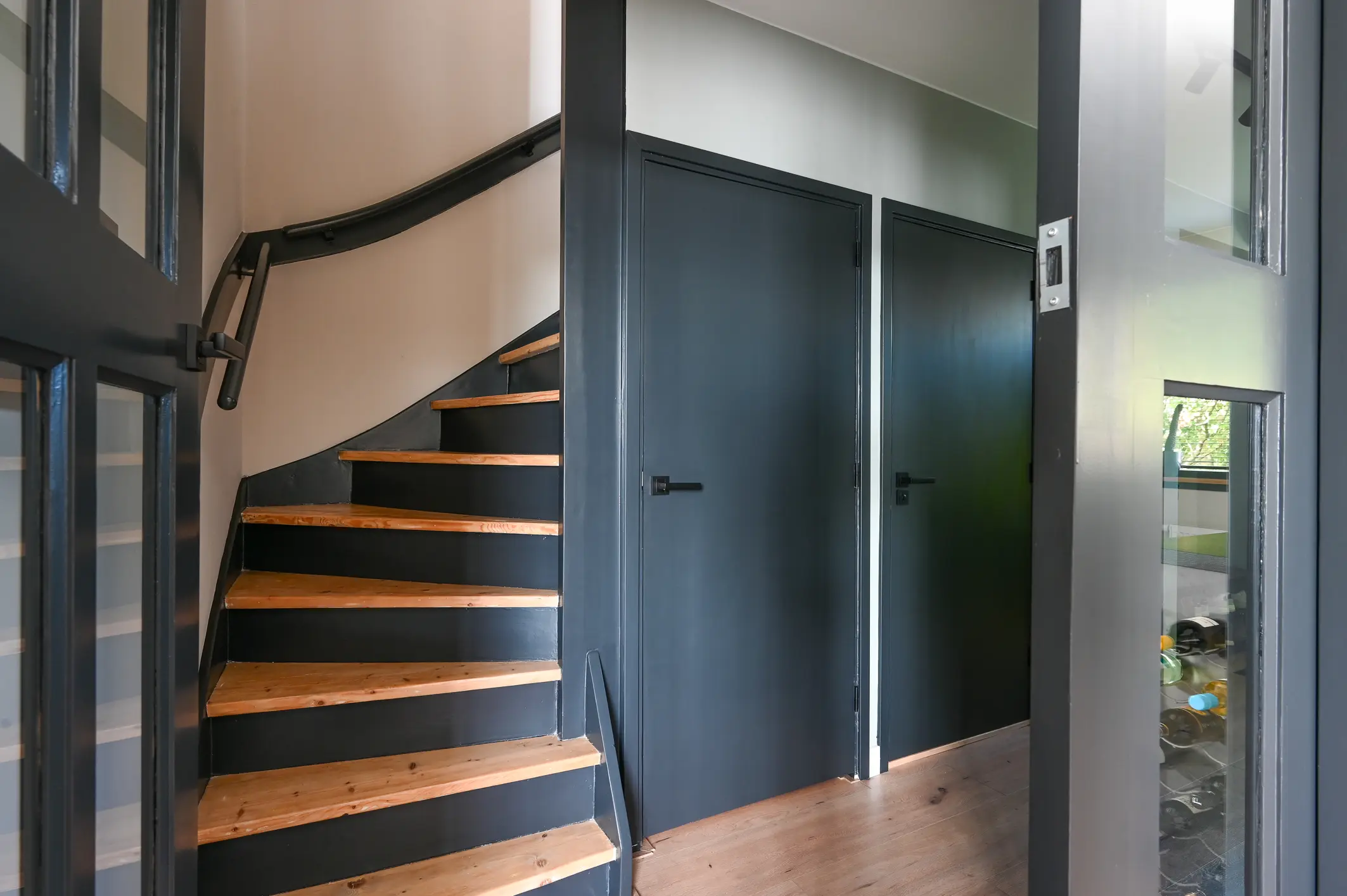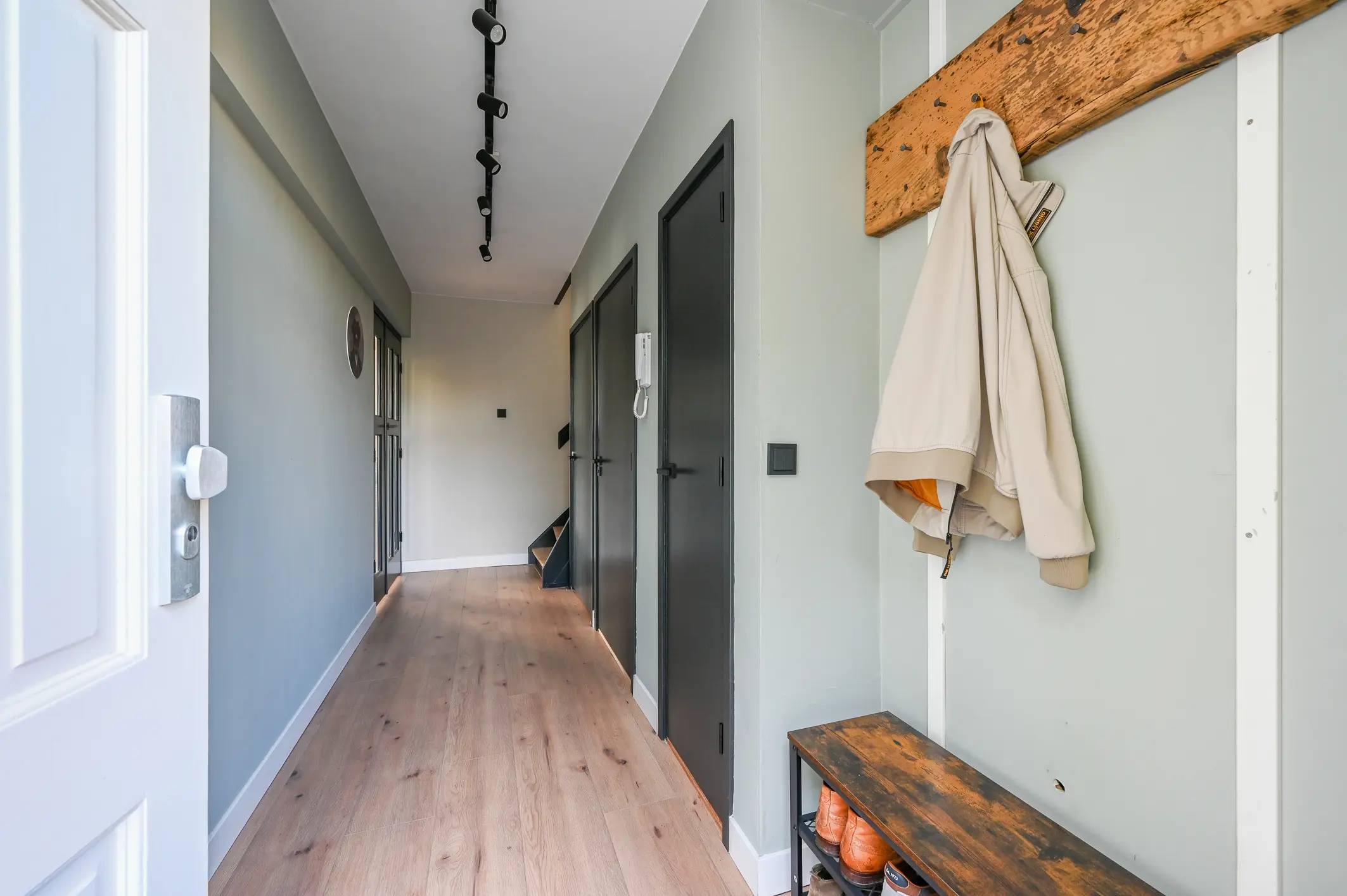 Je komt binnen in de ruime hal met meterkast (maar liefst 11 groepen), een handige bergkast met de 80L boiler (eigendom) en een strak afgewerkt toilet. Vanuit hier stap je door naar de woonkamer.