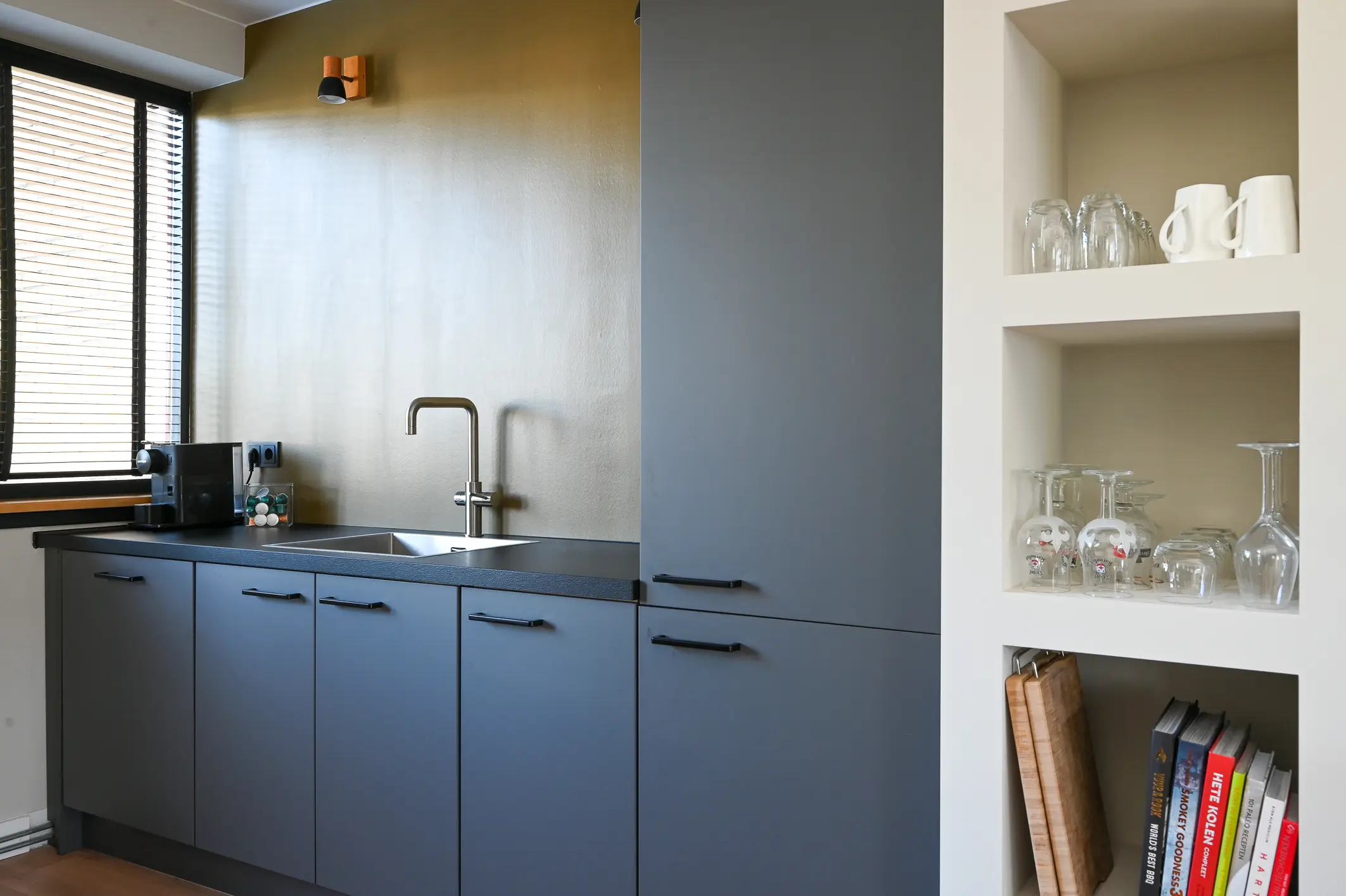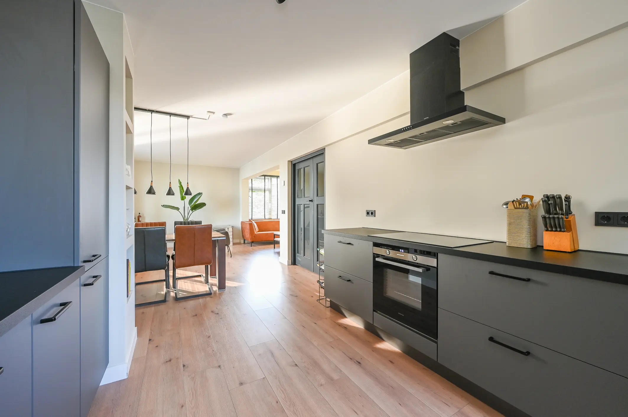 De keuken aan de voorzijde is modern en praktisch ingericht, voorzien van diverse inbouwapparaten zoals een vaatwasser, koel-/vriescombinatie, inductiekookplaat, combi-oven en zelfs een kokendwaterkraan.