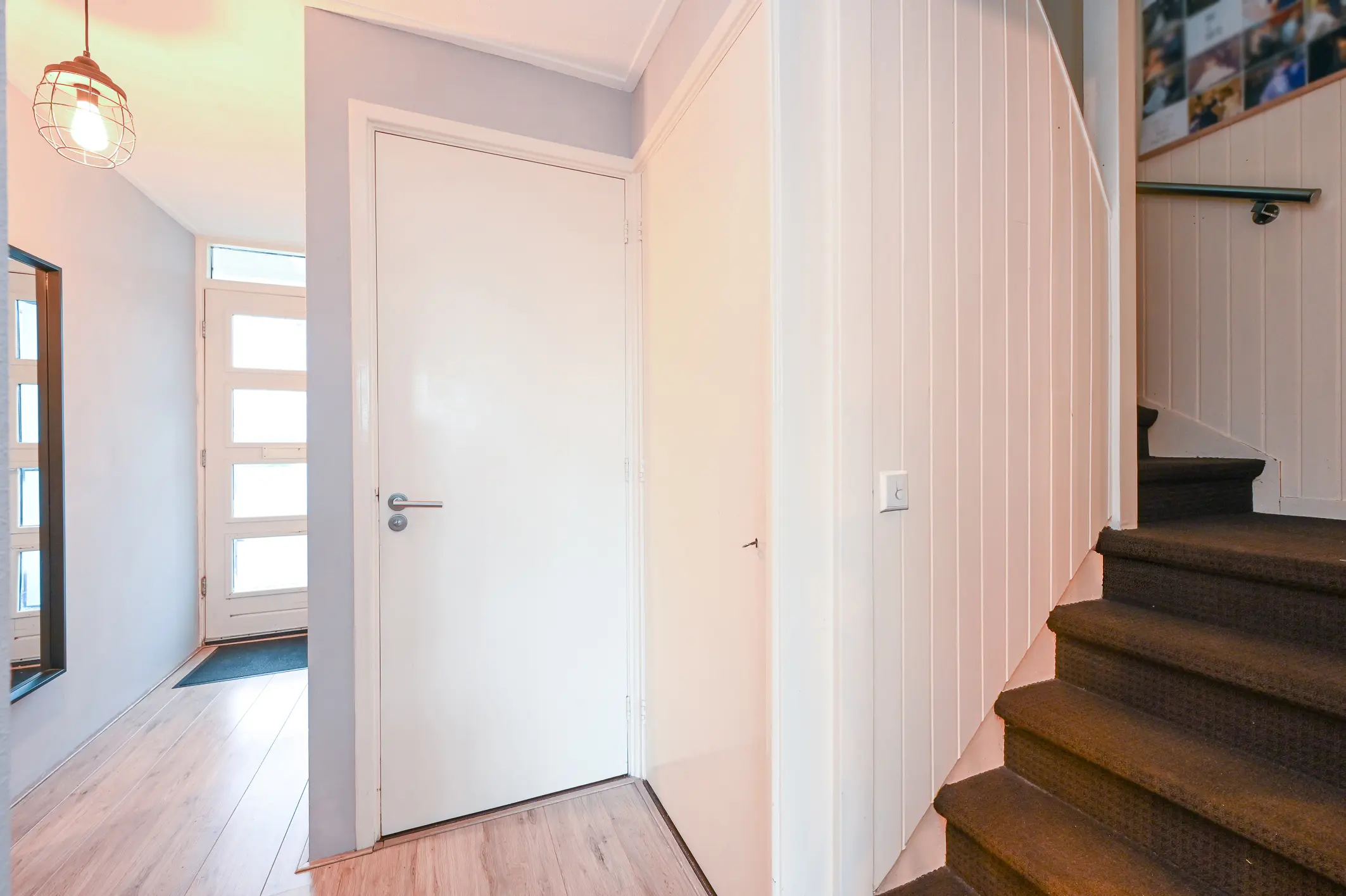 Via de nette voortuin bereik je de entree van de woning. In de hal vind je het toilet, de trapopgang naar de eerste verdieping en toegang tot de inpandige berging, die ook via buiten bereikbaar is. Deze praktische ruimte is voorzien van aansluitingen voor wasmachine en droger, en herbergt tevens de CV-combiketel (Vaillant EcoTec, 2021).