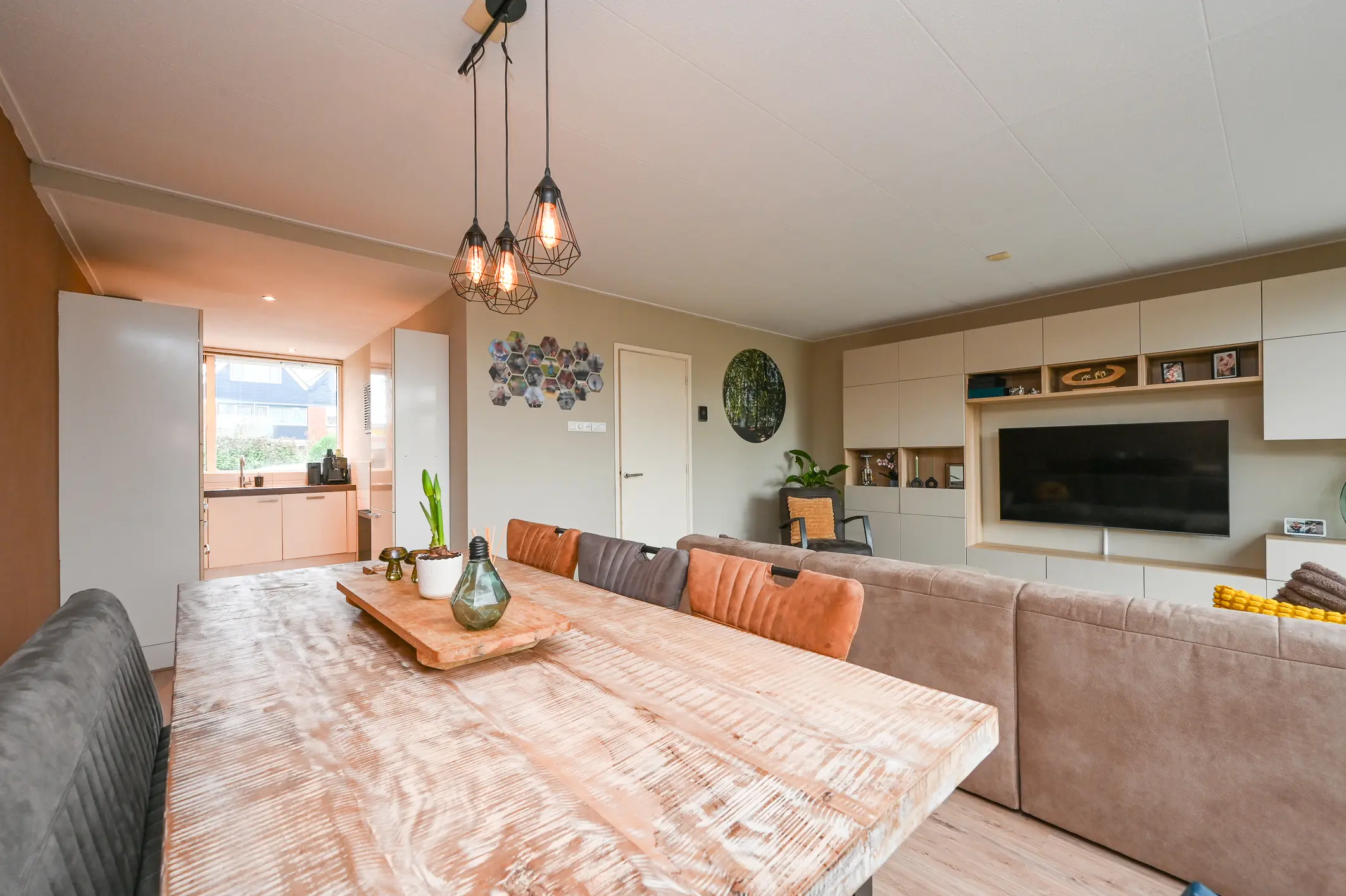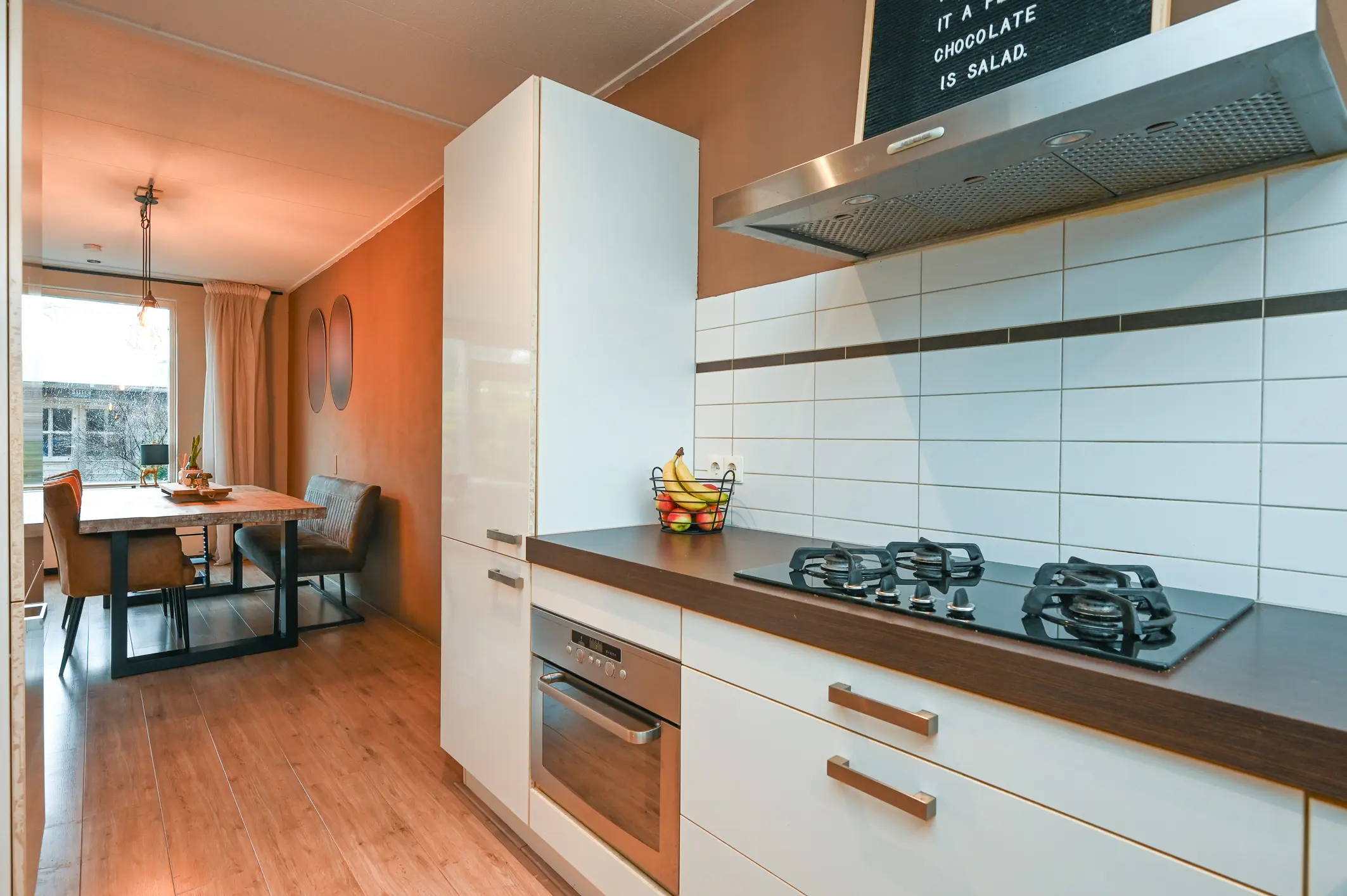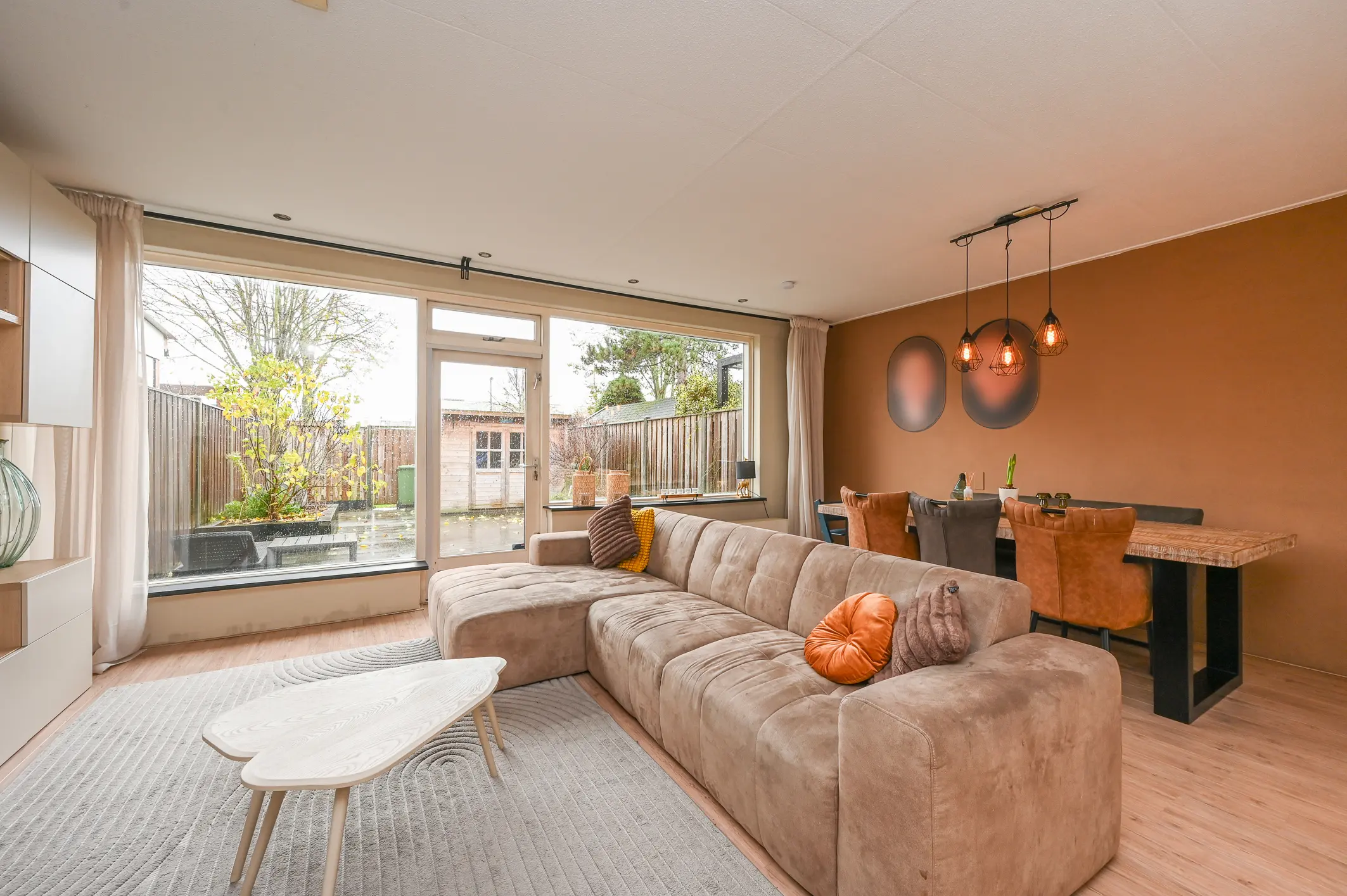 De woonkamer strekt zich uit over de volledige breedte van de woning en heeft grote ramen aan de achterzijde, wat zorgt voor een heerlijk lichte en ruimtelijke sfeer. Vanuit de woonkamer kijk je fraai weg over de tuin en het achtergelegen groen.