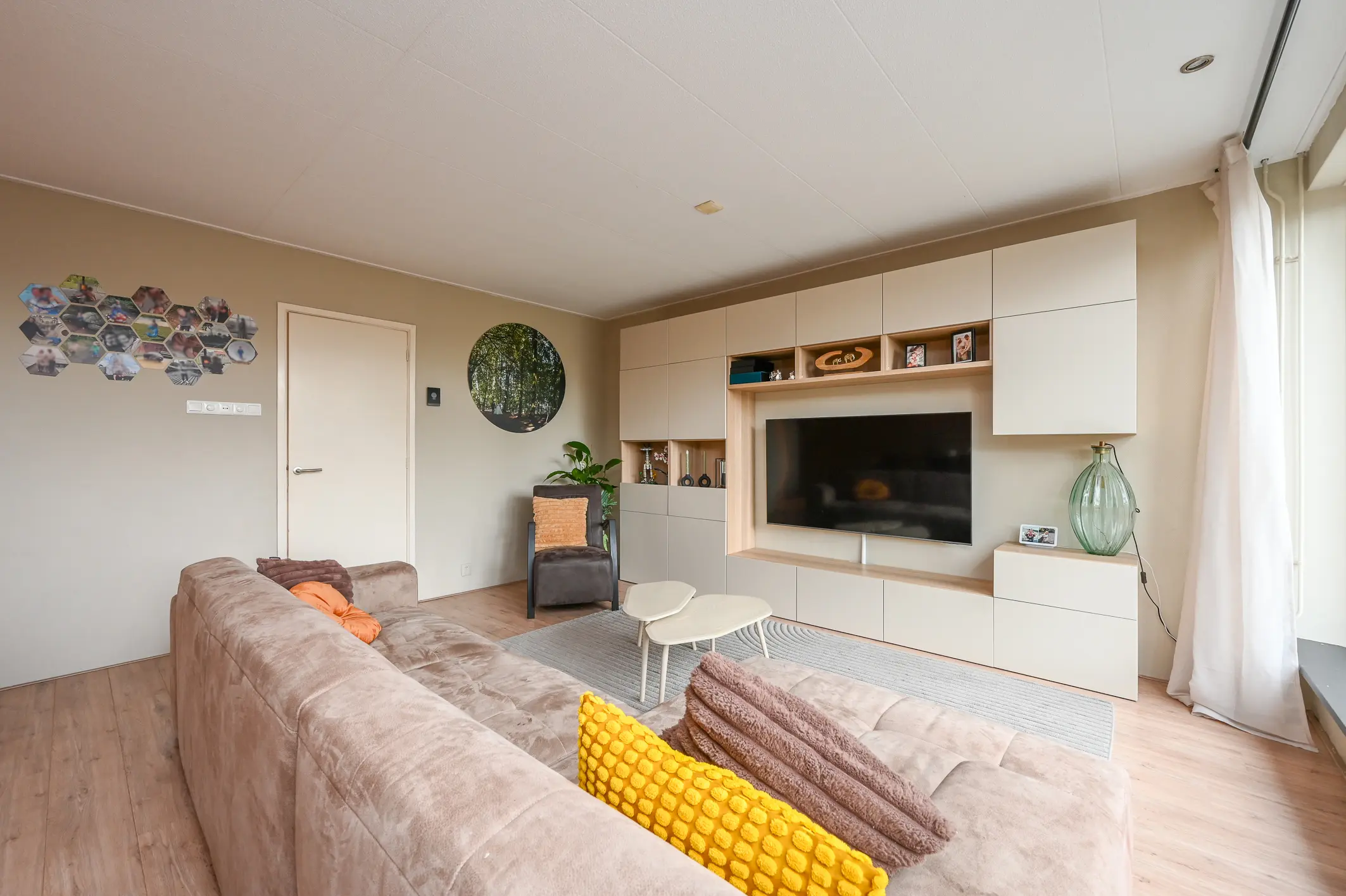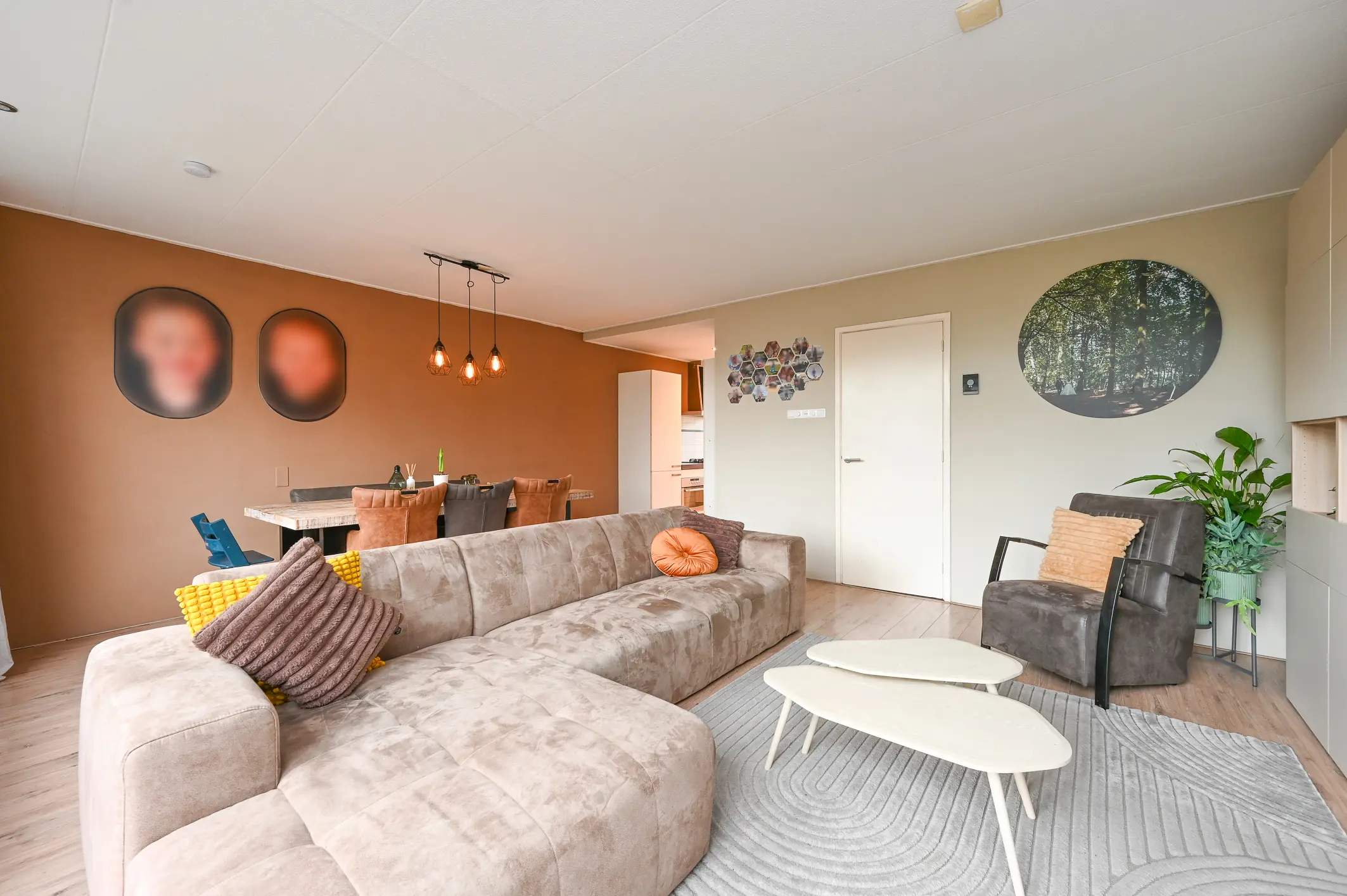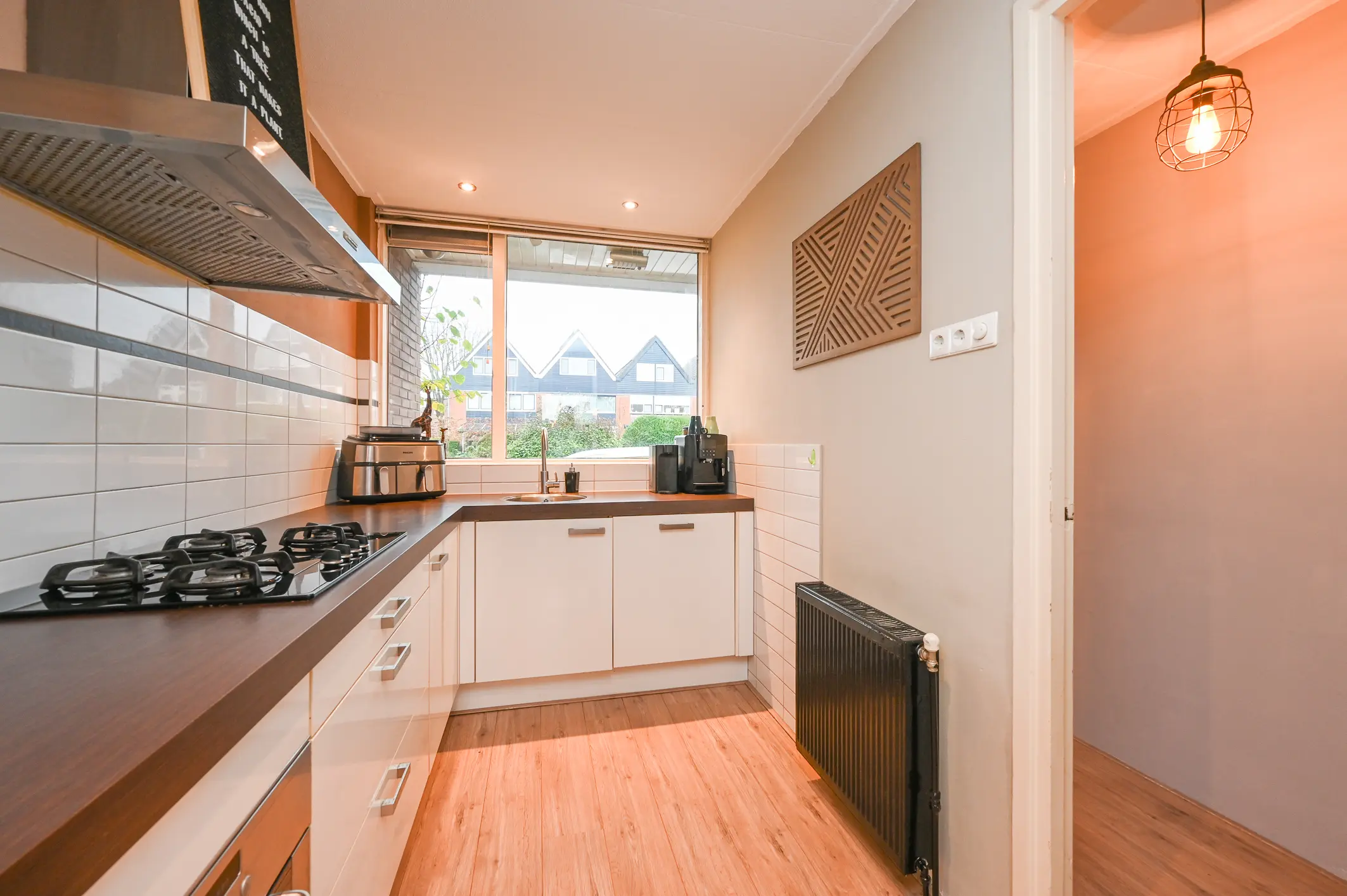 De woonkamer strekt zich uit over de volledige breedte van de woning en heeft grote ramen aan de achterzijde, wat zorgt voor een heerlijk lichte en ruimtelijke sfeer. Vanuit de woonkamer kijk je fraai weg over de tuin en het achtergelegen groen.