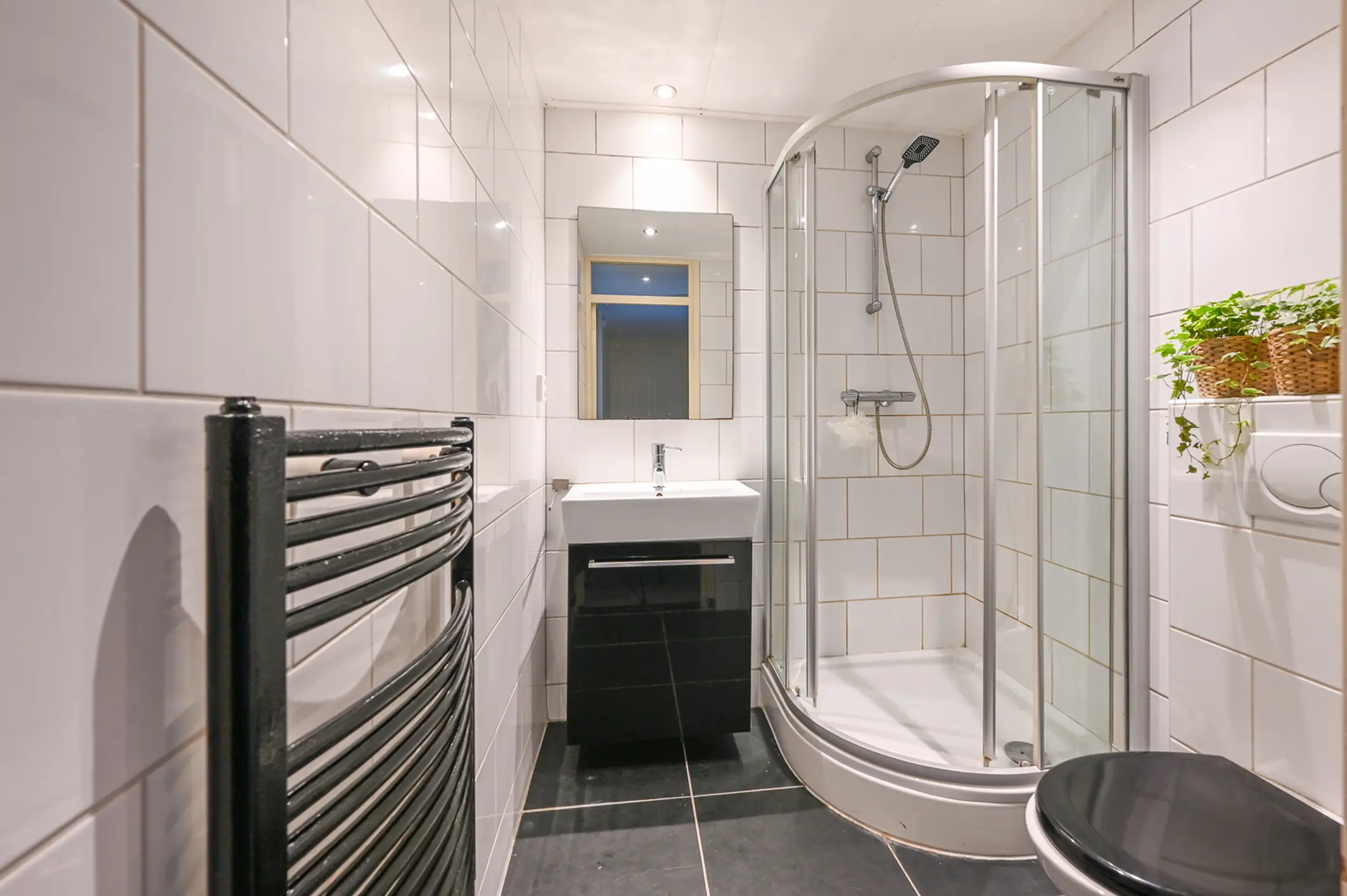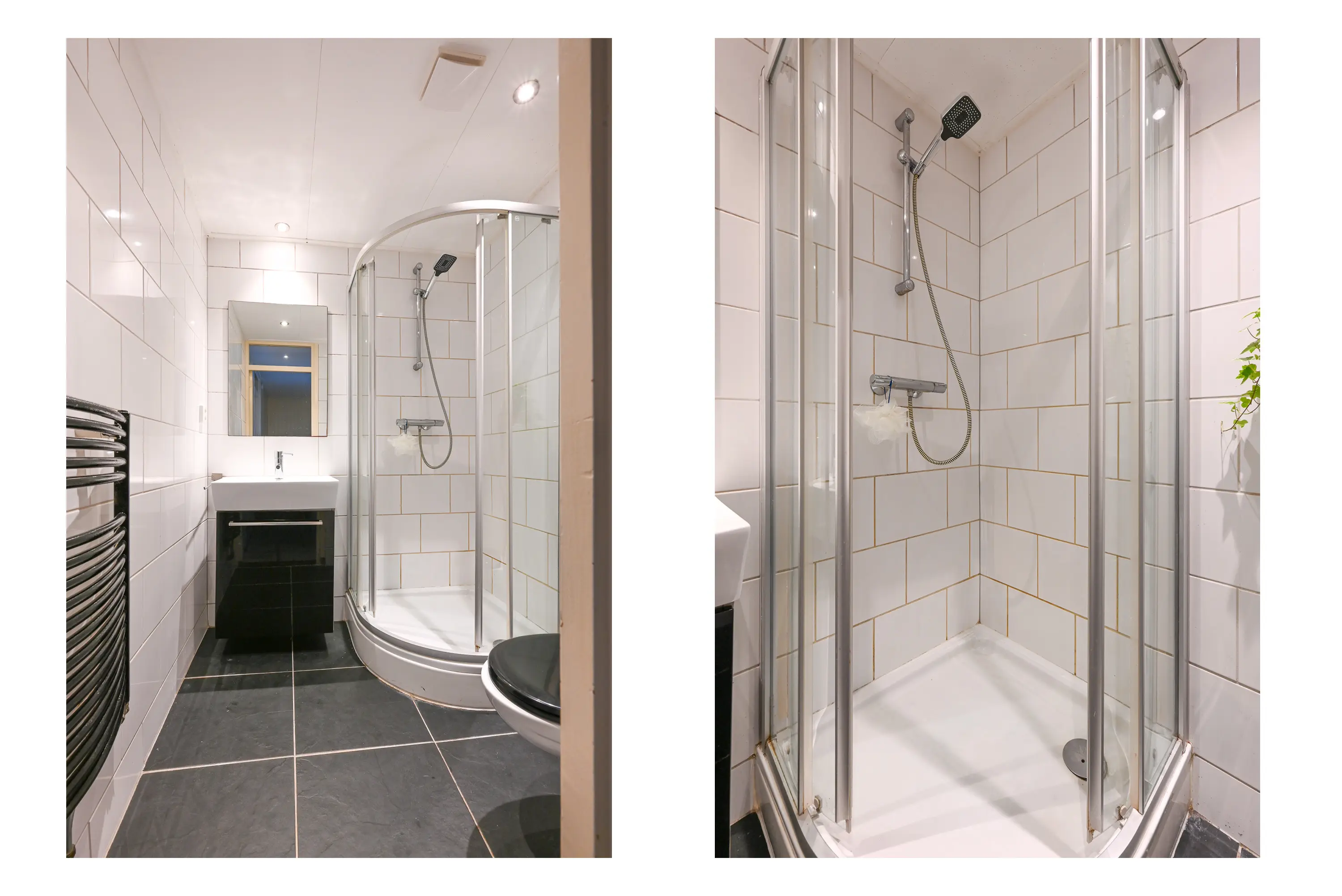 De badkamer is netjes en praktisch ingericht met een hoekdouche, wastafelmeubel en een tweede toilet.