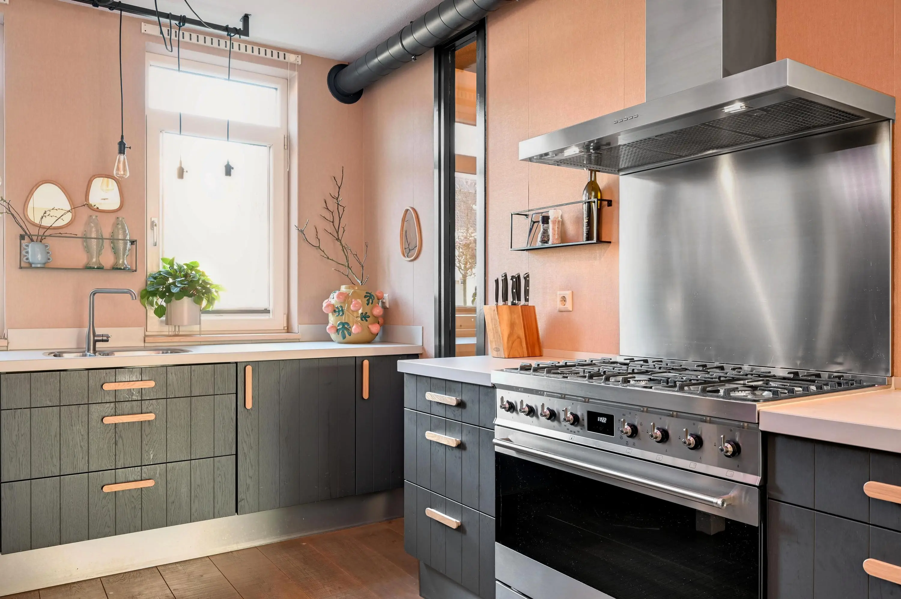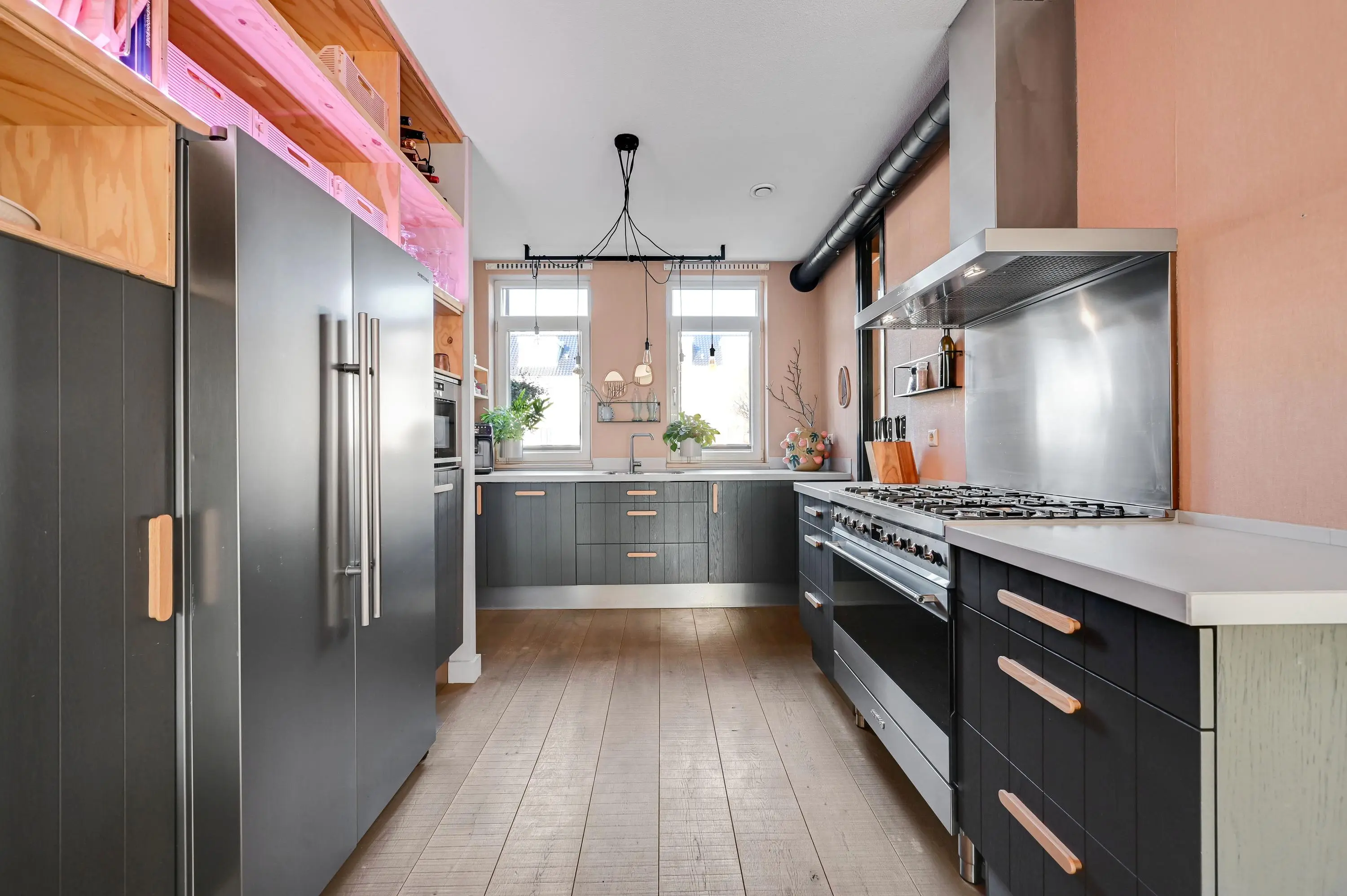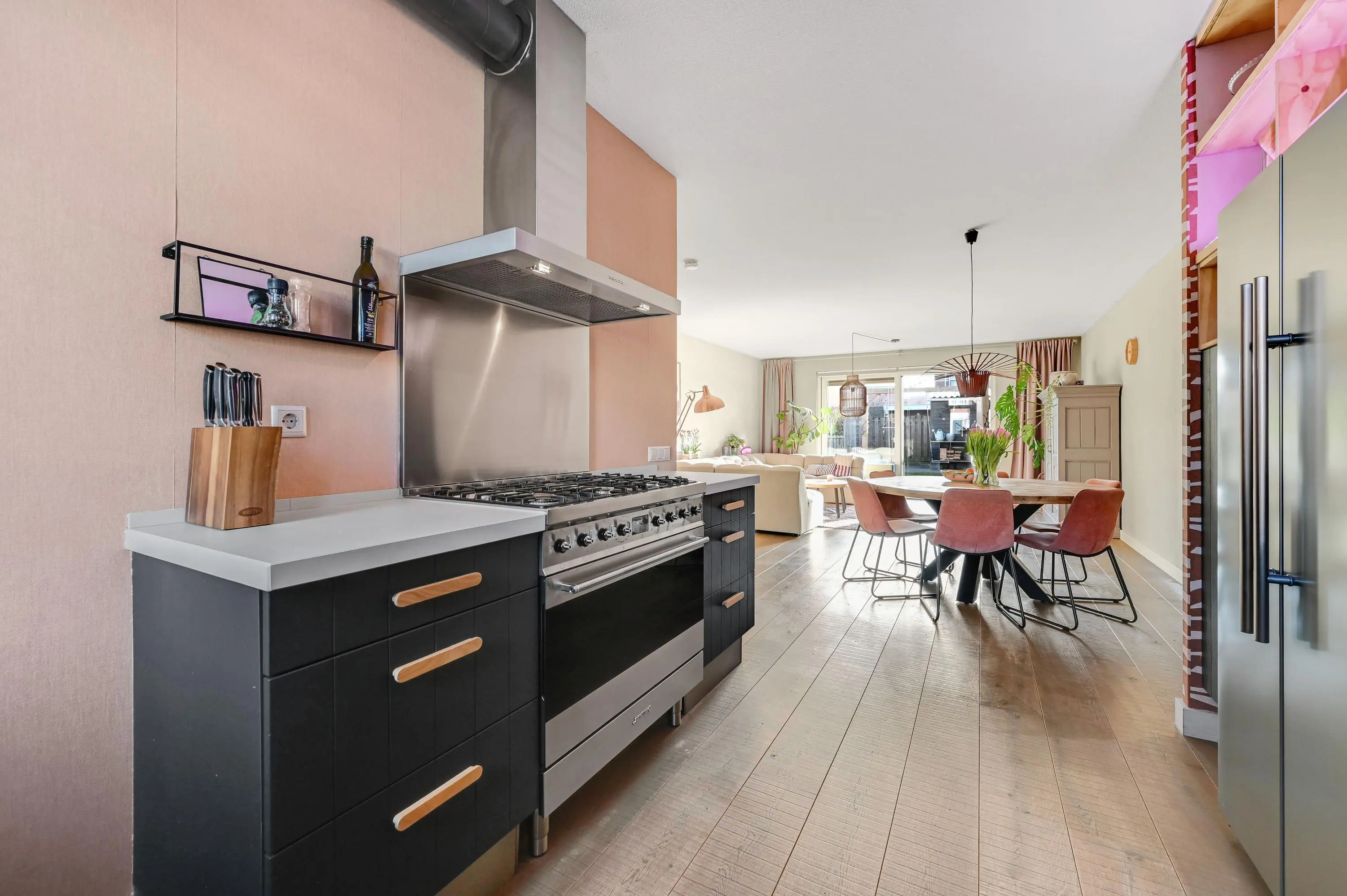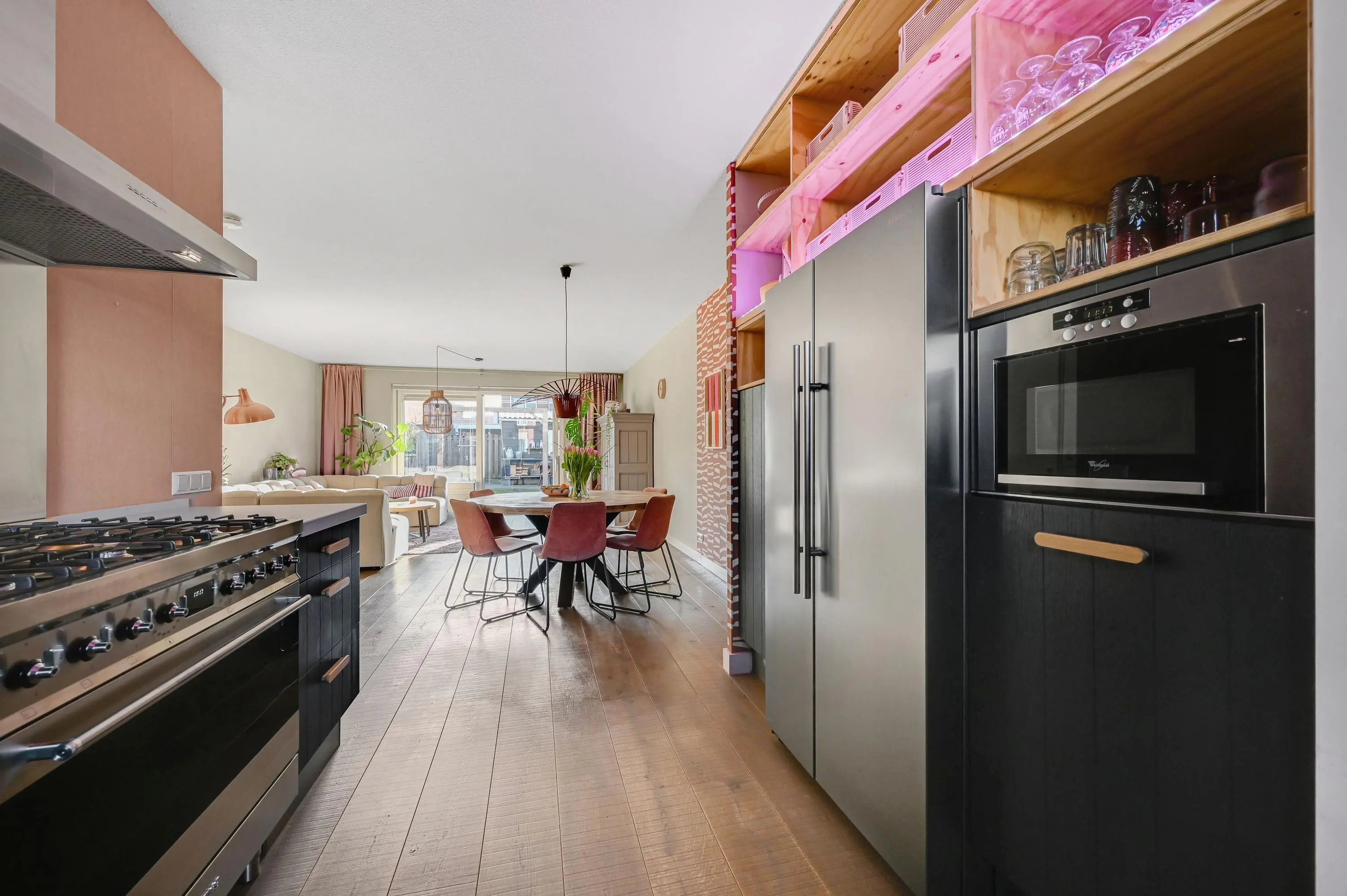 Entree met hal, meterkast, toiletruimte en trapopgang naar de eerste verdieping. Vanuit de hal bereik je de ruime uitgebouwde woonkamer, die dankzij de grote schuifpui heerlijk licht is en direct toegang biedt tot de achtertuin. Aan de voorzijde bevindt zich de moderne keuken in U-opstelling, uitgerust met diverse inbouwapparatuur: een 5-pits gasfornuis, afzuigkap, vaatwasser, combi-oven, Amerikaans koelkast met vriezer.