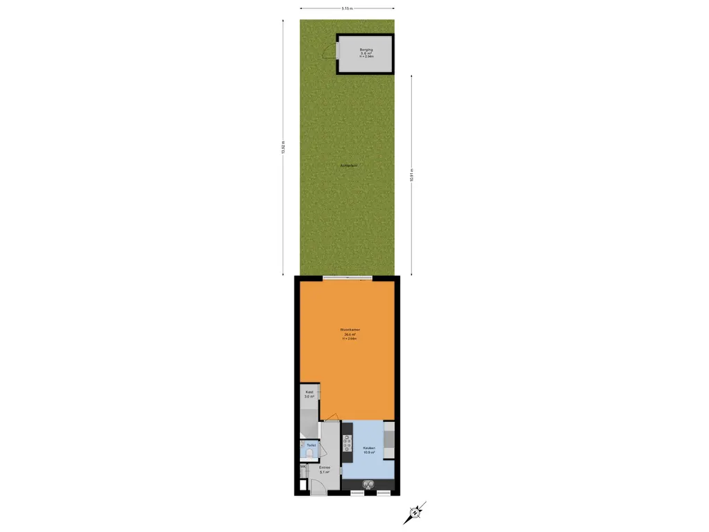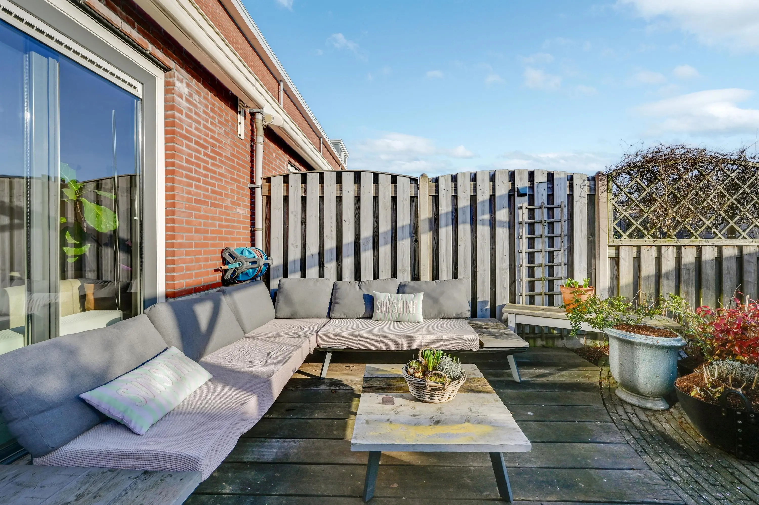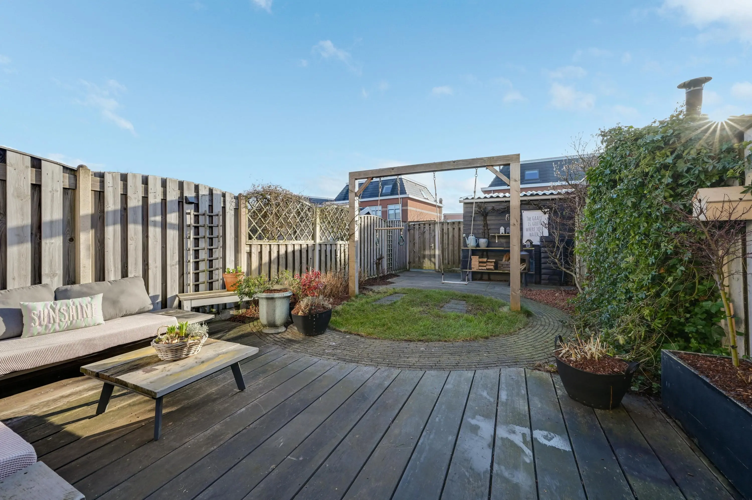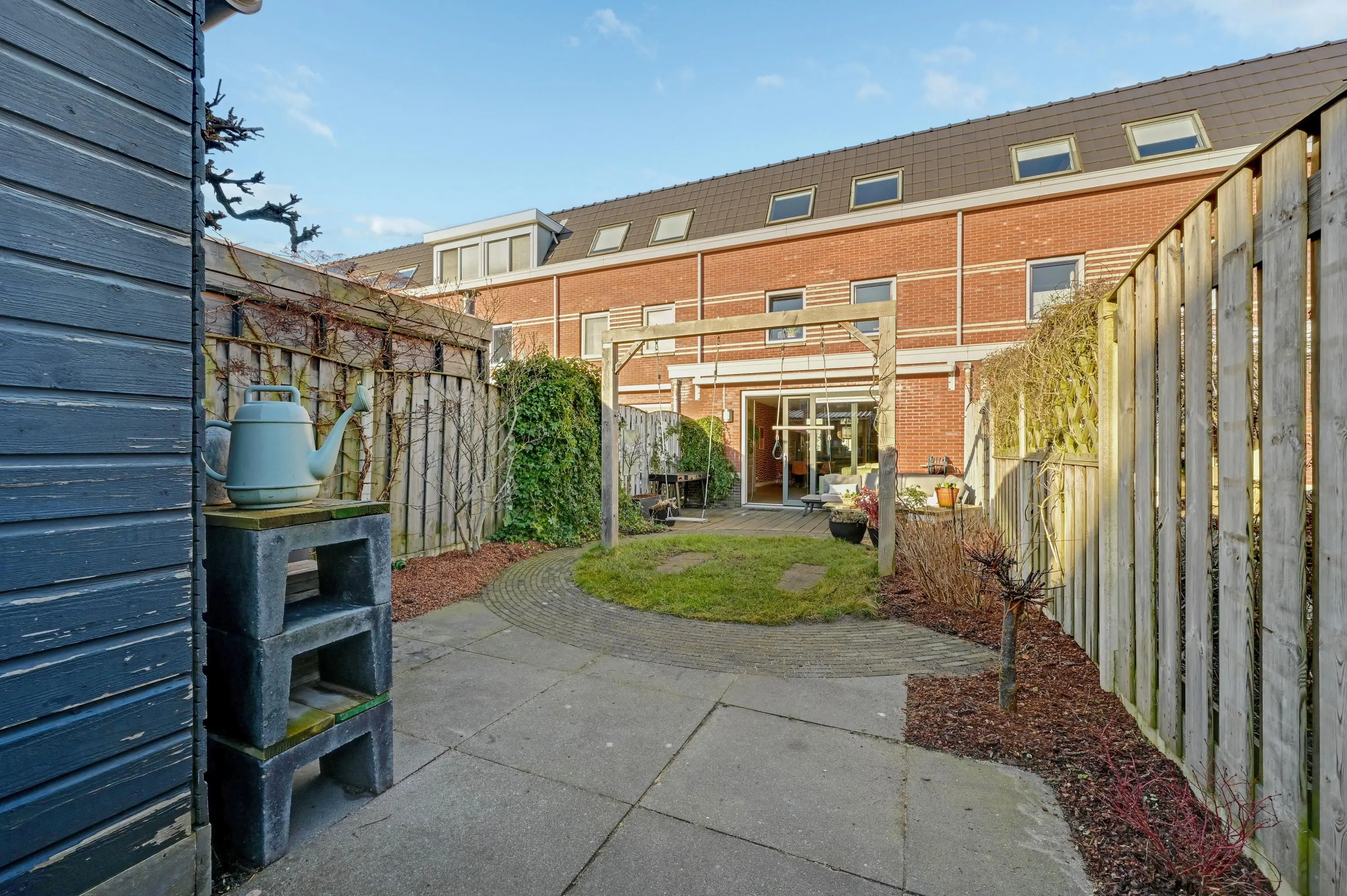 De diepe, zonnige achtertuin op het zuidoosten is een heerlijke plek om te ontspannen. Dankzij de royale afmetingen zijn meerdere zithoeken of loungeplekken mogelijk. Achterin de tuin vind je een houten berging met elektra. Ook zijn er meerdere elektrapunten en een buitenkraan aanwezig.