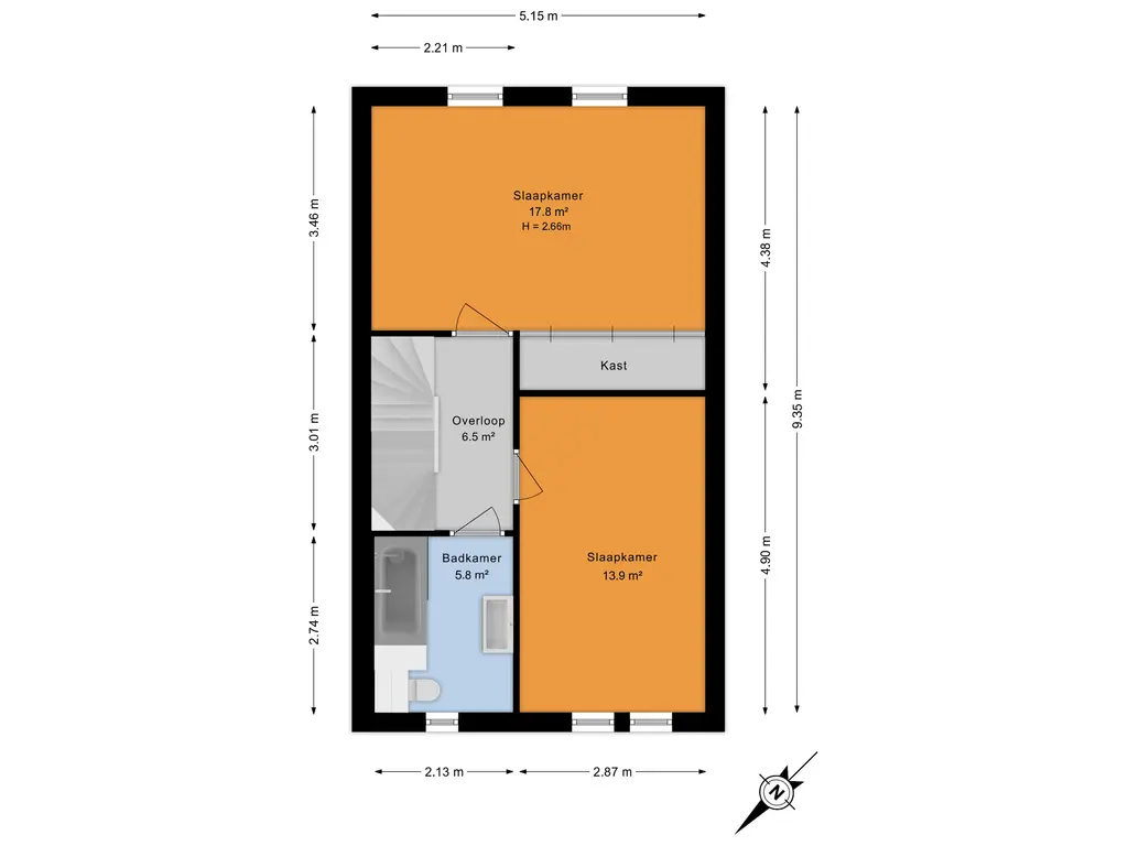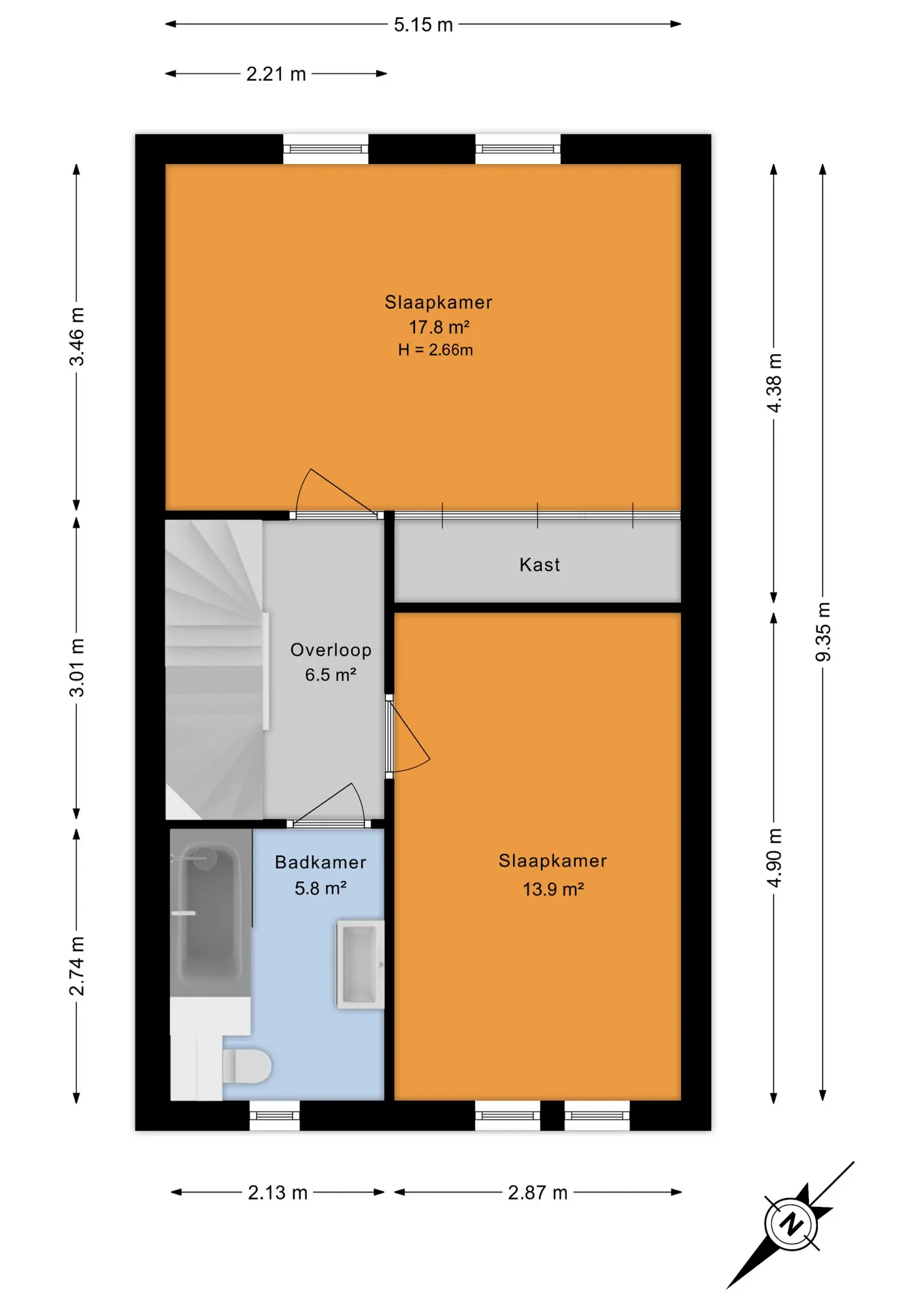 Overloop met toegang tot de vertrekken en trapopgang naar de tweede verdieping. De royale hoofdslaapkamer aan de achterzijde beschikt over een grote vaste kast en kan desgewenst eenvoudig worden opgesplitst in twee kamers. Aan de voorzijde een tweede slaapkamer en de compleet betegelde badkamer, voorzien van een inloopdouche, tweede toilet en wastafelmeubel.