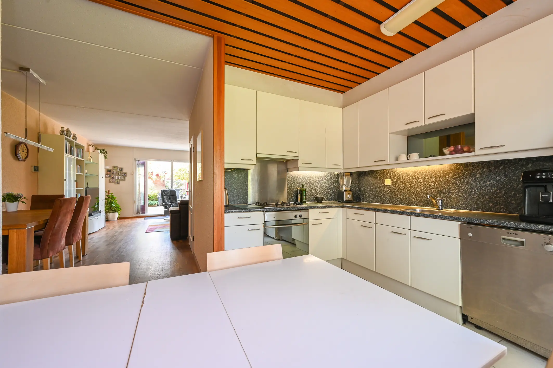 De keuken in L-opstelling is uitgerust met diverse inbouwapparatuur: hete lucht oven, 4 pits gas kookplaat en vaatwasser (losstaand: koelkastvriezer).