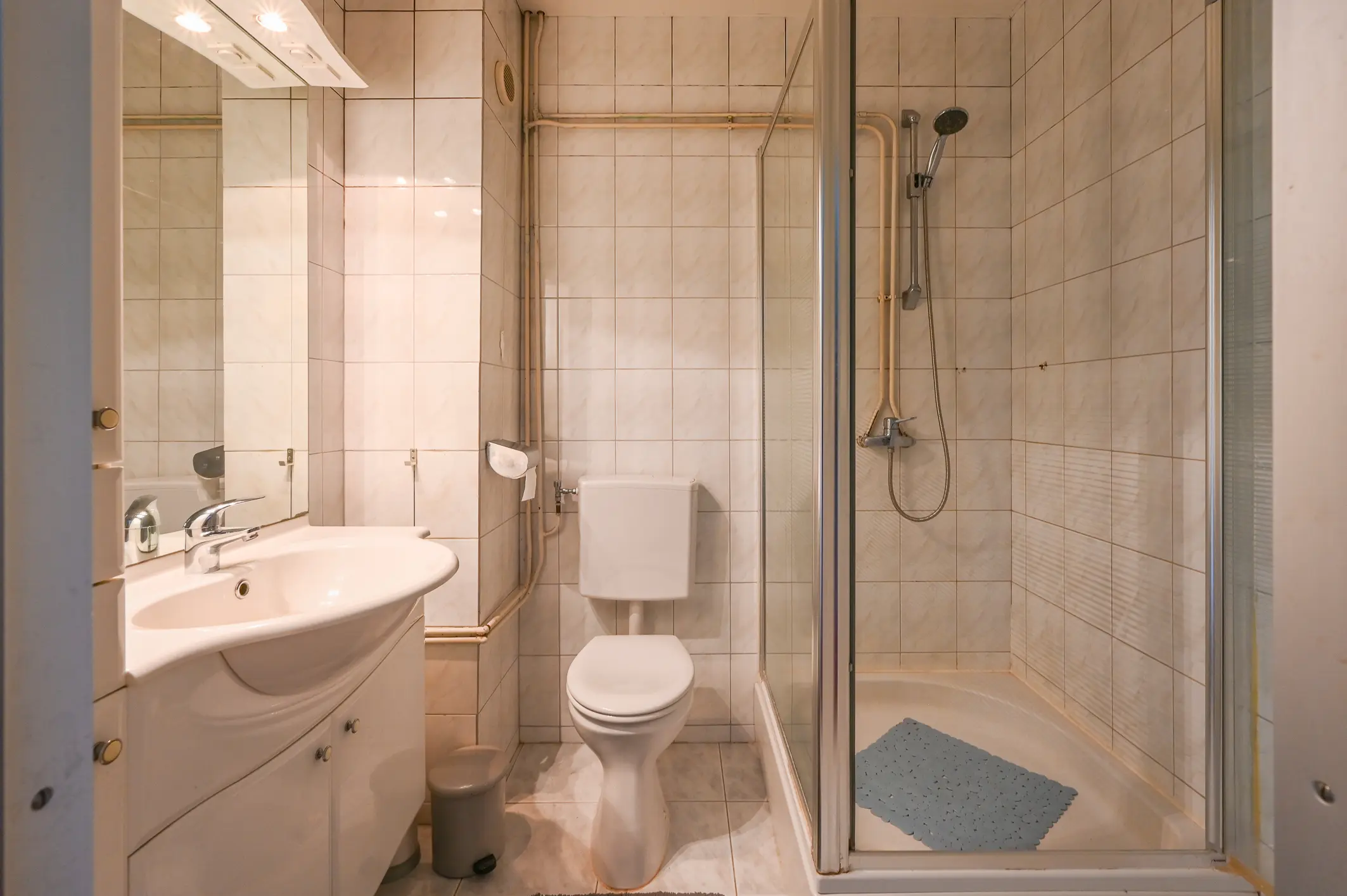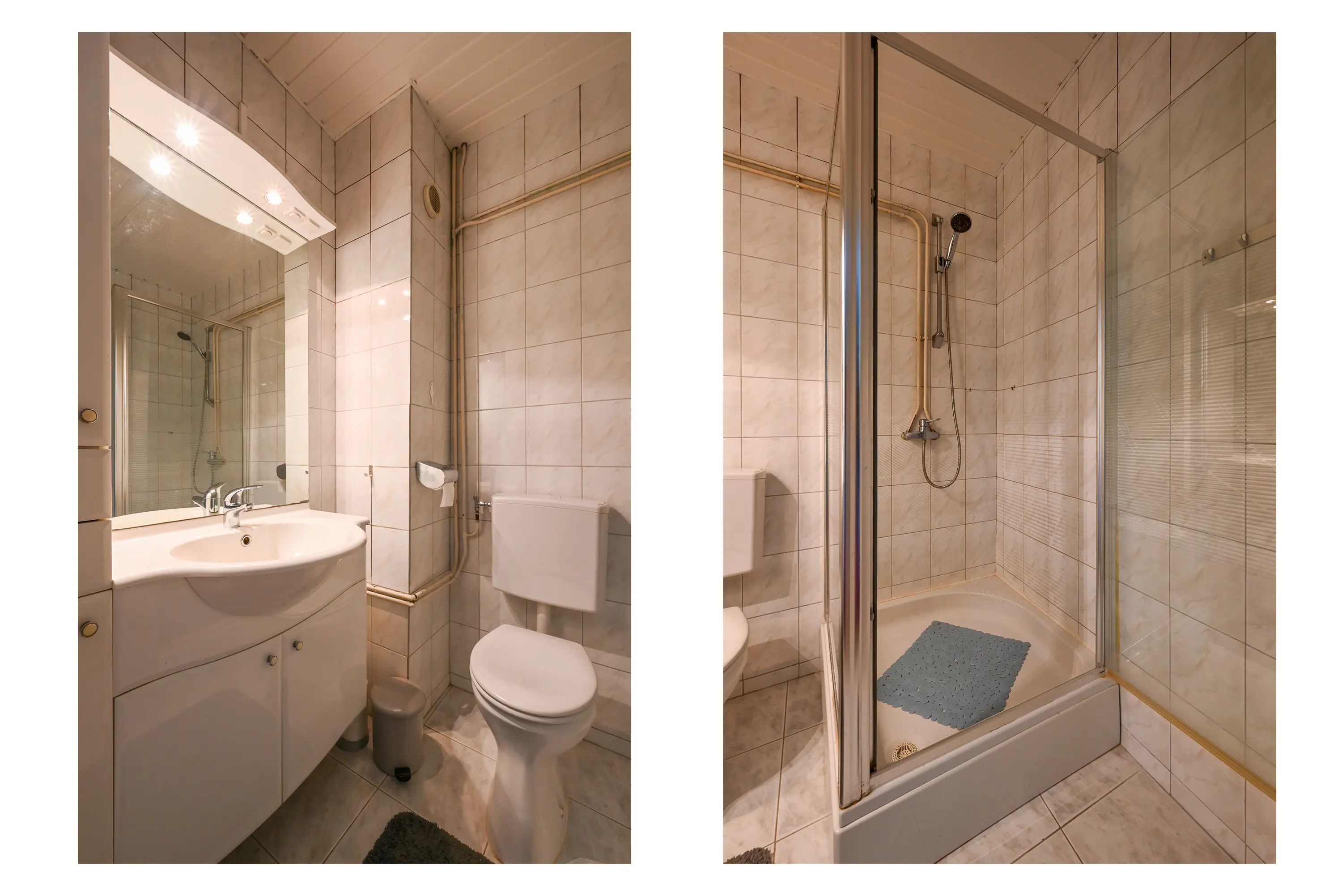 De badkamer is voorzien van een douchecabine, een tweede toilet en een wastafel.