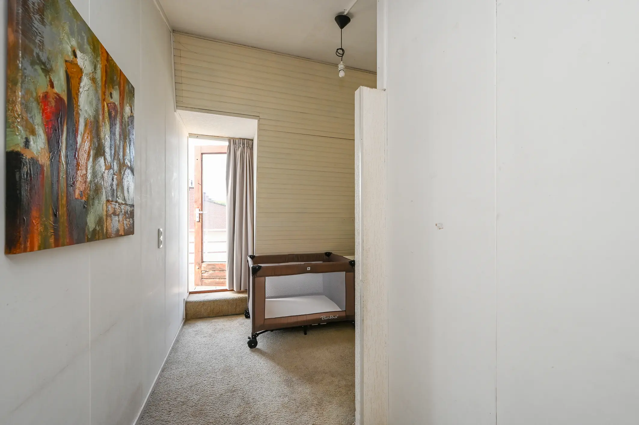 Op de tweede verdieping is onder het aflopende dak (van 1.75m naar 1.10m), nog ca. 13m2 opbergruimte.
