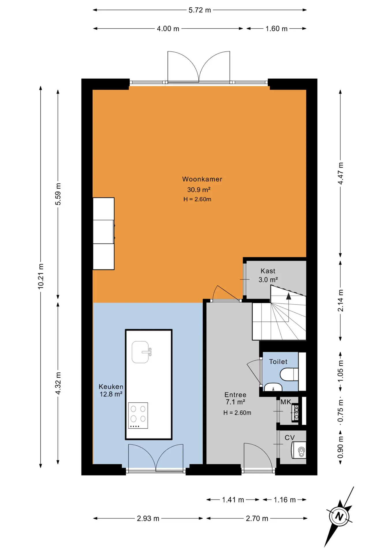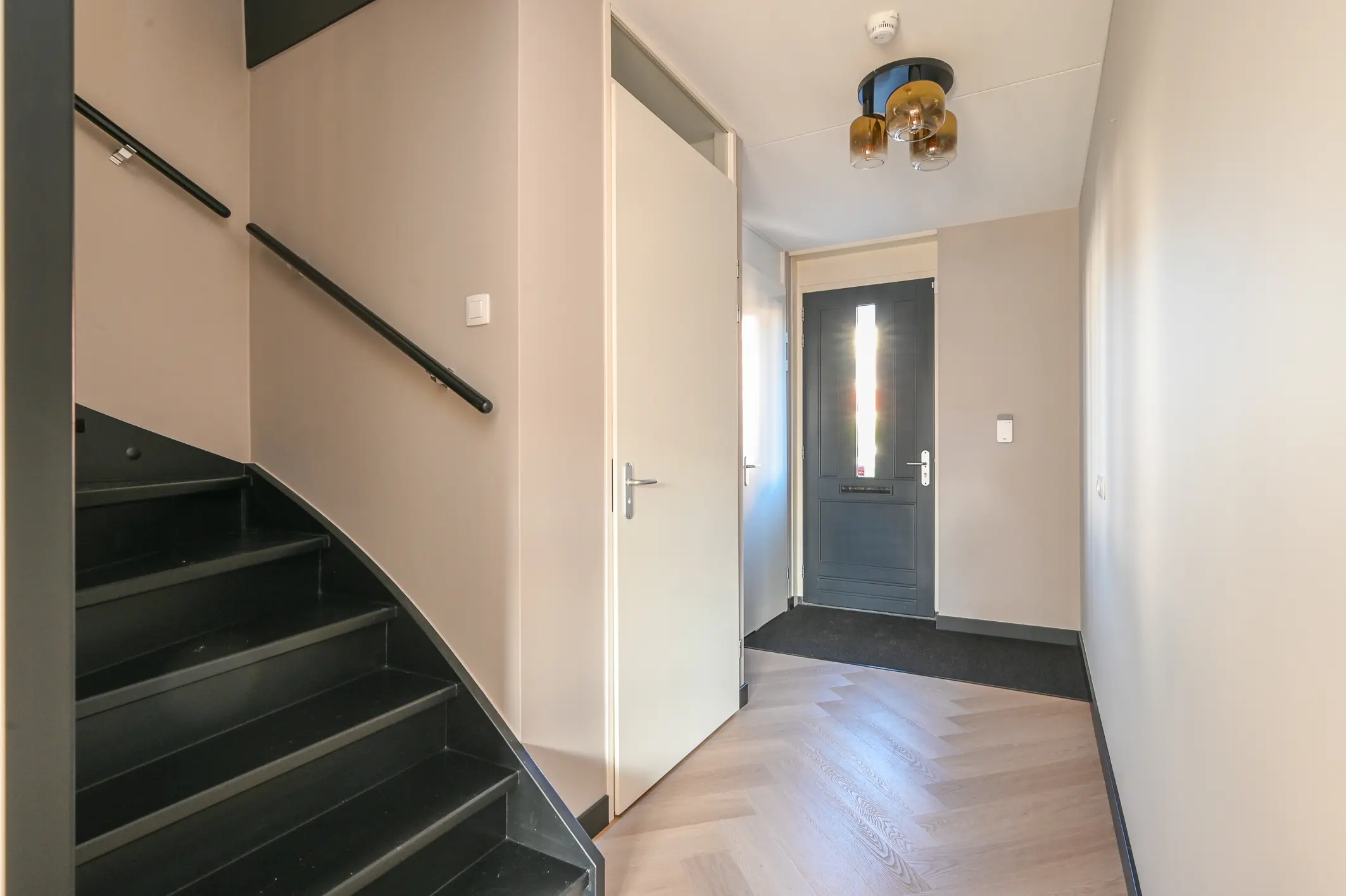 Via de voortuin komt u binnen in de woning. Bij binnenkomst bevindt u zich in een ruime hal met een meterkast en een praktische kast waarin het boilervat is geplaatst. De vaste trap leidt u naar de eerste verdieping, maar eerst lopen we door naar de ruime woonkamer.