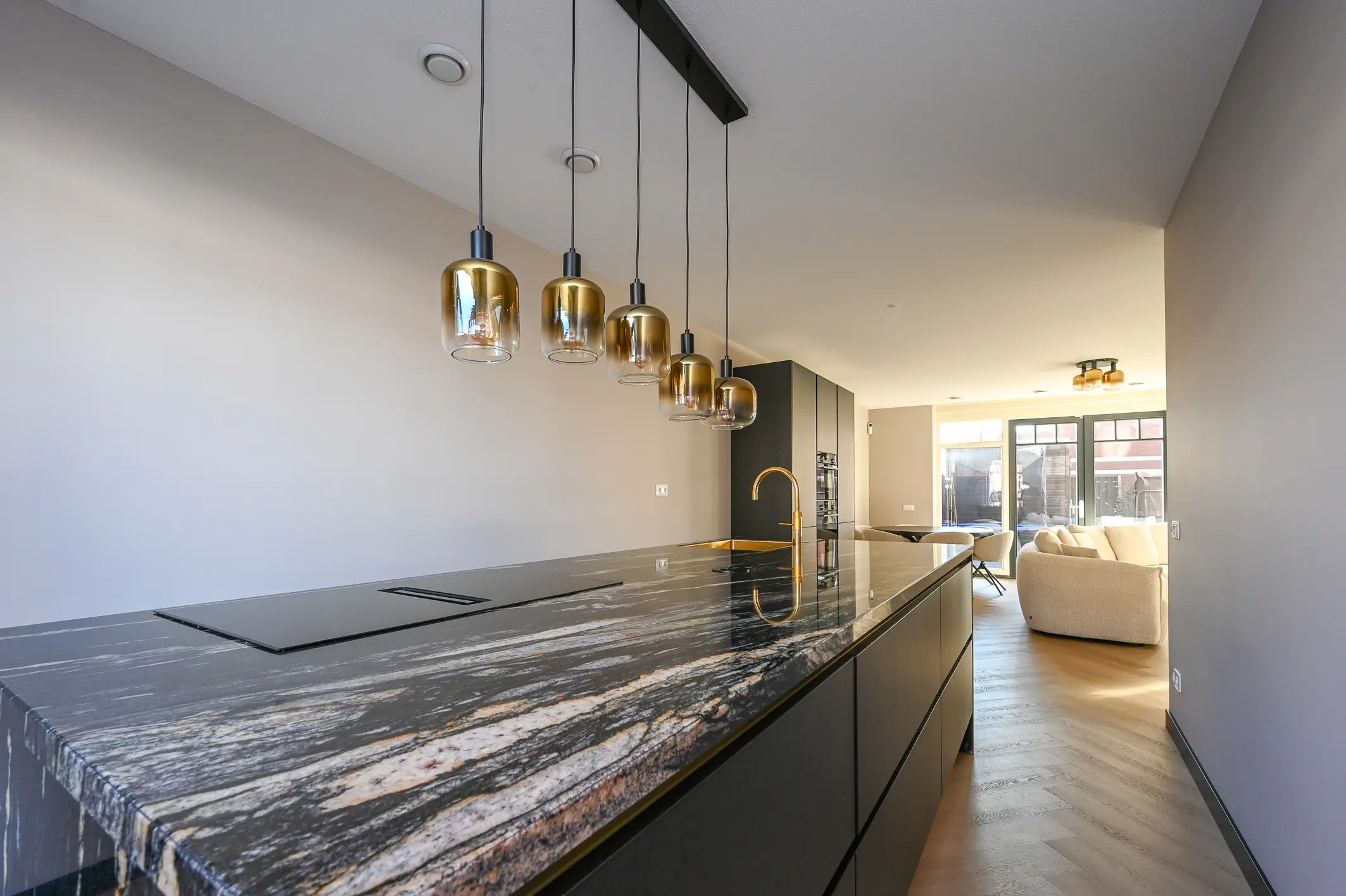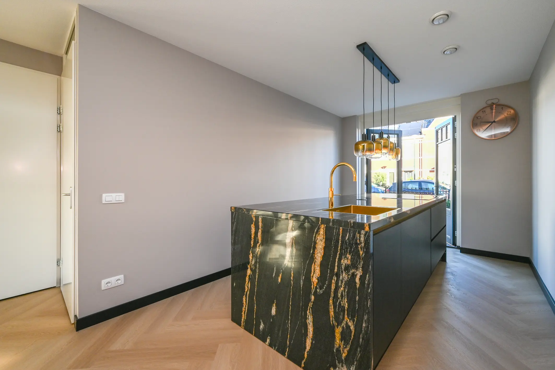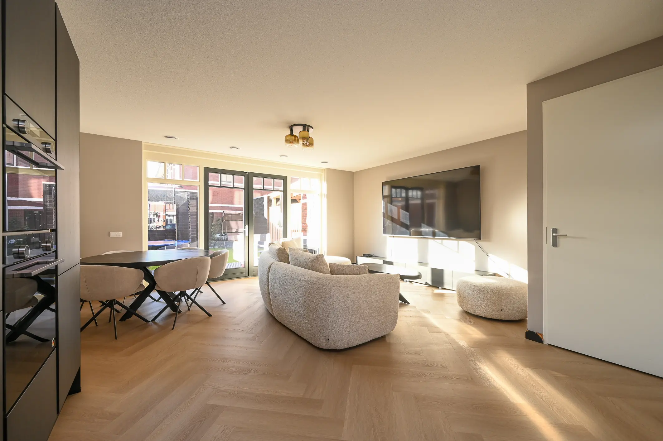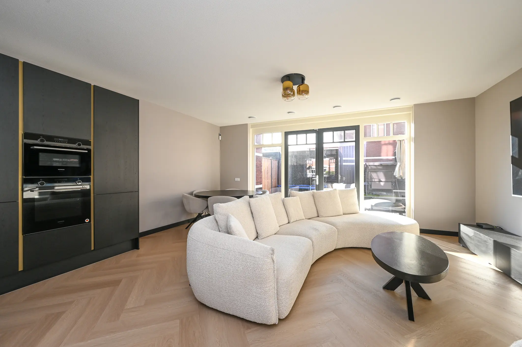 De lichte woonkamer biedt veel ruimte voor een gezellige zithoek en is voorzien van openslaande deuren naar de tuin, waardoor er een mooie verbinding is met de buitenruimte. De woonkamer is direct verbonden met de open eilandkeuken aan de voorzijde van de woning. Ook de keuken heeft openslaande deuren naar de voortuin, wat zorgt voor een heerlijke lichtinval en de mogelijkheid om buiten te dineren op mooie dagen. De luxe keuken (2025) is volledig uitgerust met moderne apparatuur: een ingebouwde koelkast, vaatwasser, Qooker, spoelbak, inductiekookplaat, combimagnetron, oven en een prachtig granieten aanrechtblad. De keuken is niet alleen praktisch, maar ook een echte blikvanger in het huis.