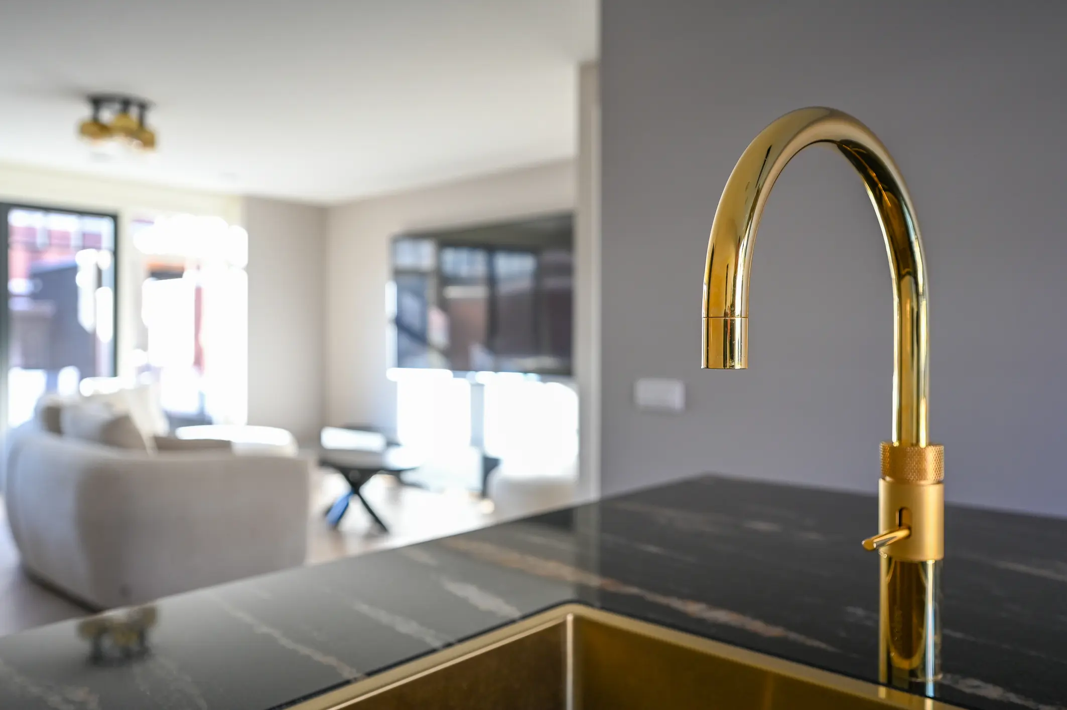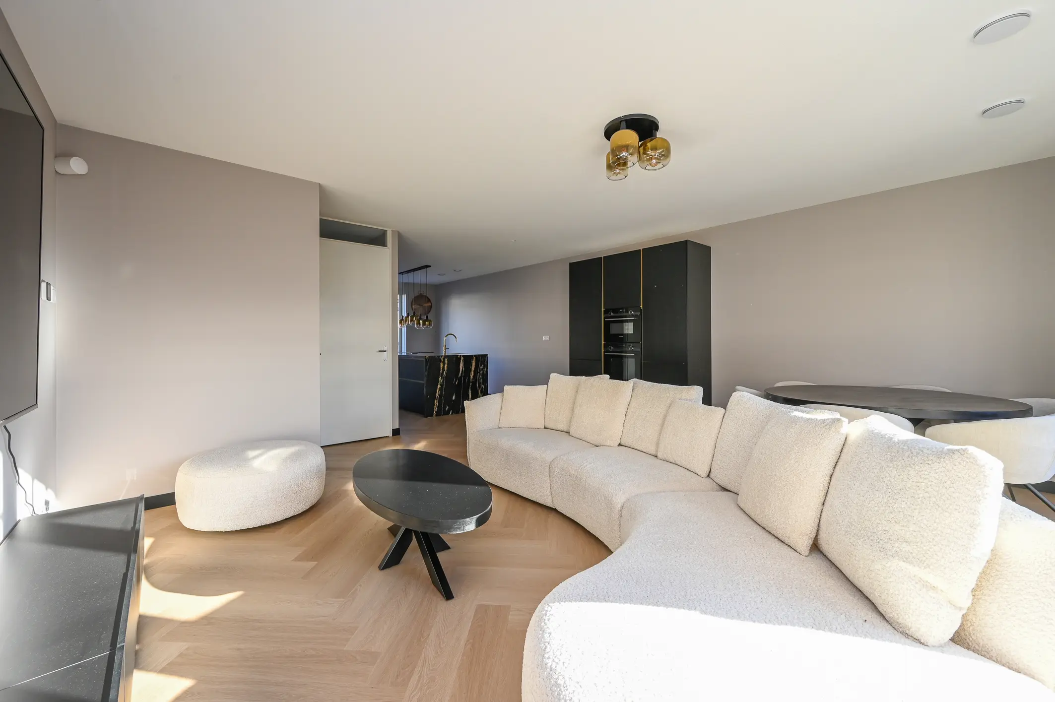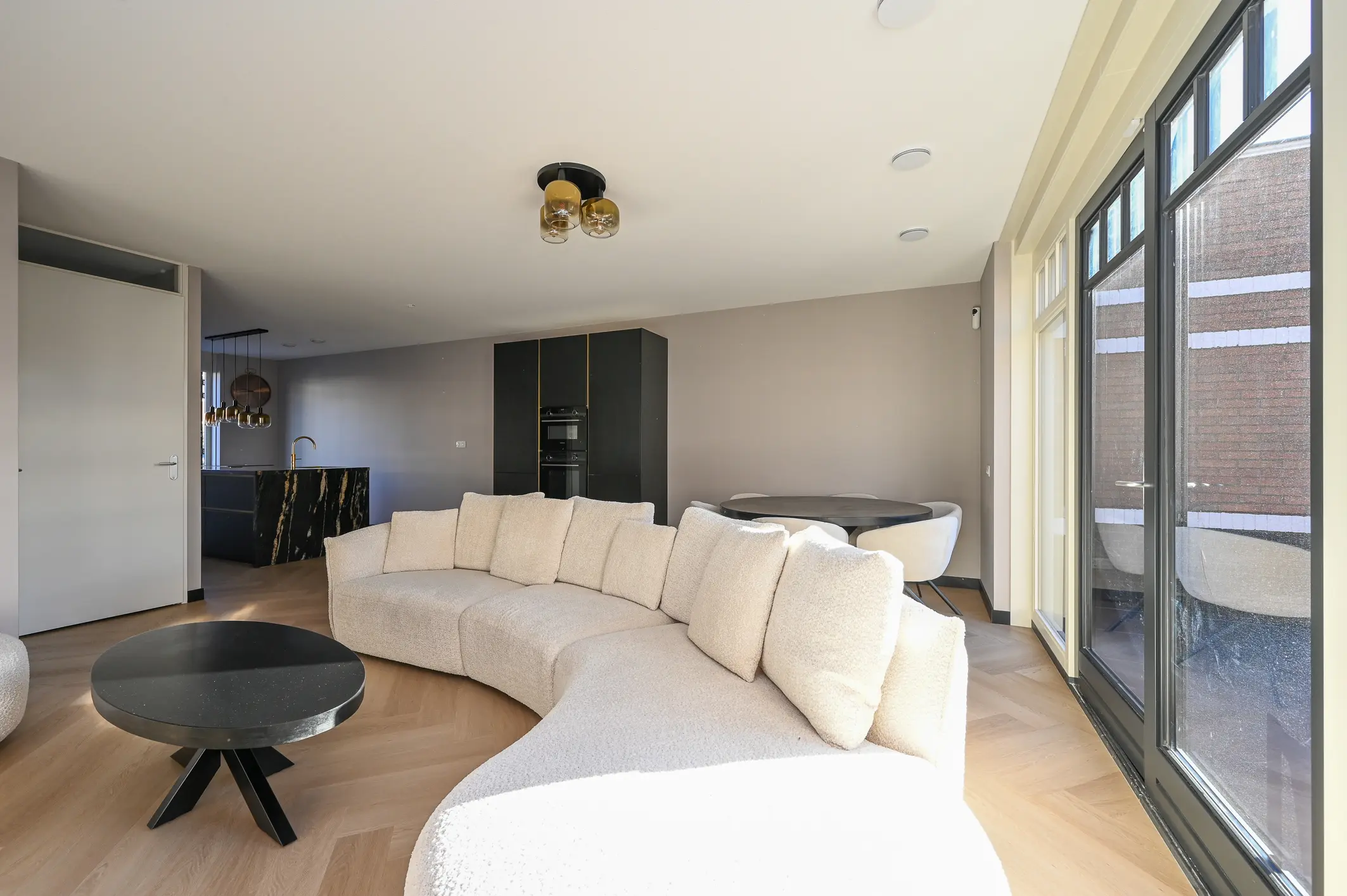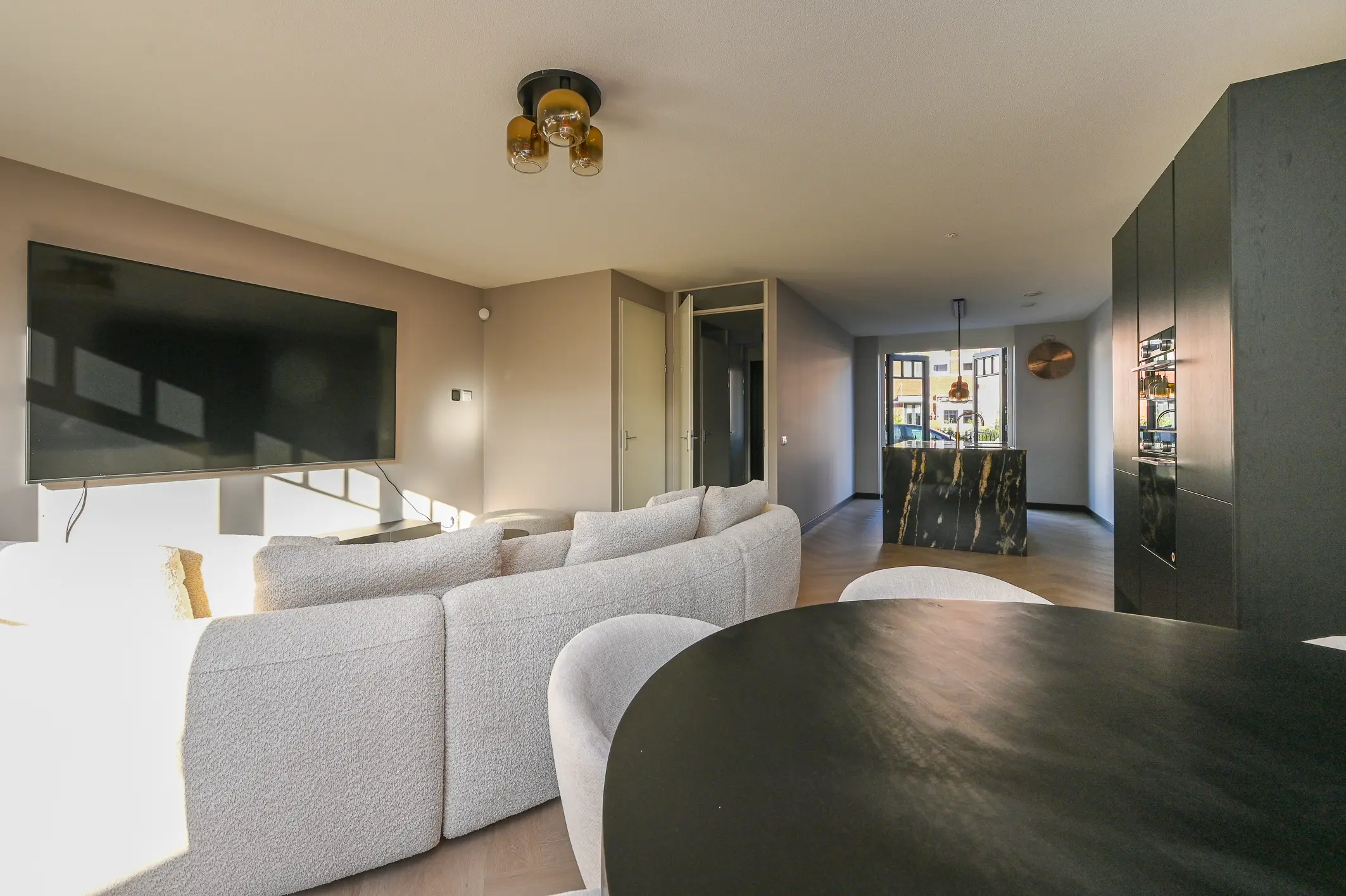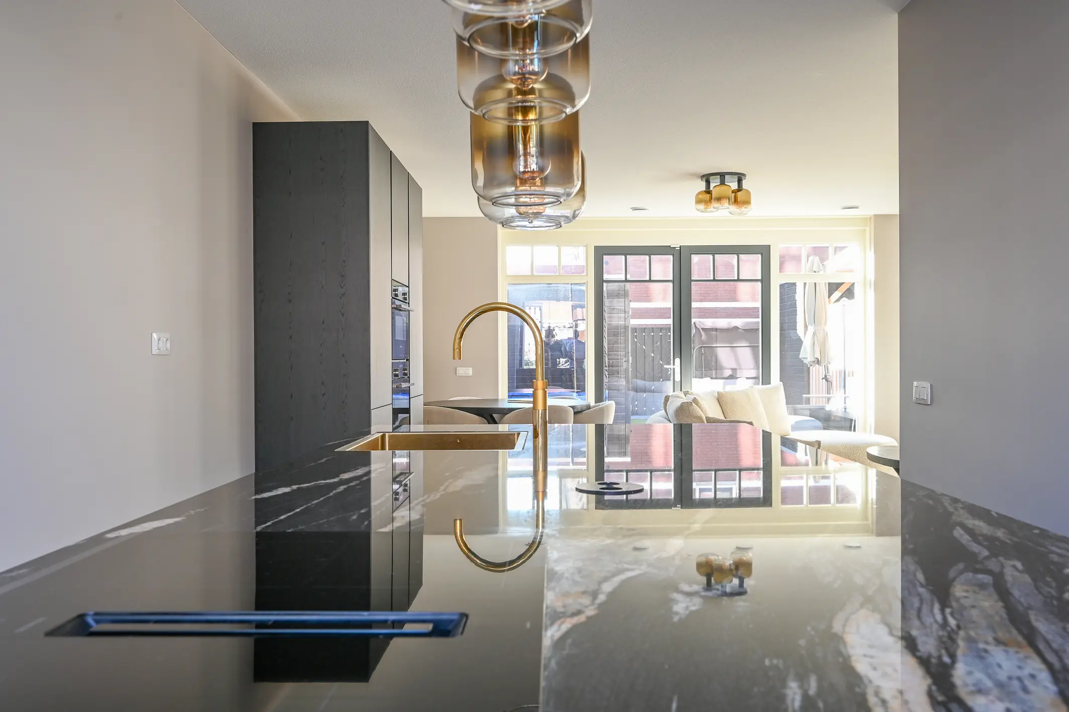 De lichte woonkamer biedt veel ruimte voor een gezellige zithoek en is voorzien van openslaande deuren naar de tuin, waardoor er een mooie verbinding is met de buitenruimte. De woonkamer is direct verbonden met de open eilandkeuken aan de voorzijde van de woning. Ook de keuken heeft openslaande deuren naar de voortuin, wat zorgt voor een heerlijke lichtinval en de mogelijkheid om buiten te dineren op mooie dagen. De luxe keuken (2025) is volledig uitgerust met moderne apparatuur: een ingebouwde koelkast, vaatwasser, Qooker, spoelbak, inductiekookplaat, combimagnetron, oven en een prachtig granieten aanrechtblad. De keuken is niet alleen praktisch, maar ook een echte blikvanger in het huis.