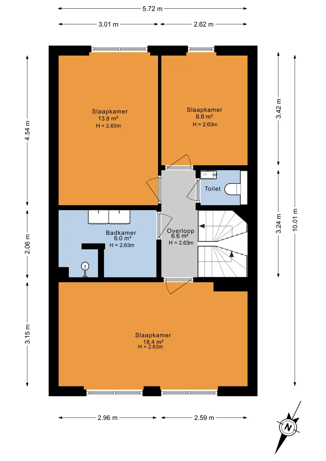 Op de eerste verdieping komt u via de overloop die toegang geeft tot drie slaapkamers. Twee ruime slaapkamers bevinden zich aan de achterzijde van de woning, beide voorzien van voldoende ruimte voor een tweepersoonsbed en kasten. Aan de voorzijde van de woning vindt u de derde nog ruimere (ouder)slaapkamer.
