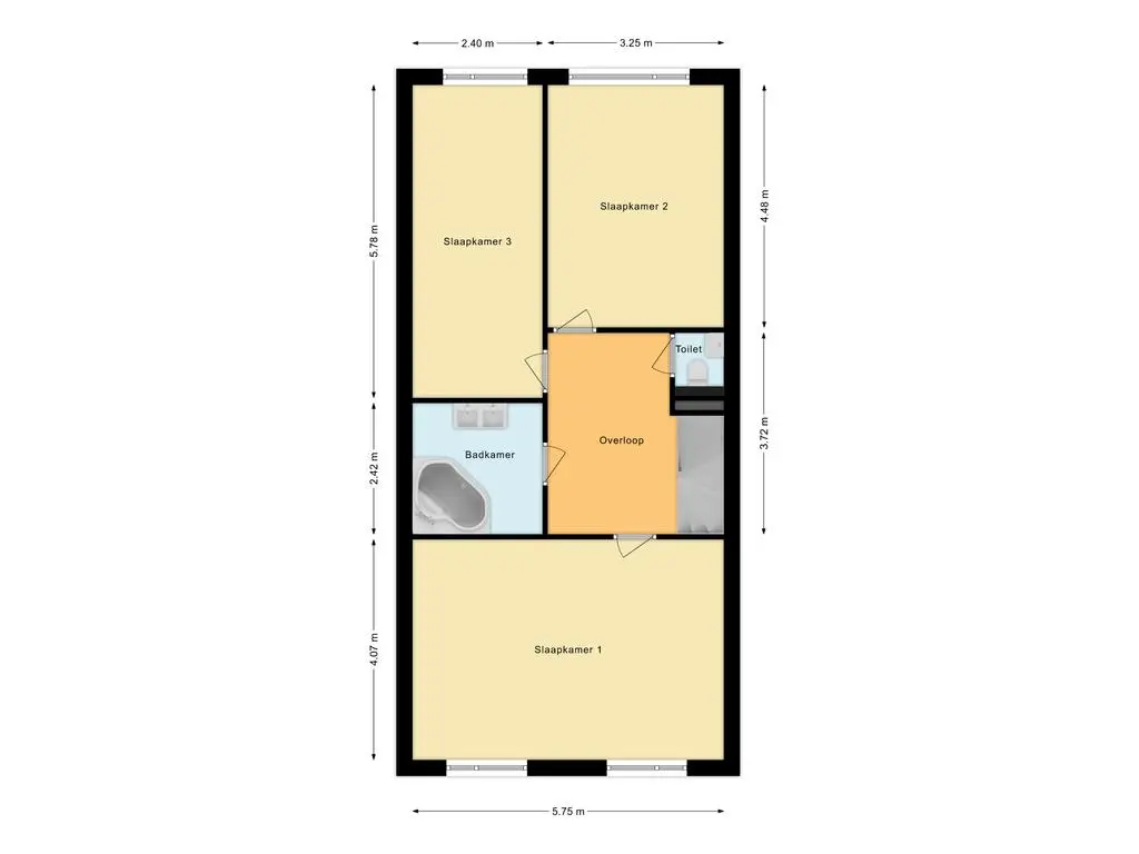 Een brede trap leidt naar de eerste verdieping, waar een ruime overloop toegang biedt tot de verschillende vertrekken. Aan de voorzijde van het huis bevindt zich een royale slaapkamer met voldoende ruimte voor een groot bed en kasten. Aan de achterzijde van de woning bevinden zich twee slaapkamers, die beide uitzicht bieden op de tuin en veel natuurlijk licht ontvangen. De badkamer is uitgerust met een ligbad/douche combinatie en een dubbele wastafel.