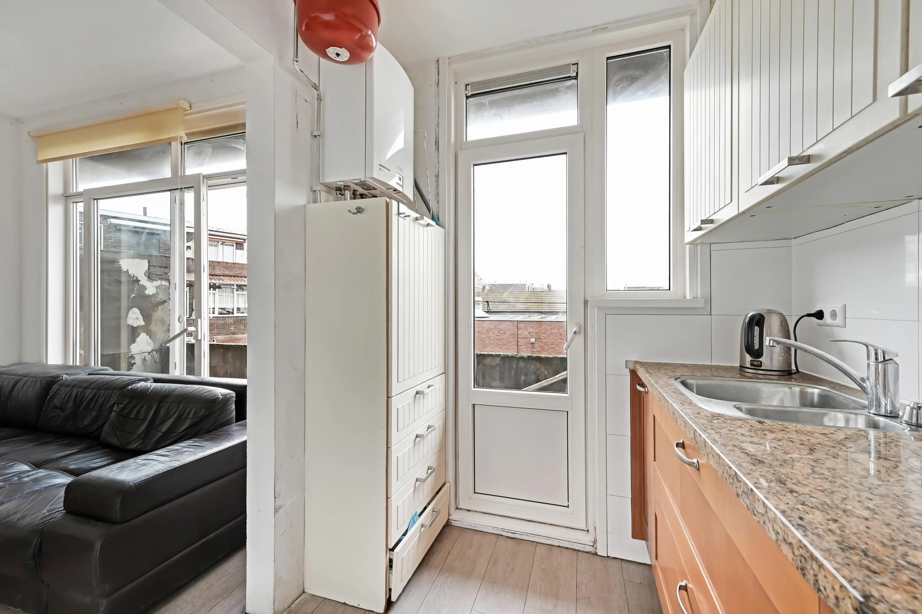 De entree van het pand wordt gedeeld met slechts twee andere appartementen, wat zorgt voor een kleinschalig en rustig geheel.