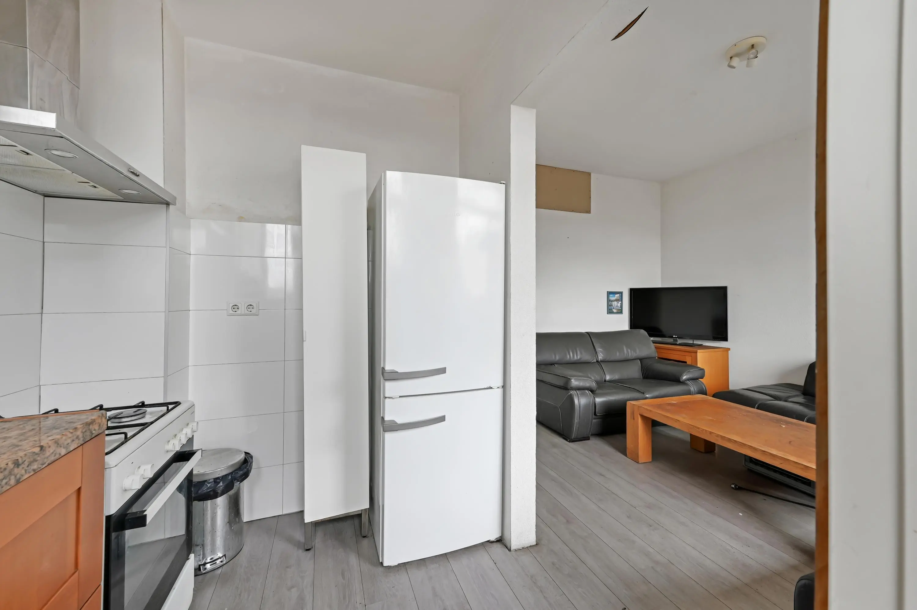 Via de entree kom je in de hal die toegang biedt tot de verschillende vertrekken op deze verdieping. Aan de achterzijde bevindt zich de woonkamer met een eenvoudige keuken in L-opstelling. Vanuit deze ruimte is er toegang tot het eerste balkon aan de achterzijde.