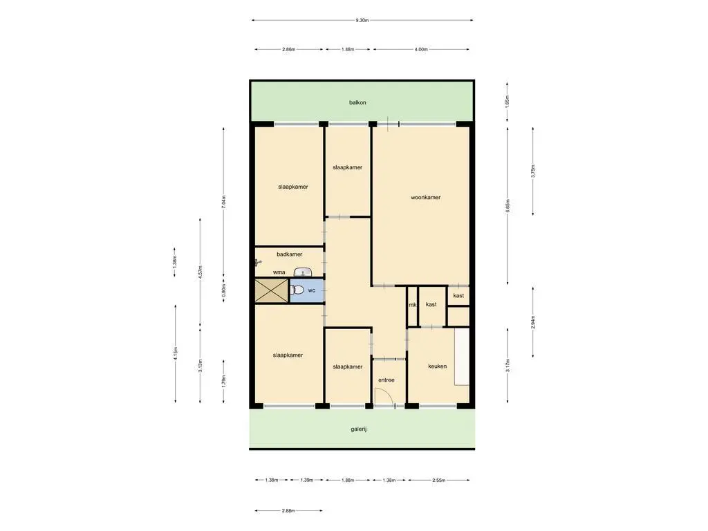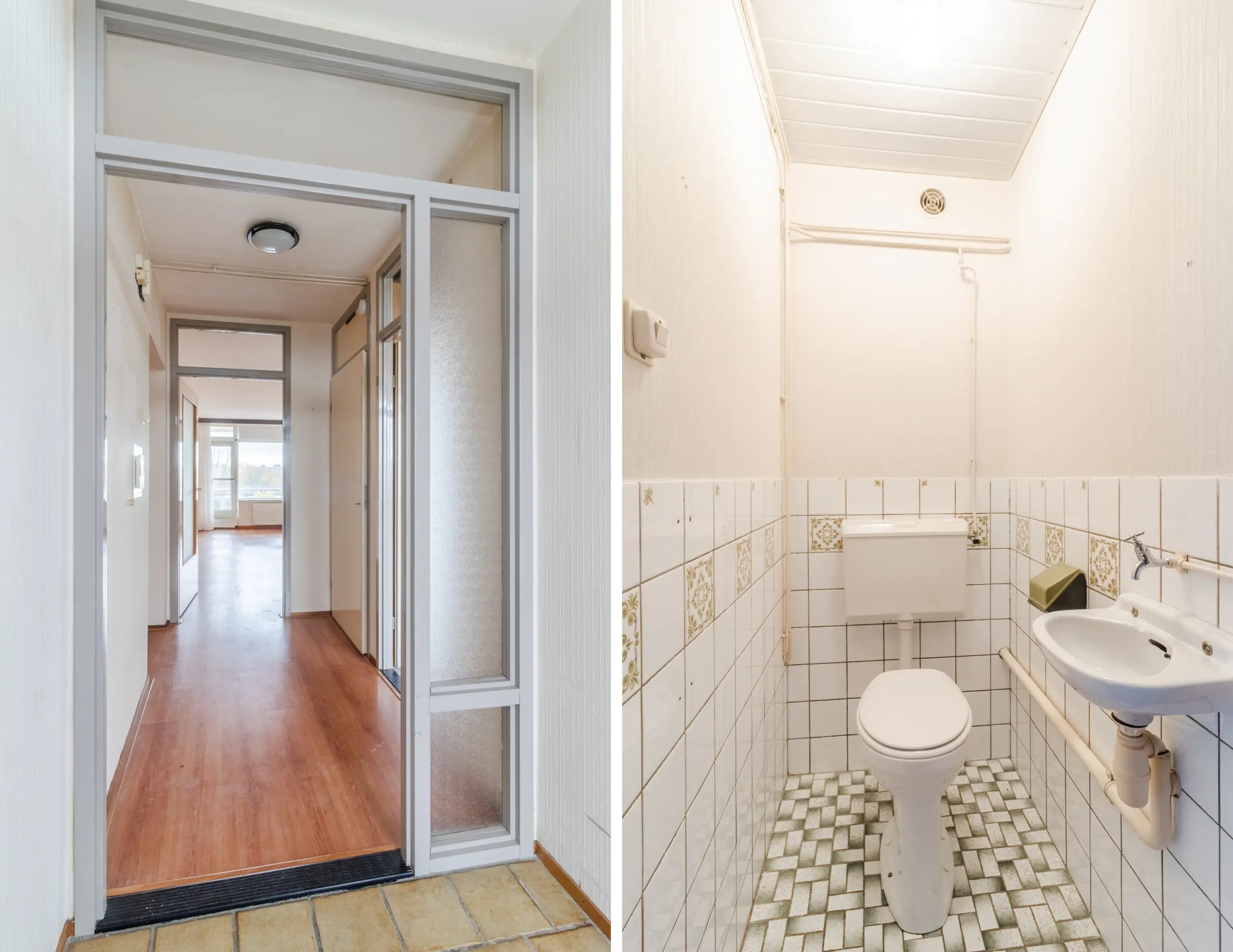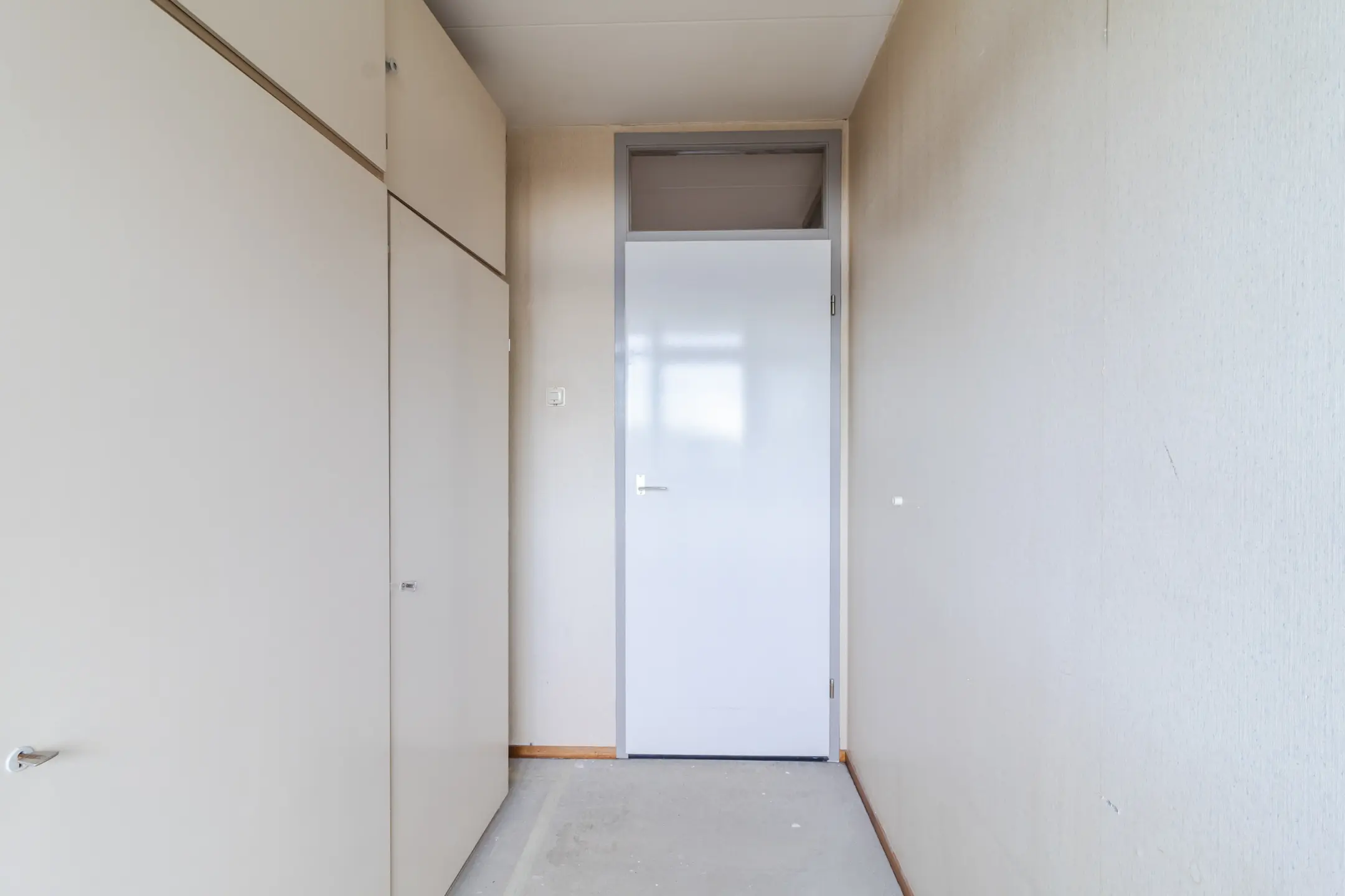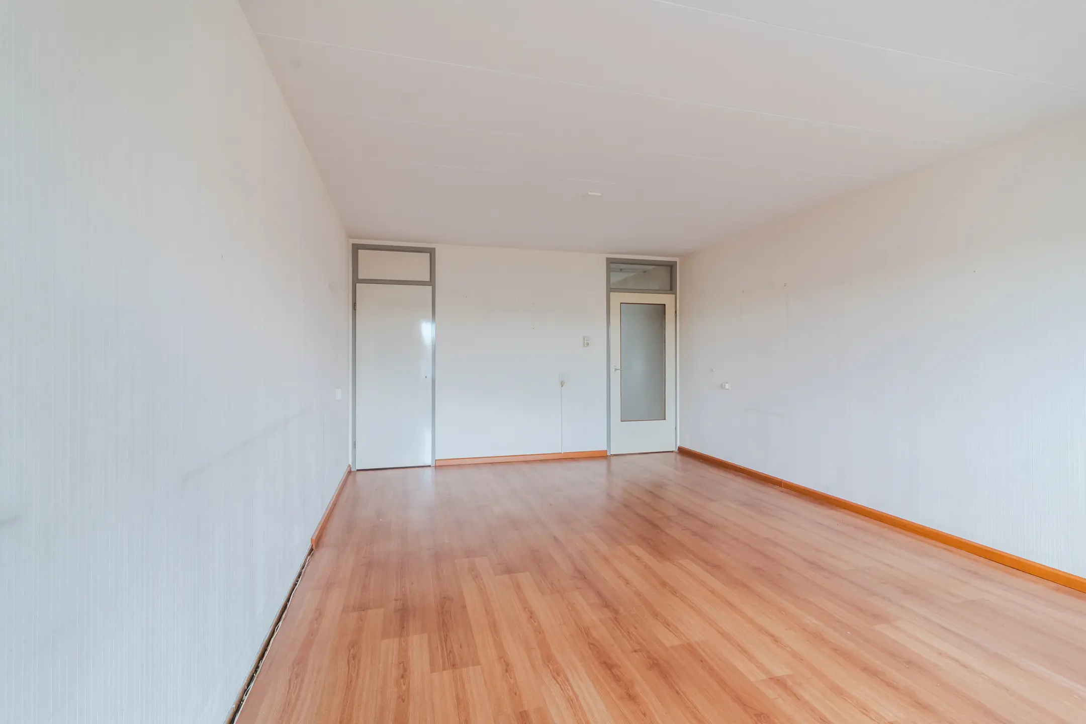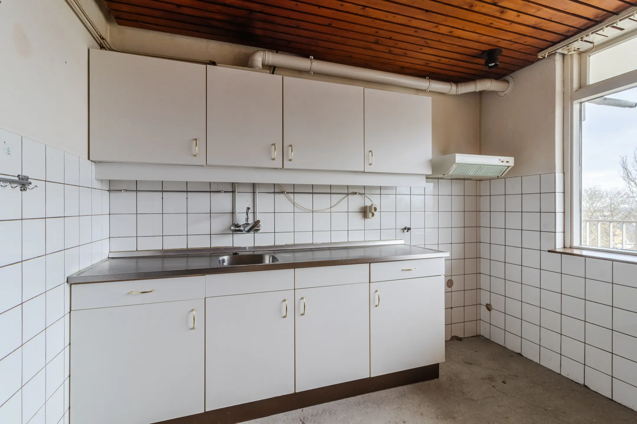 Voorportaal en hal met meterkast en separaat toilet. Ruime woonkamer van circa 25 m² met bergkast en toegang tot het balkon. Dichte keuken met eenvoudig keukenblok, geiser en provisiekast. Badkamer met douche, wastafel en wasmachineaansluiting. Vier royale slaapkamers.